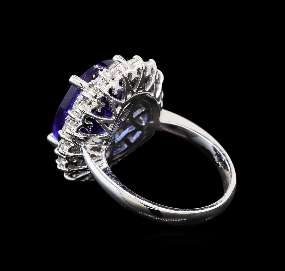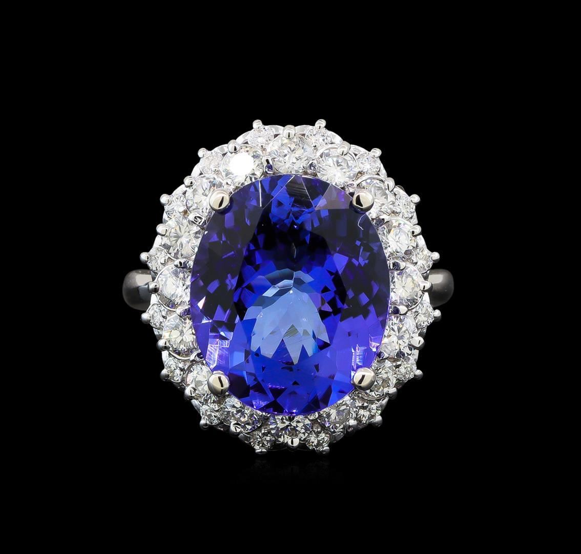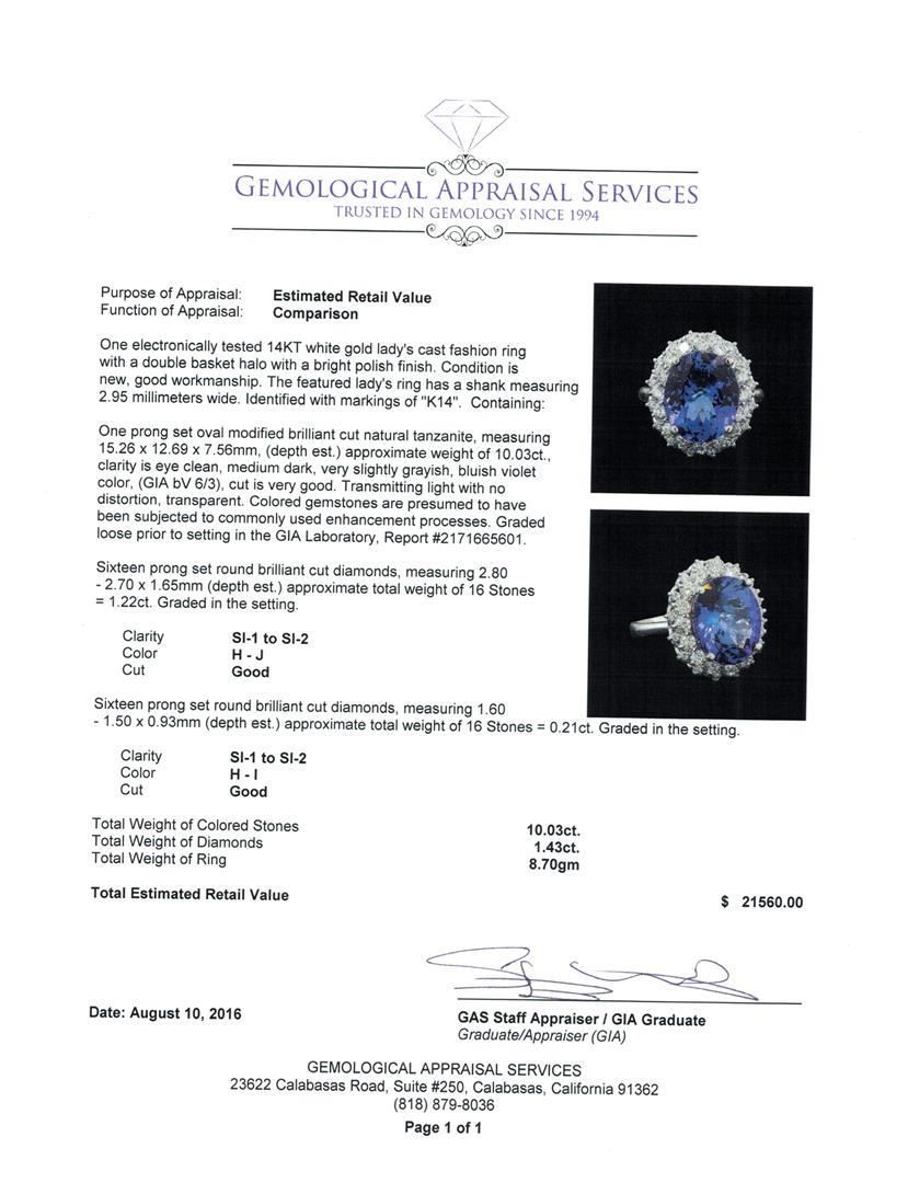 One electronically tested 14KT white gold lady's cast fashion ring with a double basket halo with a bright polish finish. The featured lady's ring has a shank measuring 2.95 millimeters wide. Identified with markings of 'K14'. Condition is new, good workmanship. Containing: One prong set oval modified brilliant cut natural tanzanite, measuring 15.26 x 12.69 x 7.56mm, (depth est.) approximate weight of 10.03ct., clarity is eye clean, medium dark, very slightly grayish, bluish violet color, (GIA bV 6/3), cut is very good. Transmitting light with no distortion, transparent. Colored gemstones are presumed to have been subjected to commonly used enhancement processes. Graded loose prior to setting in the GIA Laboratory, Report #2171665601. Sixteen prong set round brilliant cut diamonds, measuring 2.80 - 2.70 x 1.65mm (depth est.) approximate total weight of 16 Stones = 1.22ct. Graded in the setting. Clarity SI-1 to SI-2. Color: H - J Cut Good Sixteen prong set round brilliant cut diamonds, measuring 1.60 - 1.50 x 0.93mm (depth est.) approximate total weight of 16 Stones = 0.21ct. Graded in the setting. Clarity SI-1 to SI-2. Color: H - I Cut Good. Total Weight of Colored Stones 10.03ct.. Total Weight of Diamonds 1.43ct.. Total Weight of Ring 8.70gm. GAS Appraised.