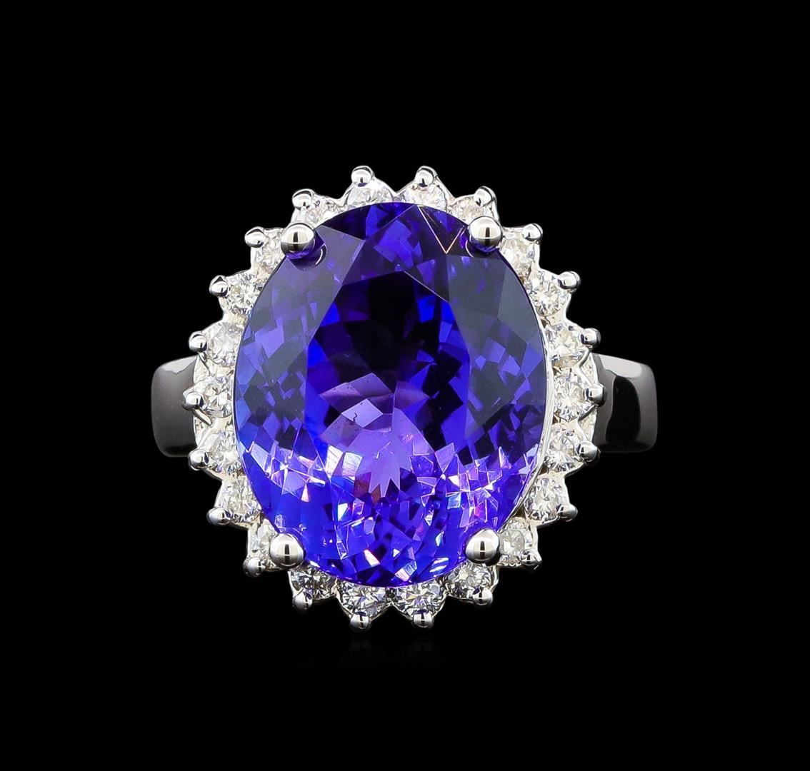 One electronically tested 14KT white gold lady's cast fashion ring with a basket halo with a bright polish finish. The featured lady's ring has a shank measuring 2.82 millimeters wide. Identified with markings of '14K'. Condition is new, good workmanship. Containing: One prong set oval modified brilliant cut natural tanzanite, measuring 14.87 x 12.05 x 8.00mm, (depth est.) approximate weight of 10.17ct., clarity is eye clean, medium dark, strong, violet color, (GIA V 6/5), cut is very good. Transmitting light with no distortion, transparent. Colored gemstones are presumed to have been subjected to commonly used enhancement processes. Graded loose prior to setting in the GIA Laboratory, Report #2175668411. Twenty-Two prong set round brilliant cut diamonds, measuring 1.80 - 1.70 x 1.05mm (depth est.) approximate total weight of 22 Stones = 0.43ct. Graded in the setting. Clarity SI-1 to I-1. Color: H - I Cut Good. Total Weight of Colored Stones 10.17ct.. Total Weight of Diamonds 0.43ct.. Total Weight of Ring 7.90gm. GAS Appraised.