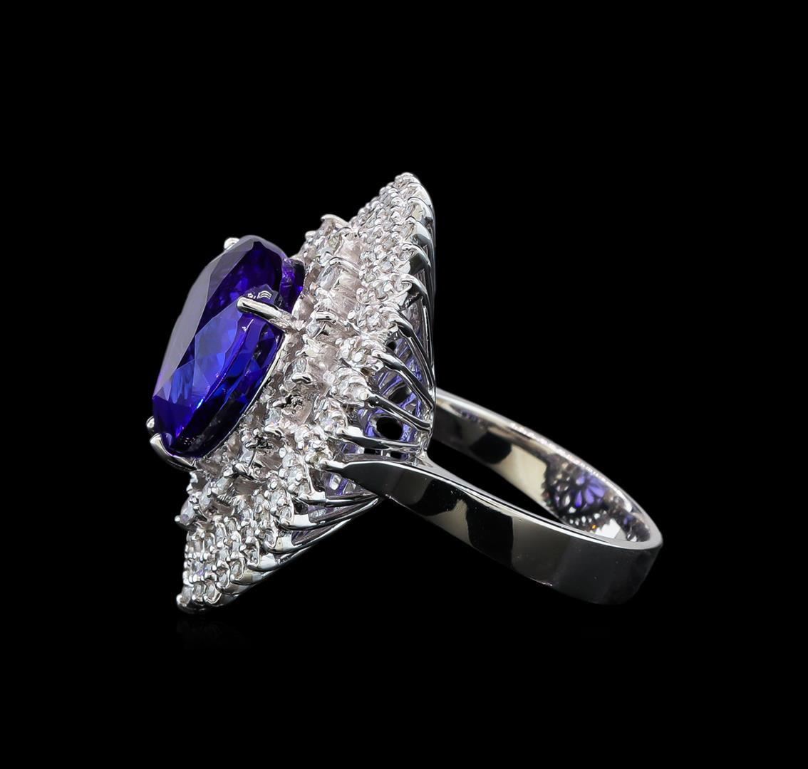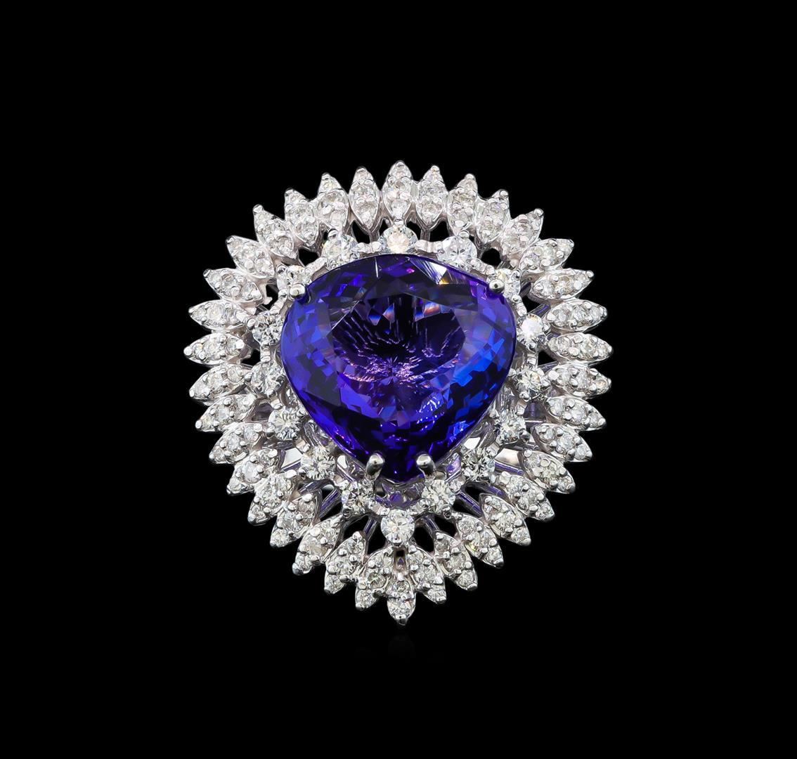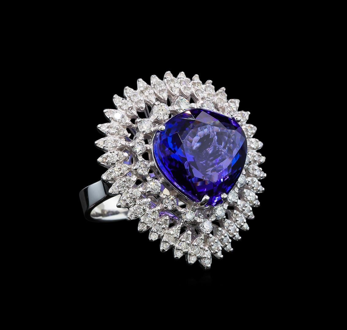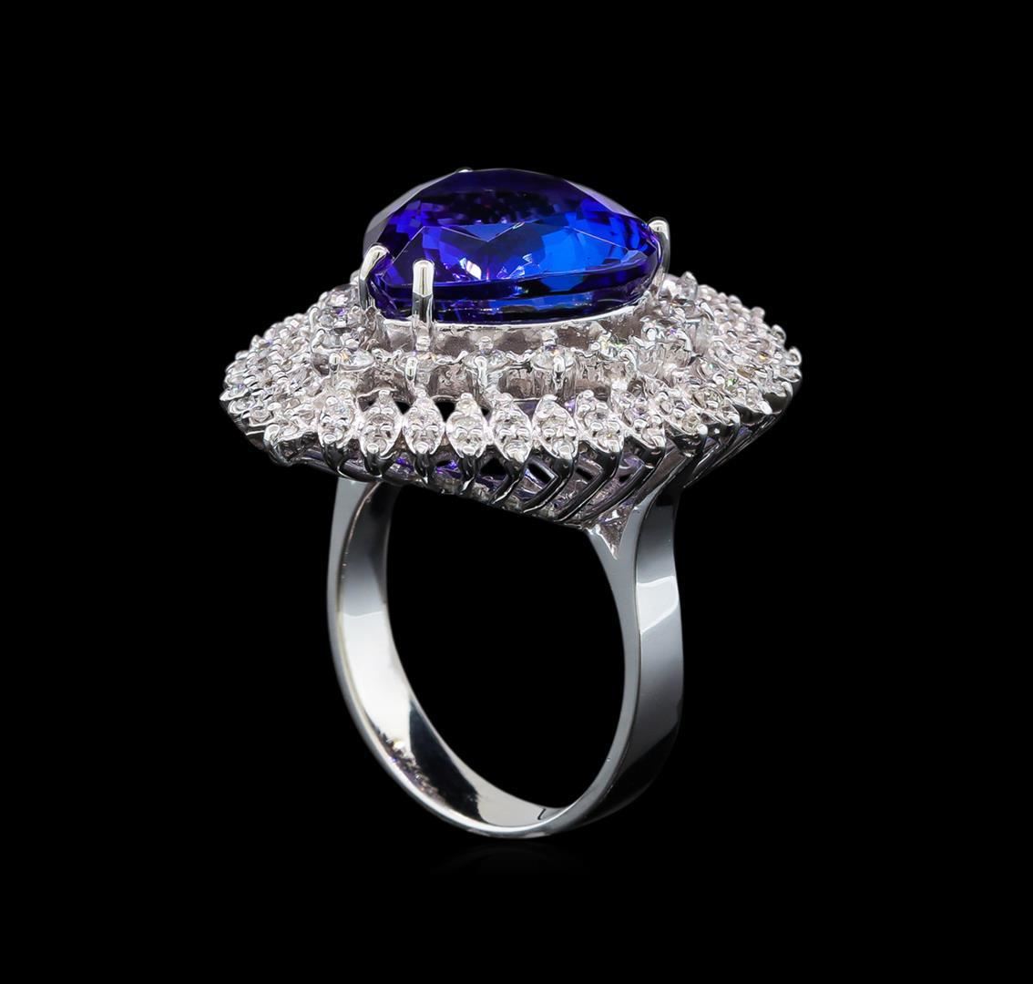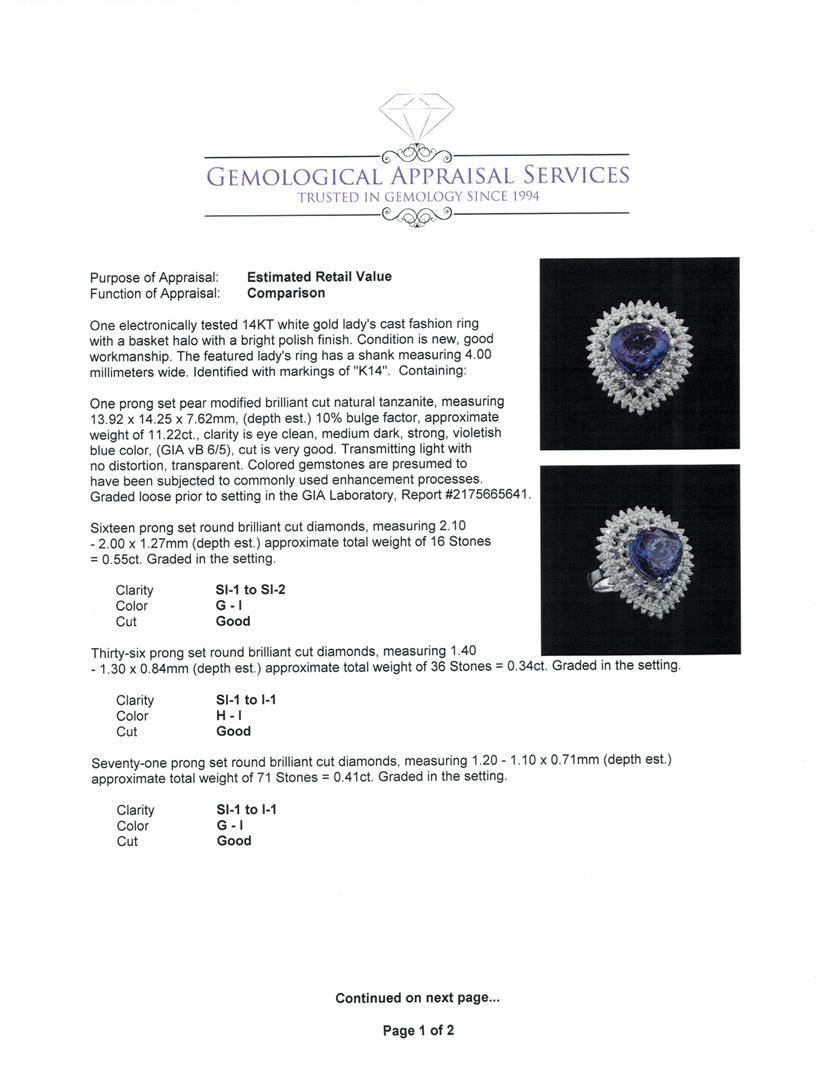 One electronically tested 14KT white gold lady's cast fashion ring with a basket halo with a bright polish finish. The featured lady's ring has a shank measuring 4.00 millimeters wide. Identified with markings of 'K14'. Condition is new, good workmanship. Containing: One prong set pear modified brilliant cut natural tanzanite, measuring 13.92 x 14.25 x 7.62mm, (depth est.) 10%. bulge factor, approximate weight of 11.22ct., clarity is eye clean, medium dark, strong, violetish blue color, (GIA vB 6/5), cut is very good. Transmitting light with no distortion, transparent. Colored gemstones are presumed to have been subjected to commonly used enhancement processes. Graded loose prior to setting in the GIA Laboratory, Report #2175665641. Sixteen prong set round brilliant cut diamonds, measuring 2.10 - 2.00 x 1.27mm (depth est.) approximate total weight of 16 Stones = 0.55ct. Graded in the setting. Clarity SI-1 to SI-2. Color: G - I Cut Good Thirty-Six prong set round brilliant cut diamonds, measuring 1.40 - 1.30 x 0.84mm (depth est.) approximate total weight of 36 Stones = 0.34ct. Graded in the setting. Clarity SI-1 to I-1. Color: H - I Cut Good Seventy-One prong set round brilliant cut diamonds, measuring 1.20 - 1.10 x 0.71mm (depth est.) approximate total weight of 71 Stones = 0.41ct. Graded in the setting. Clarity SI-1 to I-1. Color: G - I Cut Good. Total Weight of Colored Stones 11.22ct.. Total Weight of Diamonds 1.30ct.. Total Weight of Ring 12.30gm. GAS Appraised.