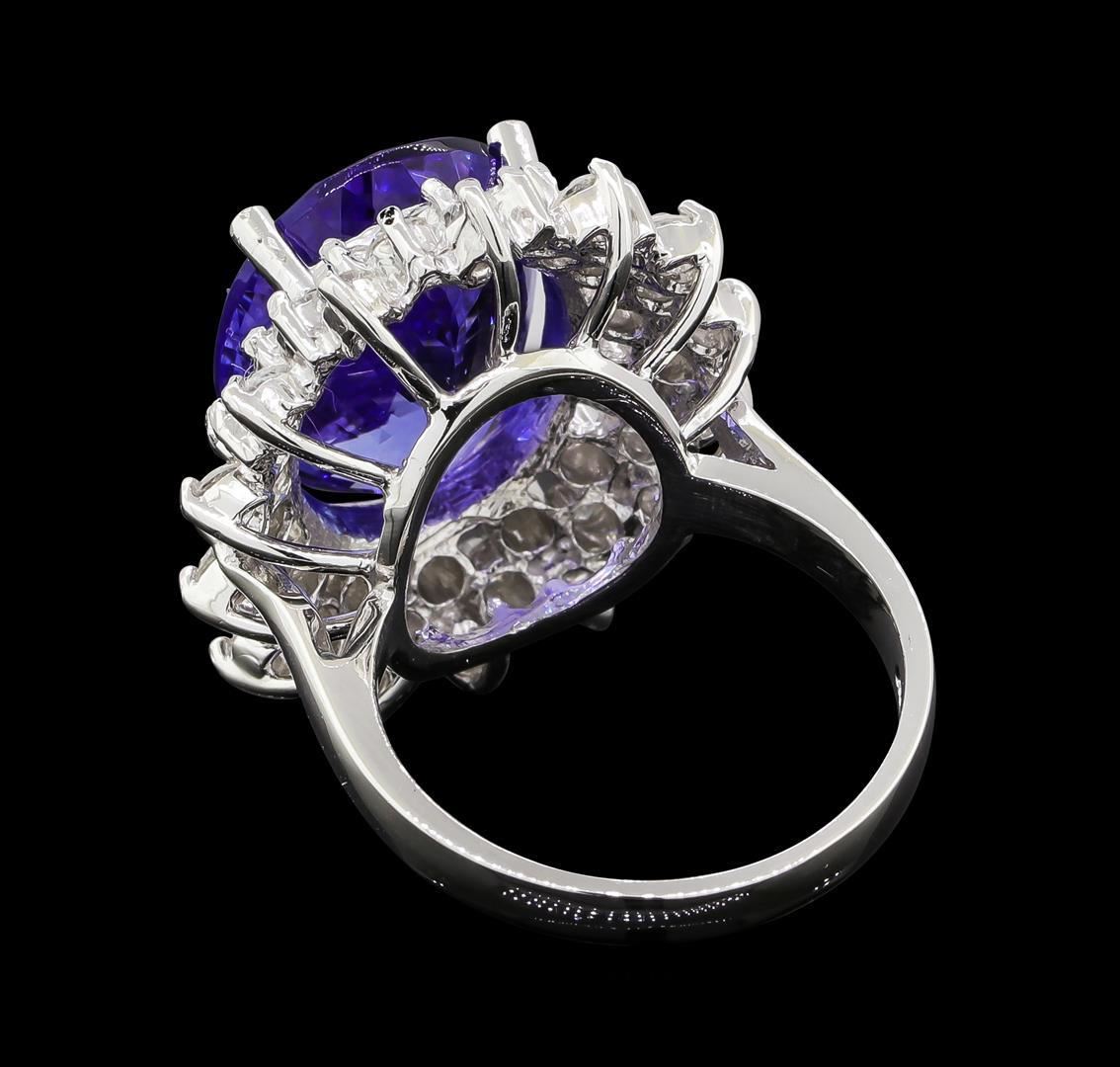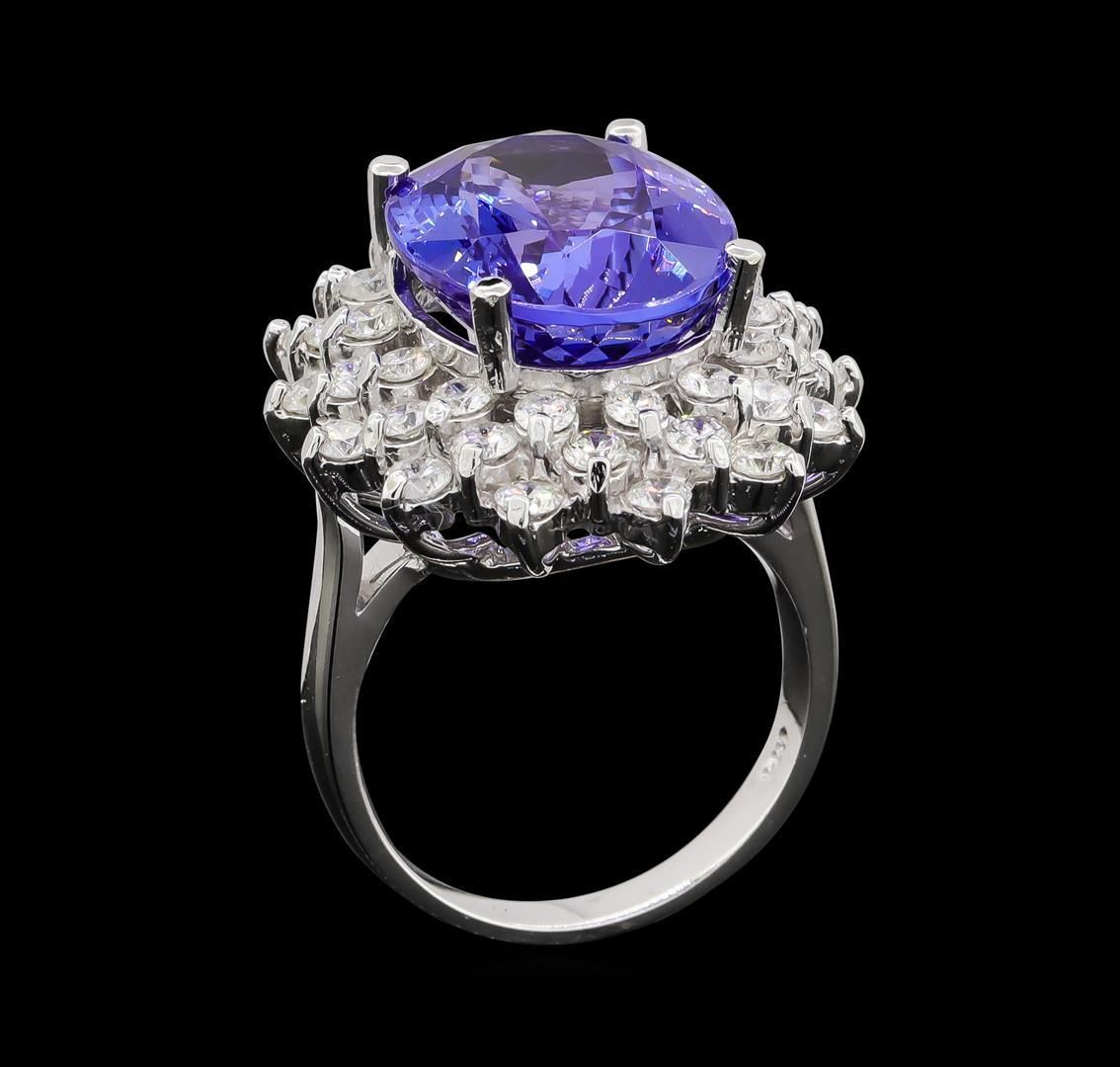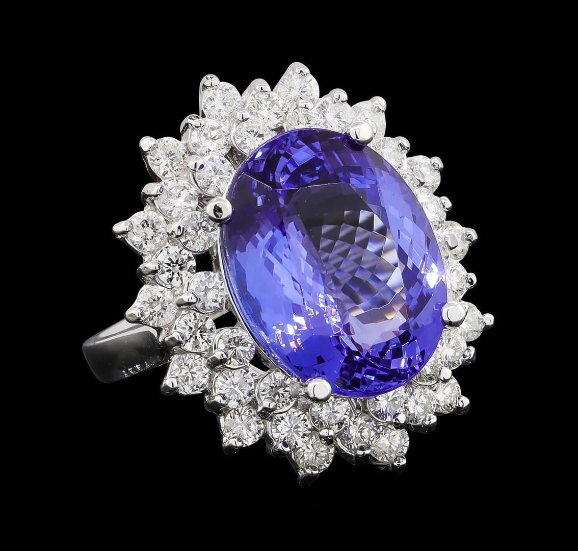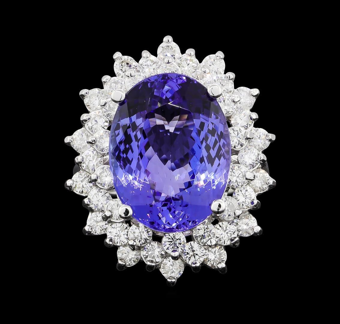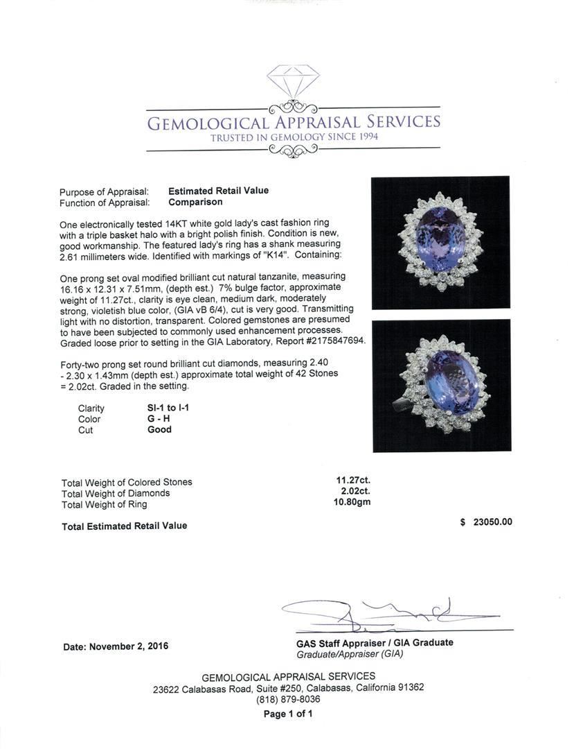 One electronically tested 14KT white gold lady's cast fashion ring with a triple basket halo with a bright polish finish. The featured lady's ring has a shank measuring 2.61 millimeters wide. Identified with markings of 'K14'. Condition is new, good workmanship. Containing: One prong set oval modified brilliant cut natural tanzanite, measuring 16.16 x 12.31 x 7.51mm, (depth est.) 7%. bulge factor, approximate weight of 11.27ct., clarity is eye clean, medium dark, moderately strong, violetish blue color, (GIA vB 6/4), cut is very good. Transmitting light with no distortion, transparent. Colored gemstones are presumed to have been subjected to commonly used enhancement processes. Graded loose prior to setting in the GIA Laboratory, Report #2175847694. Forty-Two prong set round brilliant cut diamonds, measuring 2.40 - 2.30 x 1.43mm (depth est.) approximate total weight of 42 Stones = 2.02ct. Graded in the setting. Clarity SI-1 to I-1. Color: G - H Cut Good. Total Weight of Colored Stones 11.27ct.. Total Weight of Diamonds 2.02ct.. Total Weight of Ring 10.80gm. GAS Appraised.
