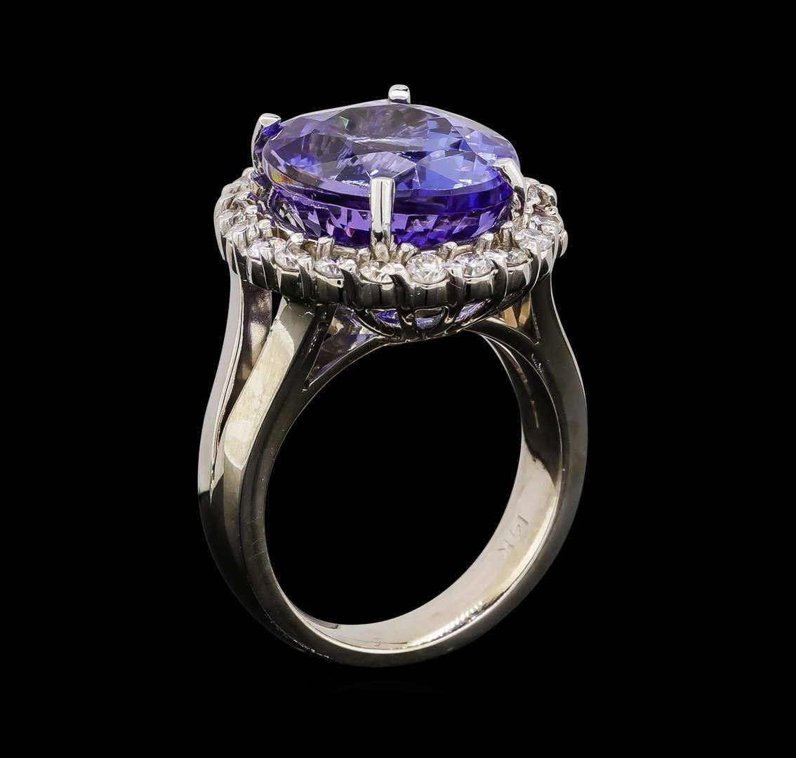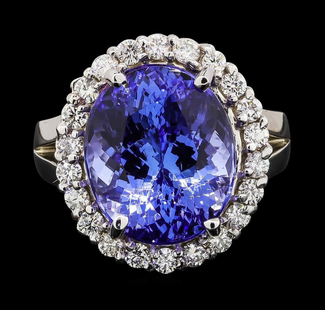 One electronically tested 14KT white gold lady's cast fashion ring with a split shank basket halo with a bright polish finish. The featured lady's ring has a shank measuring 3.90 millimeters wide. Identified with markings of '14K'. Condition is new, good workmanship. Containing: One prong set oval modified brilliant cut natural tanzanite, measuring 14.33 x 11.91 x 9.17mm, (depth est.) approximate weight of 11.27ct., clarity is eye clean, medium, very slightly grayish, violetish blue color, (GIA vB 5/3), cut is very good. Transmitting light with no distortion, transparent. Colored gemstones are presumed to have been subjected to commonly used enhancement processes. Graded loose prior to setting in the GIA Laboratory, Report #5172847707. Twenty-Two prong set round brilliant cut diamonds, measuring 2.10 - 2.00 x 1.27mm (depth est.) approximate total weight of 22 Stones = 0.72ct. Graded in the setting. Clarity SI-1 to SI-2. Color: G - I Cut Good. Total Weight of Colored Stones 11.27ct.. Total Weight of Diamonds 0.72ct.. Total Weight of Ring 12.30gm. GAS Appraised.