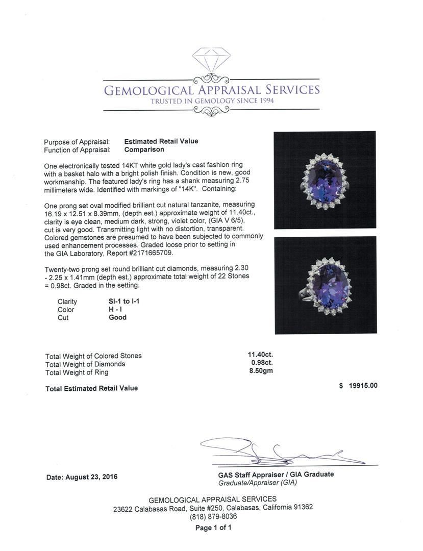 One electronically tested 14KT white gold lady's cast fashion ring with a basket halo with a bright polish finish. The featured lady's ring has a shank measuring 2.75 millimeters wide. Identified with markings of '14K'. Condition is new, good workmanship. Containing: One prong set oval modified brilliant cut natural tanzanite, measuring 16.19 x 12.51 x 8.39mm, (depth est.) approximate weight of 11.40ct., clarity is eye clean, medium dark, strong, violet color, (GIA V 6/5), cut is very good. Transmitting light with no distortion, transparent. Colored gemstones are presumed to have been subjected to commonly used enhancement processes. Graded loose prior to setting in the GIA Laboratory, Report #2171665709. Twenty-Two prong set round brilliant cut diamonds, measuring 2.30 - 2.25 x 1.41mm (depth est.) approximate total weight of 22 Stones = 0.98ct. Graded in the setting. Clarity SI-1 to I-1. Color: H - I Cut Good. Total Weight of Colored Stones 11.40ct.. Total Weight of Diamonds 0.98ct.. Total Weight of Ring 8.50gm. GAS Appraised.