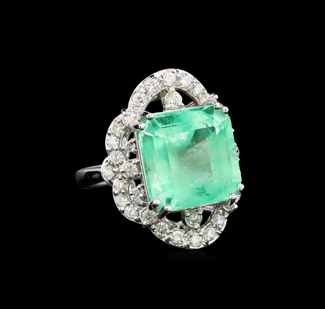One electronically tested 14KT white gold lady's cast fashion ring with a scalloped basket halo with a bright polish finish. The featured lady's ring has a shank measuring 2.96 millimeters wide. Identified with markings of 'K14'. Condition is new, good workmanship. Containing: One prong set emerald standard step cut natural emerald, measuring 13.15 x 13.00 x 10.14mm, (depth est.) approximate weight of 11.70ct., clarity is moderately included, medium light, moderately strong, green color, (GIA G 4/4), cut is very good. Transmitting light somewhat diffusely, transparent to translucent. Naturally occurring internal & external characteristics are present. Indications of oil residue. Clarity enhanced. Colored gemstones are presumed to have been subjected to commonly used enhancement processes. Graded loose prior to setting in the GIA Laboratory, Report #1172664602. Thirty-Two prong set round brilliant cut diamonds, measuring 2.00 - 1.90 x 1.21mm (depth est.) approximate total weight of 32 Stones = 0.89ct. Graded in the setting. Clarity SI-1 to SI-2. Color: H - I Cut Good Four prong set round brilliant cut diamonds, measuring 1.70 - 1.60 x 1.02mm (depth est.) approximate total weight of 4 Stones = 0.07ct. Graded in the setting. Clarity SI-1 to SI-2. Color: H - I Cut Good. Total Weight of Colored Stones 11.70ct.. Total Weight of Diamonds 0.96ct.. Total Weight of Ring 10.70gm. GAS Appraised at $17,760.00.