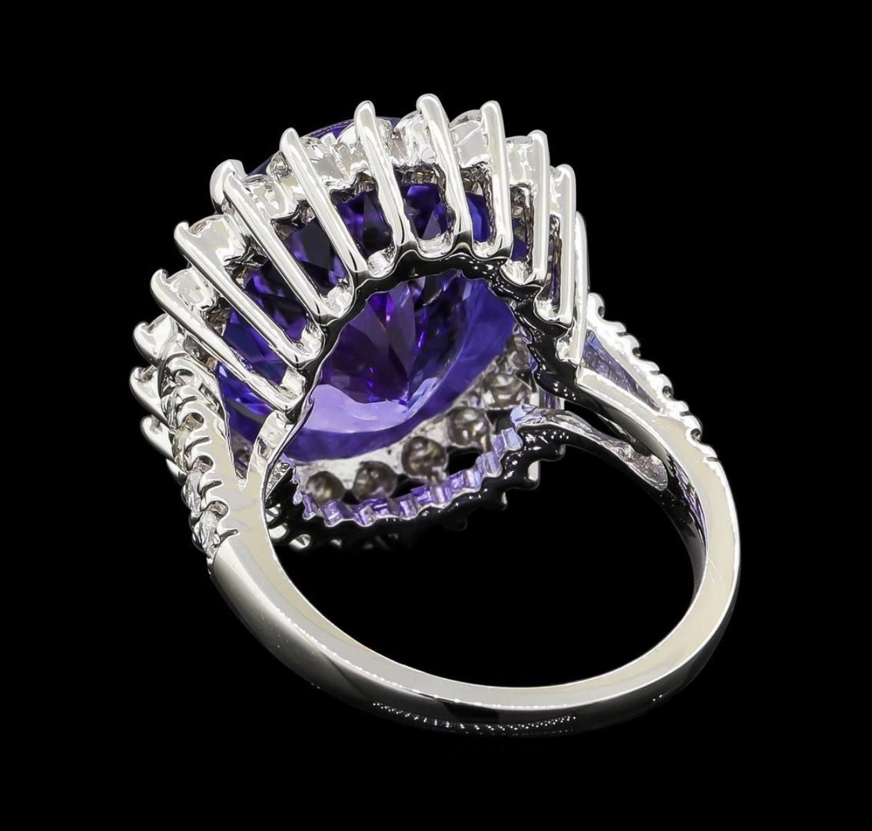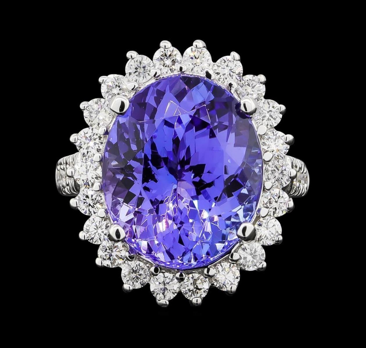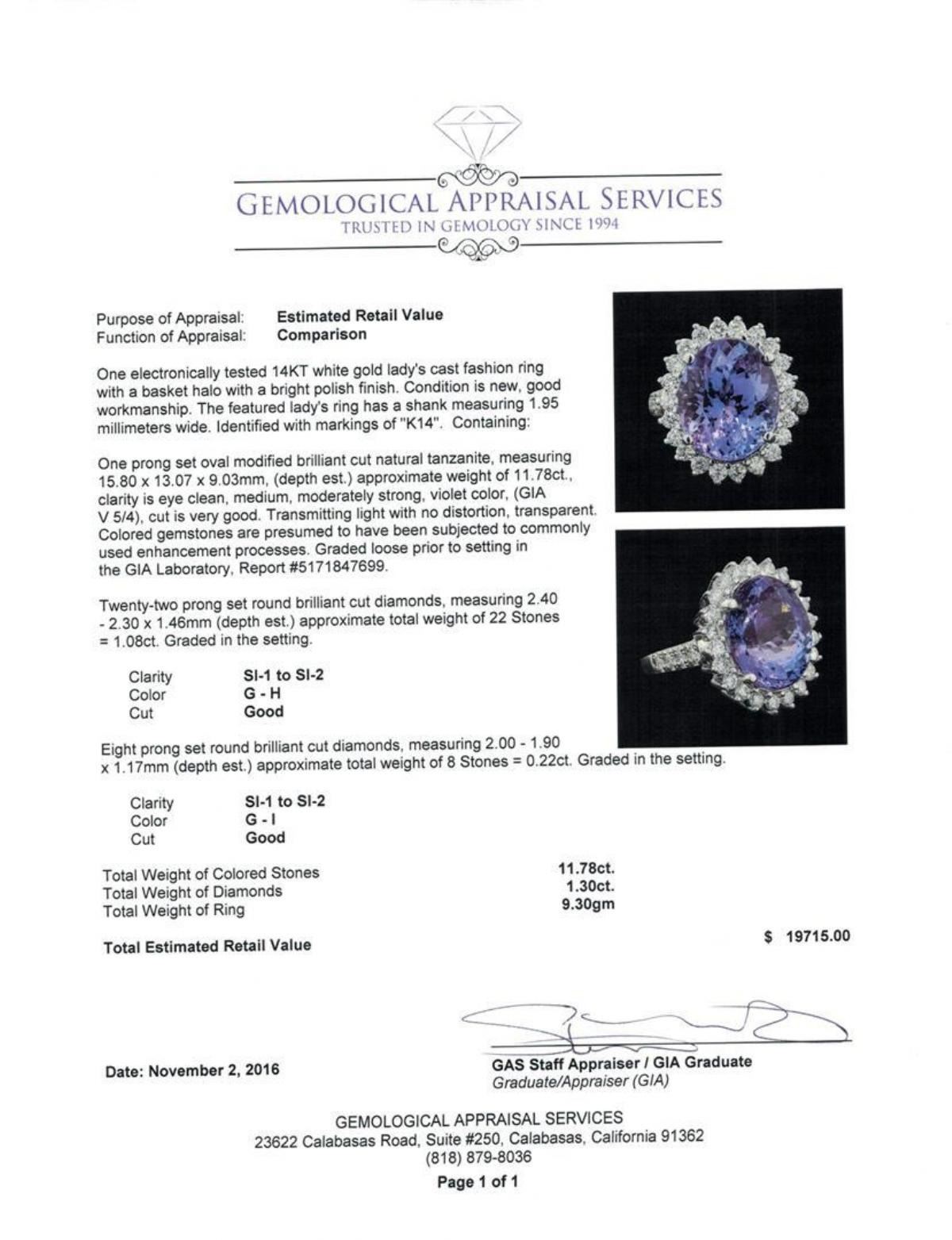 One electronically tested 14KT white gold lady's cast fashion ring with a basket halo with a bright polish finish. The featured lady's ring has a shank measuring 1.95 millimeters wide. Identified with markings of 'K14'. Condition is new, good workmanship. Containing: One prong set oval modified brilliant cut natural tanzanite, measuring 15.80 x 13.07 x 9.03mm, (depth est.) approximate weight of 11.78ct., clarity is eye clean, medium, moderately strong, violet color, (GIA V 5/4), cut is very good. Transmitting light with no distortion, transparent. Colored gemstones are presumed to have been subjected to commonly used enhancement processes. Graded loose prior to setting in the GIA Laboratory, Report #5171847699. Twenty-Two prong set round brilliant cut diamonds, measuring 2.40 - 2.30 x 1.46mm (depth est.) approximate total weight of 22 Stones = 1.08ct. Graded in the setting. Clarity SI-1 to SI-2. Color: G - H Cut Good Eight prong set round brilliant cut diamonds, measuring 2.00 - 1.90 x 1.17mm (depth est.) approximate total weight of 8 Stones = 0.22ct. Graded in the setting. Clarity SI-1 to SI-2. Color: G - I Cut Good. Total Weight of Colored Stones 11.78ct.. Total Weight of Diamonds 1.30ct.. Total Weight of Ring 9.30gm. GAS Appraised.