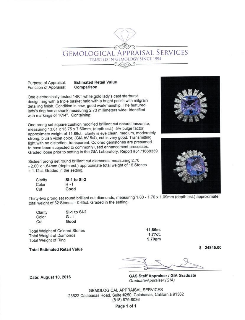 One electronically tested 14KT white gold lady's cast starburst design ring with a triple basket halo with a bright polish with milgrain detailing finish. The featured lady's ring has a shank measuring 2.73 millimeters wide. Identified with markings of 'K14'. Condition is new, good workmanship. Containing: One prong set square cushion modified brilliant cut natural tanzanite, measuring 13.81 x 13.75 x 7.60mm, (depth est.) 5%. bulge factor, approximate weight of 11.86ct., clarity is eye clean, medium, moderately strong, bluish violet color, (GIA bV 5/4), cut is very good. Transmitting light with no distortion, transparent. Colored gemstones are presumed to have been subjected to commonly used enhancement processes. Graded loose prior to setting in the GIA Laboratory, Report #5171668339. Sixteen prong set round brilliant cut diamonds, measuring 2.70 - 2.60 x 1.64mm (depth est.) approximate total weight of 16 Stones = 1.12ct. Graded in the setting. Clarity SI-1 to SI-2. Color: H - I Cut Good Thirty-Two prong set round brilliant cut diamonds, measuring 1.80 - 1.70 x 1.09mm (depth est.) approximate total weight of 32 Stones = 0.65ct. Graded in the setting. Clarity SI-1 to SI-2. Color: G - I Cut Good. Total Weight of Colored Stones 11.86ct.. Total Weight of Diamonds 1.77ct.. Total Weight of Ring 9.70gm. GAS Appraised.