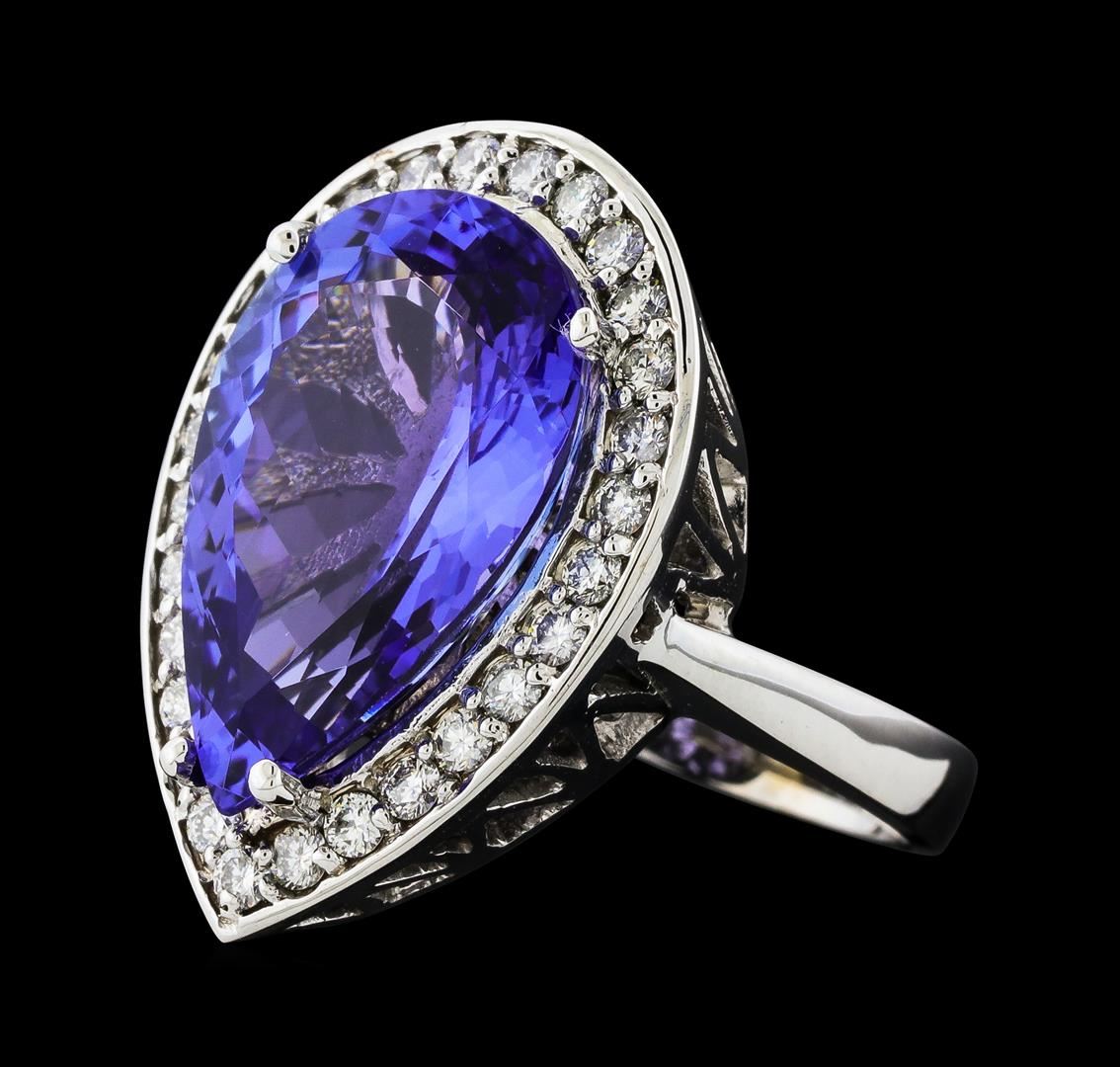 One electronically tested 14KT white gold lady's cast fashion ring with a basket halo with a bright polish finish. The featured lady's ring has a shank measuring 3.05 millimeters wide. Identified with markings of 'K14'. Condition is new, good workmanship. Containing: One prong set pear modified brilliant cut natural tanzanite, measuring 19.30 x 12.78 x 7.42mm, (depth est.) approximate weight of 11.93ct., clarity is eye clean, medium, moderately strong, violet color, (GIA V 5/4), cut is very good. Transmitting light with no distortion, transparent. Colored gemstones are presumed to have been subjected to commonly used enhancement processes. Graded loose prior to setting in the GIA Laboratory, Report #1172847901. Twenty-Eight prong set round brilliant cut diamonds, measuring 2.00 - 1.90 x 1.17mm (depth est.) approximate total weight of 28 Stones = 0.75ct. Graded in the setting. Clarity SI-1 to I-1. Color: H - I Cut Good. Total Weight of Colored Stones 11.93ct.. Total Weight of Diamonds 0.75ct.. Total Weight of Ring 12.40gm. GAS Appraised at $19,100.00.