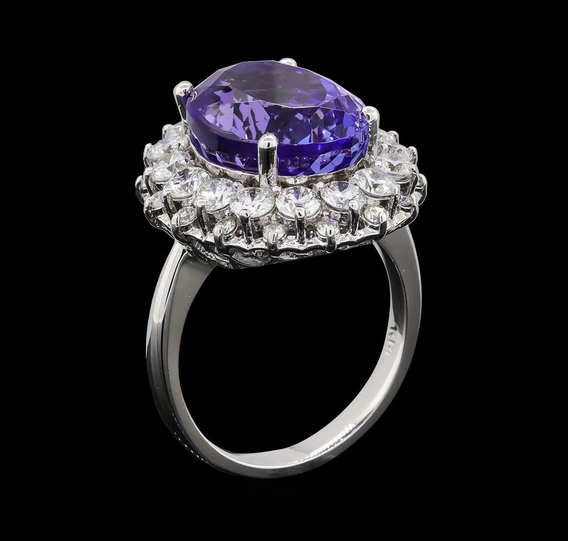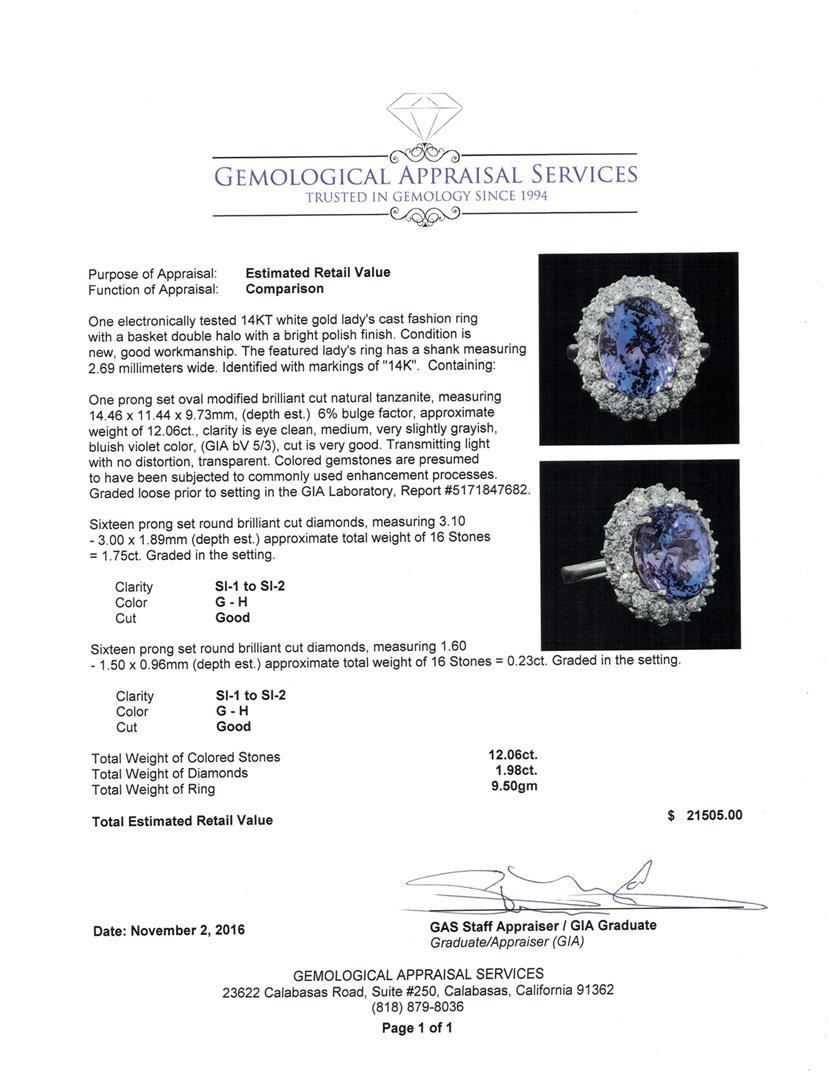 One electronically tested 14KT white gold lady's cast fashion ring with a basket double halo with a bright polish finish. The featured lady's ring has a shank measuring 2.69 millimeters wide. Identified with markings of '14K'. Condition is new, good workmanship. Containing: One prong set oval modified brilliant cut natural tanzanite, measuring 14.46 x 11.44 x 9.73mm, (depth est.) 6%. bulge factor, approximate weight of 12.06ct., clarity is eye clean, medium, very slightly grayish, bluish violet color, (GIA bV 5/3), cut is very good. Transmitting light with no distortion, transparent. Colored gemstones are presumed to have been subjected to commonly used enhancement processes. Graded loose prior to setting in the GIA Laboratory, Report #5171847682. Sixteen prong set round brilliant cut diamonds, measuring 3.10 - 3.00 x 1.89mm (depth est.) approximate total weight of 16 Stones = 1.75ct. Graded in the setting. Clarity SI-1 to SI-2. Color: G - H Cut Good Sixteen prong set round brilliant cut diamonds, measuring 1.60 - 1.50 x 0.96mm (depth est.) approximate total weight of 16 Stones = 0.23ct. Graded in the setting. Clarity SI-1 to SI-2. Color: G - H Cut Good. Total Weight of Colored Stones 12.06ct.. Total Weight of Diamonds 1.98ct.. Total Weight of Ring 9.50gm. GAS Appraised.