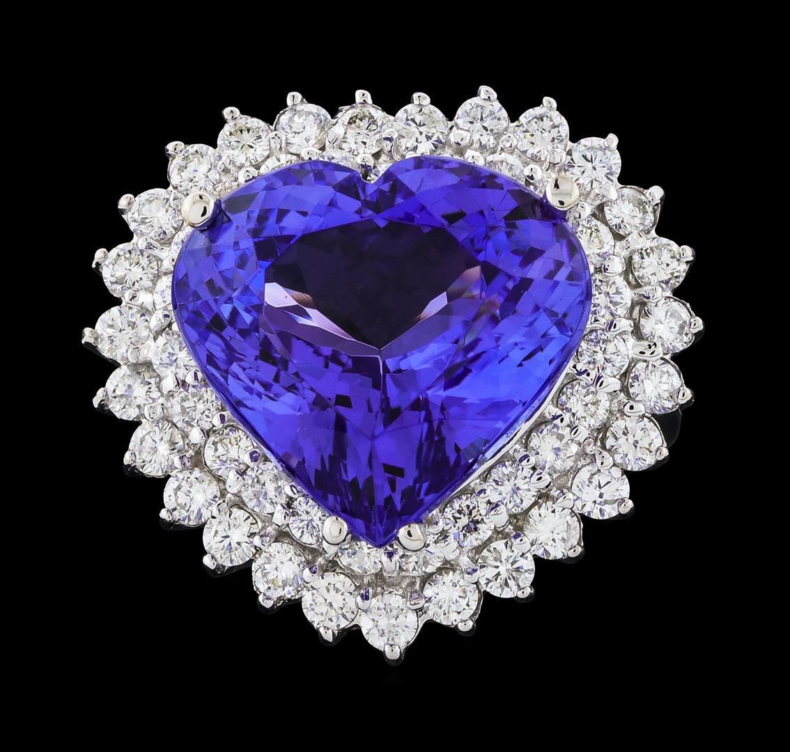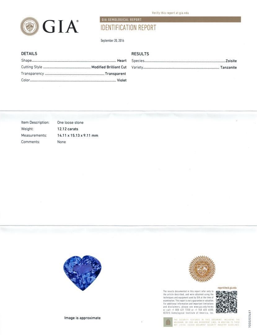 One electronically tested 14KT white gold lady's cast fashion heart shape ring with a double basket halo with a bright polish finish. The featured lady's ring has a shank measuring 2.38 millimeters wide. Identified with markings of 'K14'. Condition is new, good workmanship. Containing: One prong set heart modified brilliant cut natural tanzanite, measuring 14.11 x 15.13 x 9.11mm, (depth est.) approximate weight of 12.12ct., clarity is eye clean, medium, moderately strong, violet color, (GIA V 5/4), cut is very good. Transmitting light with no distortion, transparent. Colored gemstones are presumed to have been subjected to commonly used enhancement processes. Graded loose prior to setting in the GIA Laboratory, Report #1176847964. Twenty-Seven prong set round brilliant cut diamonds, measuring 2.10 - 2.00 x 1.27mm (depth est.) approximate total weight of 27 Stones = 0.90ct. Graded in the setting. Clarity SI-1 to SI-3. Color: G - H Cut Good Twenty-Three prong set round brilliant cut diamonds, measuring 1.90 - 1.85 x 1.17mm (depth est.) approximate total weight of 23 Stones = 0.60ct. Graded in the setting. Clarity SI-1 to SI-3. Color: G - I Cut Good. Total Weight of Colored Stones 12.12ct.. Total Weight of Diamonds 1.50ct.. Total Weight of Ring 9.20gm. GAS Appraised.