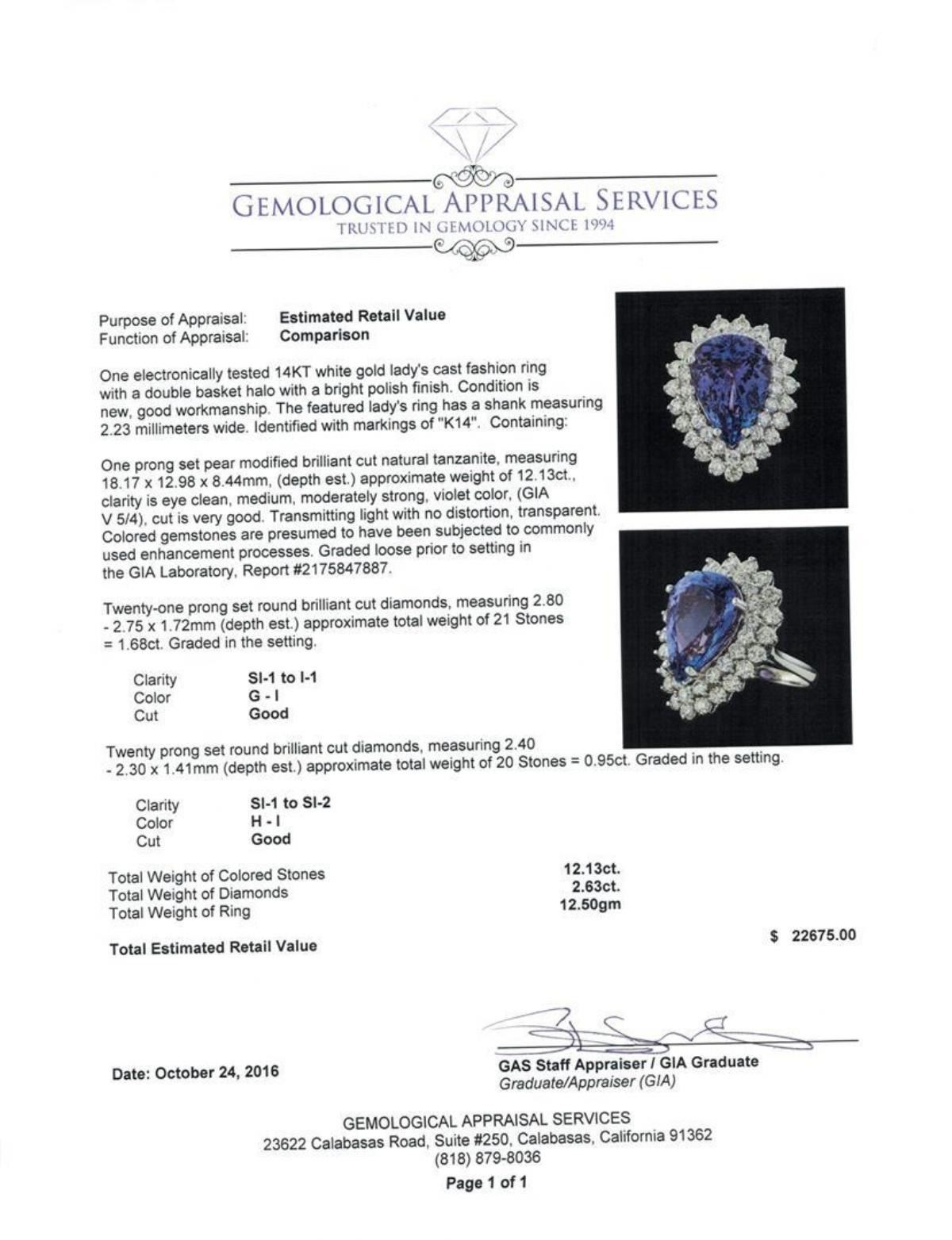 One electronically tested 14KT white gold lady's cast fashion ring with a double basket halo with a bright polish finish. The featured lady's ring has a shank measuring 2.23 millimeters wide. Identified with markings of 'K14'. Condition is new, good workmanship. Containing: One prong set pear modified brilliant cut natural tanzanite, measuring 18.17 x 12.98 x 8.44mm, (depth est.) approximate weight of 12.13ct., clarity is eye clean, medium, moderately strong, violet color, (GIA V 5/4), cut is very good. Transmitting light with no distortion, transparent. Colored gemstones are presumed to have been subjected to commonly used enhancement processes. Graded loose prior to setting in the GIA Laboratory, Report #2175847887. Twenty-One prong set round brilliant cut diamonds, measuring 2.80 - 2.75 x 1.72mm (depth est.) approximate total weight of 21 Stones = 1.68ct. Graded in the setting. Clarity SI-1 to I-1. Color: G - I Cut Good Twenty prong set round brilliant cut diamonds, measuring 2.40 - 2.30 x 1.41mm (depth est.) approximate total weight of 20 Stones = 0.95ct. Graded in the setting. Clarity SI-1 to SI-2. Color: H - I Cut Good. Total Weight of Colored Stones 12.13ct.. Total Weight of Diamonds 2.63ct.. Total Weight of Ring 12.50gm. GAS Appraised.