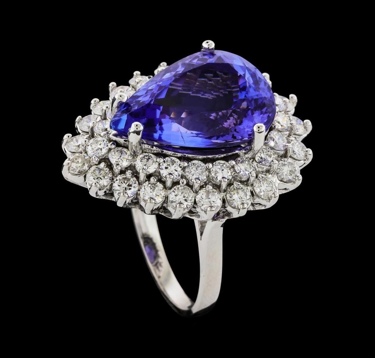 One electronically tested 14KT white gold lady's cast fashion ring with a double basket halo with a bright polish finish. The featured lady's ring has a shank measuring 2.23 millimeters wide. Identified with markings of 'K14'. Condition is new, good workmanship. Containing: One prong set pear modified brilliant cut natural tanzanite, measuring 18.17 x 12.98 x 8.44mm, (depth est.) approximate weight of 12.13ct., clarity is eye clean, medium, moderately strong, violet color, (GIA V 5/4), cut is very good. Transmitting light with no distortion, transparent. Colored gemstones are presumed to have been subjected to commonly used enhancement processes. Graded loose prior to setting in the GIA Laboratory, Report #2175847887. Twenty-One prong set round brilliant cut diamonds, measuring 2.80 - 2.75 x 1.72mm (depth est.) approximate total weight of 21 Stones = 1.68ct. Graded in the setting. Clarity SI-1 to I-1. Color: G - I Cut Good Twenty prong set round brilliant cut diamonds, measuring 2.40 - 2.30 x 1.41mm (depth est.) approximate total weight of 20 Stones = 0.95ct. Graded in the setting. Clarity SI-1 to SI-2. Color: H - I Cut Good. Total Weight of Colored Stones 12.13ct.. Total Weight of Diamonds 2.63ct.. Total Weight of Ring 12.50gm. GAS Appraised.