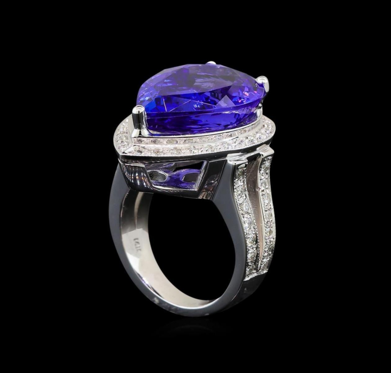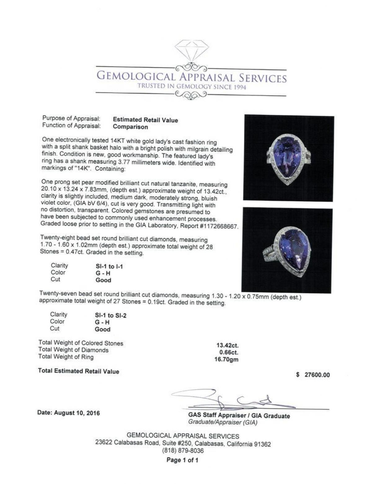 One electronically tested 14KT white gold lady's cast fashion ring with a split shank basket halo with a bright polish with milgrain detailing finish. The featured lady's ring has a shank measuring 3.77 millimeters wide. Identified with markings of '14K'. Condition is new, good workmanship. Containing: One prong set pear modified brilliant cut natural tanzanite, measuring 20.10 x 13.24 x 7.83mm, (depth est.) approximate weight of 13.42ct., clarity is slightly included, medium dark, moderately strong, bluish violet color, (GIA bV 6/4), cut is very good. Transmitting light with no distortion, transparent. Colored gemstones are presumed to have been subjected to commonly used enhancement processes. Graded loose prior to setting in the GIA Laboratory, Report #1172668667. Twenty-Eight bead set round brilliant cut diamonds, measuring 1.70 - 1.60 x 1.02mm (depth est.) approximate total weight of 28 Stones = 0.47ct. Graded in the setting. Clarity SI-1 to I-1. Color: G - H Cut Good Twenty-Seven bead set round brilliant cut diamonds, measuring 1.30 - 1.20 x 0.75mm (depth est.) approximate total weight of 27 Stones = 0.19ct. Graded in the setting. Clarity SI-1 to SI-2. Color: G - H Cut Good. Total Weight of Colored Stones 13.42ct.. Total Weight of Diamonds 0.66ct.. Total Weight of Ring 16.70gm. GAS Appraised.