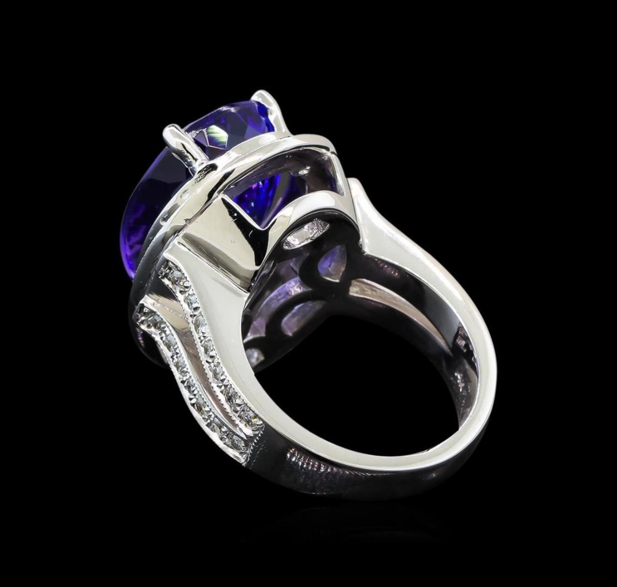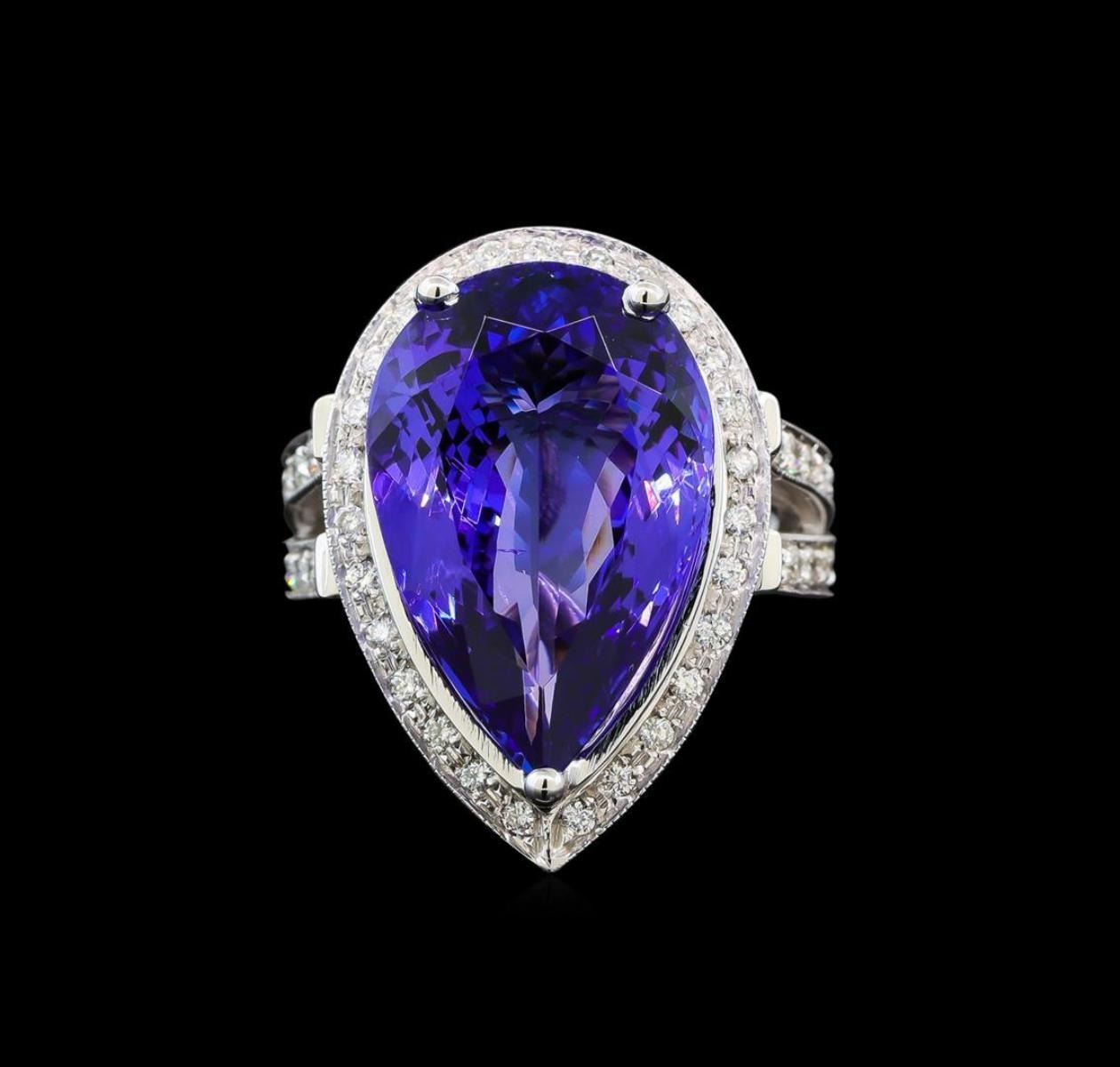 One electronically tested 14KT white gold lady's cast fashion ring with a split shank basket halo with a bright polish with milgrain detailing finish. The featured lady's ring has a shank measuring 3.77 millimeters wide. Identified with markings of '14K'. Condition is new, good workmanship. Containing: One prong set pear modified brilliant cut natural tanzanite, measuring 20.10 x 13.24 x 7.83mm, (depth est.) approximate weight of 13.42ct., clarity is slightly included, medium dark, moderately strong, bluish violet color, (GIA bV 6/4), cut is very good. Transmitting light with no distortion, transparent. Colored gemstones are presumed to have been subjected to commonly used enhancement processes. Graded loose prior to setting in the GIA Laboratory, Report #1172668667. Twenty-Eight bead set round brilliant cut diamonds, measuring 1.70 - 1.60 x 1.02mm (depth est.) approximate total weight of 28 Stones = 0.47ct. Graded in the setting. Clarity SI-1 to I-1. Color: G - H Cut Good Twenty-Seven bead set round brilliant cut diamonds, measuring 1.30 - 1.20 x 0.75mm (depth est.) approximate total weight of 27 Stones = 0.19ct. Graded in the setting. Clarity SI-1 to SI-2. Color: G - H Cut Good. Total Weight of Colored Stones 13.42ct.. Total Weight of Diamonds 0.66ct.. Total Weight of Ring 16.70gm. GAS Appraised.
