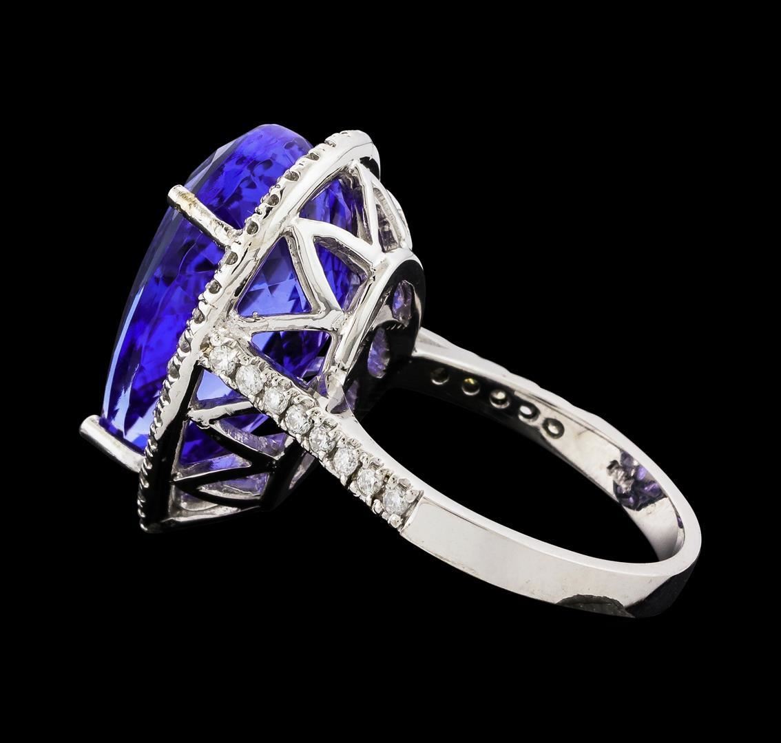 One electronically tested 14KT white gold lady's cast fashion ring with a cathedral shank with a basket halo with a bright polish finish. The featured lady's ring has a shank measuring 2.49 millimeters wide. Identified with markings of 'K14'. Condition is new, good workmanship. Containing: One prong set pear modified brilliant cut natural tanzanite, measuring 18.37 x 11.33 x 8.98mm, (depth est.) 14%. bulge factor, approximate weight of 14.31ct., clarity is eye clean, medium dark, moderately strong, bluish violet color, (GIA bV 6/4), cut is very good. Transmitting light with no distortion, transparent. Colored gemstones are presumed to have been subjected to commonly used enhancement processes. Graded loose prior to setting in the GIA Laboratory, Report #2175847826. Sixteen prong set round brilliant cut diamonds, measuring 1.70 - 1.50 x 0.96mm (depth est.) approximate total weight of 16 Stones = 0.24ct. Graded in the setting. Clarity SI-1 to I-1. Color: G - H Cut Good Thirty-Six prong set round brilliant cut diamonds, measuring 1.40 - 1.30 x 0.82mm (depth est.) approximate total weight of 36 Stones = 0.33ct. Graded in the setting. Clarity SI-1 to SI-3. Color: G - I Cut Good. Total Weight of Colored Stones 14.31ct.. Total Weight of Diamonds 0.57ct.. Total Weight of Ring 8.60gm. GAS Appraised.