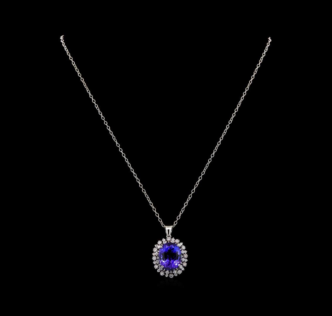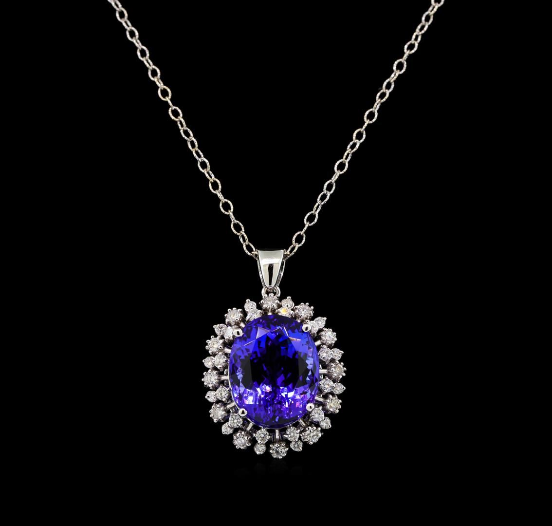 One electronically tested 14KT white gold lady's combination cast & assembled fashion pendant & chain 18.0' long, 1.9mm twisted oval cable link with a lobster claw clasp with a basket double halo with a bright polish finish. Identified with markings of '14K'. Condition is new, good workmanship. Containing: One prong set oval modified brilliant cut natural tanzanite, measuring 16.18 x 12.89 x 9.63mm, (depth est.) 6%. bulge factor, approximate weight of 15.02ct., clarity is eye clean, medium dark, strong, bluish violet color, (GIA bV 6/5), cut is very good. Transmitting light with no distortion, transparent. Colored gemstones are presumed to have been subjected to commonly used enhancement processes. Graded loose prior to setting in the GIA Laboratory, Report #5171668391. Twelve prong set round brilliant cut diamonds, measuring 2.20 - 2.10 x 1.29mm (depth est.) approximate total weight of 12 Stones = 0.43ct. Graded in the setting. Clarity SI-1 to I-1. Color: H - I Cut Good Twelve prong set round brilliant cut diamonds, measuring 1.90 - 1.80 x 1.11mm (depth est.) approximate total weight of 12 Stones = 0.28ct. Graded in the setting. Clarity SI-1 to SI-2. Color: H - I Cut Good Twelve prong set round brilliant cut diamonds, measuring 1.60 - 1.50 x 0.93mm (depth est.) approximate total weight of 12 Stones = 0.16ct. Graded in the setting. Clarity SI-1 to SI-2. Color: H - I Cut Good. Total Weight of Colored Stones 15.02ct.. Total Weight of Diamonds 0.87ct.. Total Weight of Pendant & Chain 9.60gm. GAS Appraised at $26,490.00.