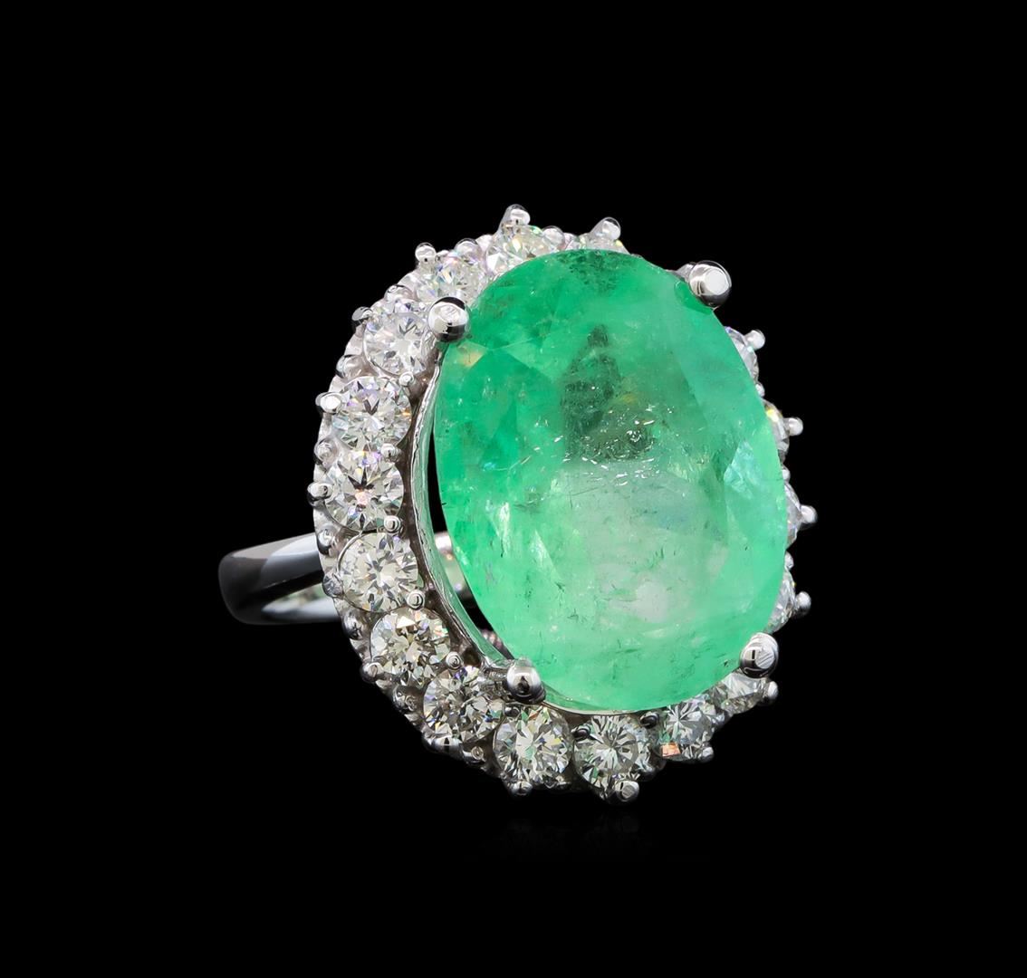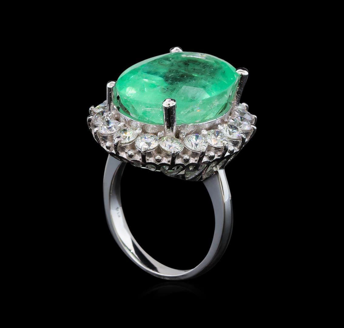 One electronically tested 14KT white gold lady's cast fashion ring with a basket halo with a bright polish finish. The featured lady's ring has a shank measuring 2.93 millimeters wide. Identified with markings of 'K14'. Condition is new, good workmanship. Containing: One prong set oval modified brilliant cut natural emerald, measuring 18.86 x 14.53 x 11.01mm, (depth est.) approximate weight of 16.24ct., clarity is moderately included, medium light, moderately strong, green color, (GIA G 4/4), cut is good. Transmitting light somewhat diffusely, transparent to translucent. Naturally occurring internal & external characteristics are present. Indications of oil residue. Colored gemstones are presumed to have been subjected to commonly used enhancement processes. Graded loose prior to setting in the GIA Laboratory, Report #5172665459. Eighteen prong set round brilliant cut diamonds, measuring 3.30 - 3.20 x 2.02mm (depth est.) approximate total weight of 18 Stones = 2.34ct. Graded in the setting. Clarity SI-1 to I-1. Color: H - I Cut Very Good. Total Weight of Colored Stones 16.24ct.. Total Weight of Diamonds 2.34ct.. Total Weight of Ring 11.70gm. GAS Appraised at $27,540.00.