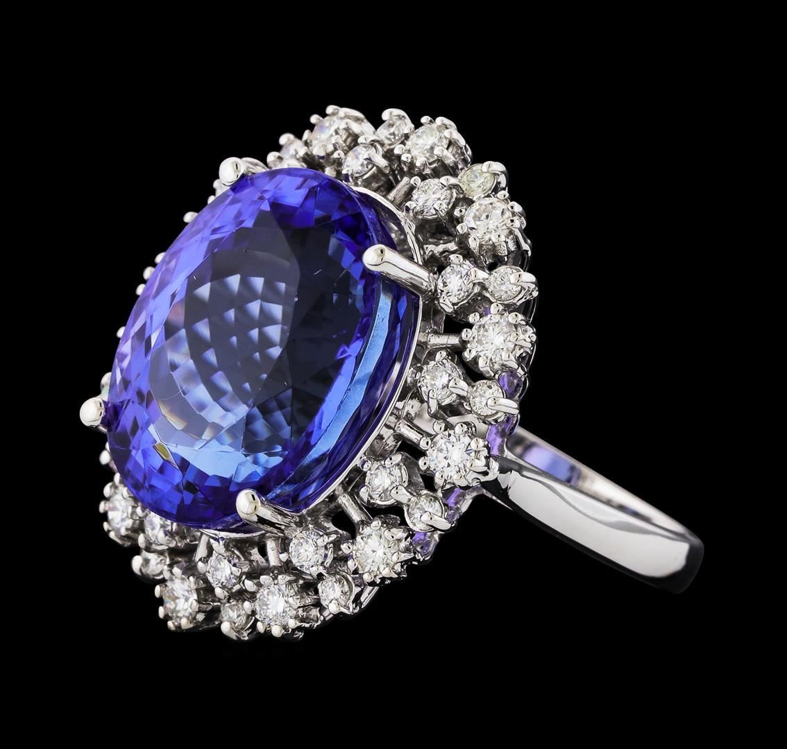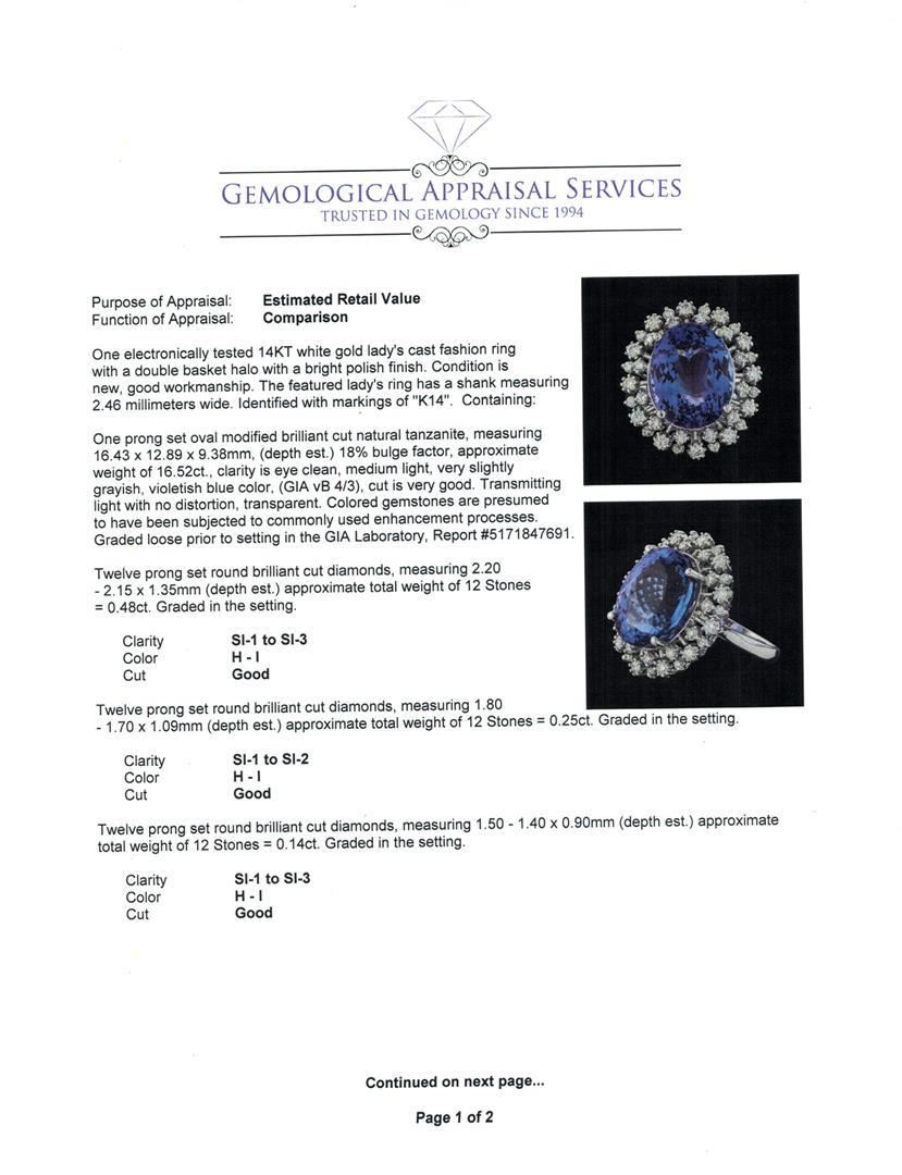 One electronically tested 14KT white gold lady's cast fashion ring with a double basket halo with a bright polish finish. The featured lady's ring has a shank measuring 2.46 millimeters wide. Identified with markings of 'K14'. Condition is new, good workmanship. Containing: One prong set oval modified brilliant cut natural tanzanite, measuring 16.43 x 12.89 x 9.38mm, (depth est.) 18%. bulge factor, approximate weight of 16.52ct., clarity is eye clean, medium light, very slightly grayish, violetish blue color, (GIA vB 4/3), cut is very good. Transmitting light with no distortion, transparent. Colored gemstones are presumed to have been subjected to commonly used enhancement processes. Graded loose prior to setting in the GIA Laboratory, Report #5171847691. Twelve prong set round brilliant cut diamonds, measuring 2.20 - 2.15 x 1.35mm (depth est.) approximate total weight of 12 Stones = 0.48ct. Graded in the setting. Clarity SI-1 to SI-3. Color: H - I Cut Good Twelve prong set round brilliant cut diamonds, measuring 1.80 - 1.70 x 1.09mm (depth est.) approximate total weight of 12 Stones = 0.25ct. Graded in the setting. Clarity SI-1 to SI-2. Color: H - I Cut Good Twelve prong set round brilliant cut diamonds, measuring 1.50 - 1.40 x 0.90mm (depth est.) approximate total weight of 12 Stones = 0.14ct. Graded in the setting. Clarity SI-1 to SI-3. Color: H - I Cut Good. Total Weight of Colored Stones 16.52ct.. Total Weight of Diamonds 0.87ct.. Total Weight of Ring 10.00gm. GAS Appraised.