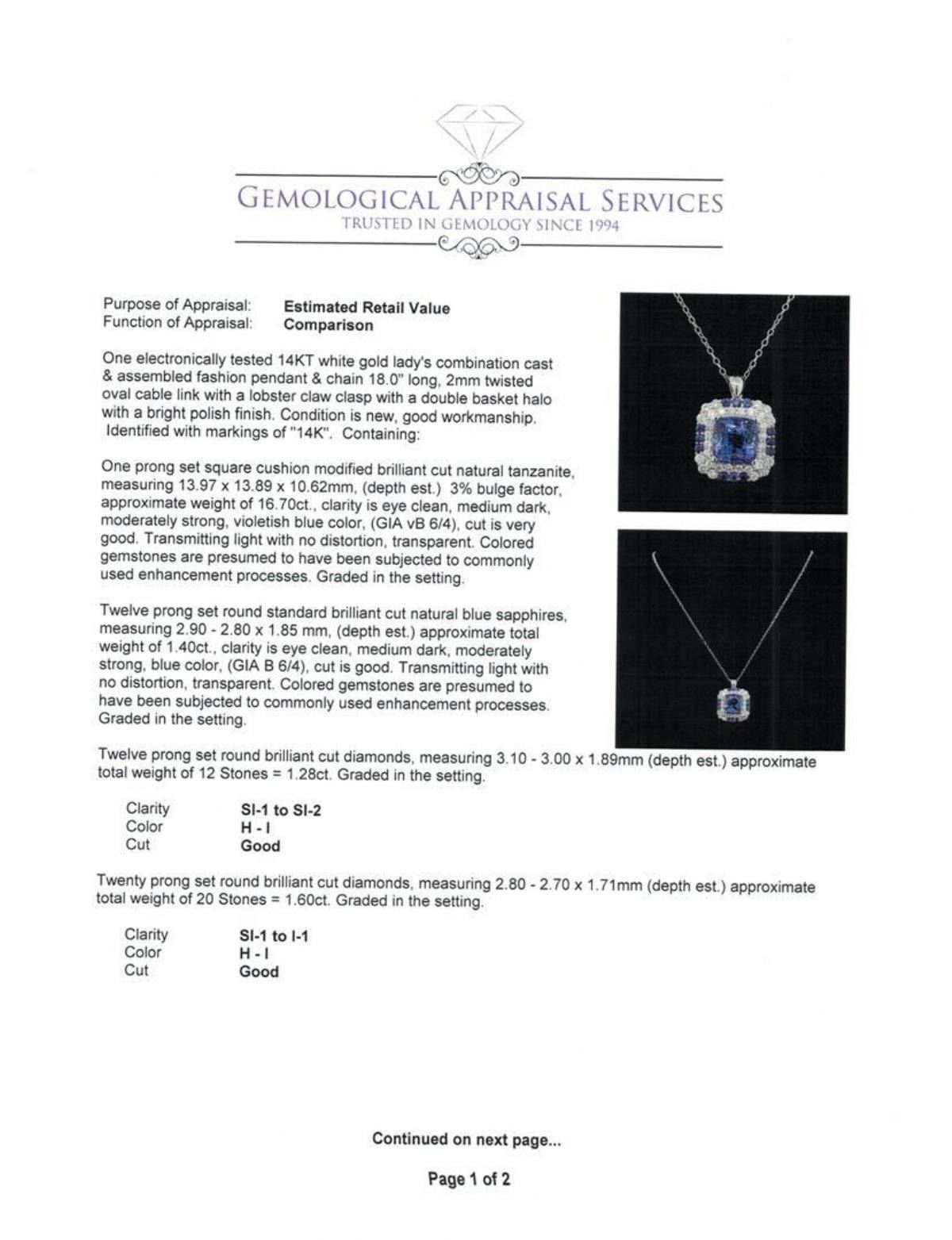 One electronically tested 14KT white gold lady's combination cast & assembled fashion pendant & chain 18.0' long, 2mm twisted oval cable link with a lobster claw clasp with a double basket halo with a bright polish finish. Identified with markings of '14K'. Condition is new, good workmanship. Containing: One prong set square cushion modified brilliant cut natural tanzanite, measuring 13.97 x 13.89 x 10.62mm, (depth est.) 3%. bulge factor, approximate weight of 16.70ct., clarity is eye clean, medium dark, moderately strong, violetish blue color, (GIA vB 6/4), cut is very good. Transmitting light with no distortion, transparent. Colored gemstones are presumed to have been subjected to commonly used enhancement processes. Graded in the setting. Twelve prong set round standard brilliant cut natural blue sapphires, measuring 2.90 - 2.80 x 1.85 mm, (depth est.) approximate total weight of 1.40ct., clarity is eye clean, medium dark, moderately strong, blue color, (GIA B 6/4), cut is good. Transmitting light with no distortion, transparent. Colored gemstones are presumed to have been subjected to commonly used enhancement processes. Graded in the setting. Twelve prong set round brilliant cut diamonds, measuring 3.10 - 3.00 x 1.89mm (depth est.) approximate total weight of 12 Stones = 1.28ct. Graded in the setting. Clarity SI-1 to SI-2. Color: H - I Cut Good Twenty prong set round brilliant cut diamonds, measuring 2.80 - 2.70 x 1.71mm (depth est.) approximate total weight of 20 Stones = 1.60ct. Graded in the setting. Clarity SI-1 to I-1. Color: H - I Cut Good. Total Weight of Colored Stones 18.10ct.. Total Weight of Diamonds 2.88ct.. Total Weight of Pendant & Chain 16.30gm. GAS Appraised.
