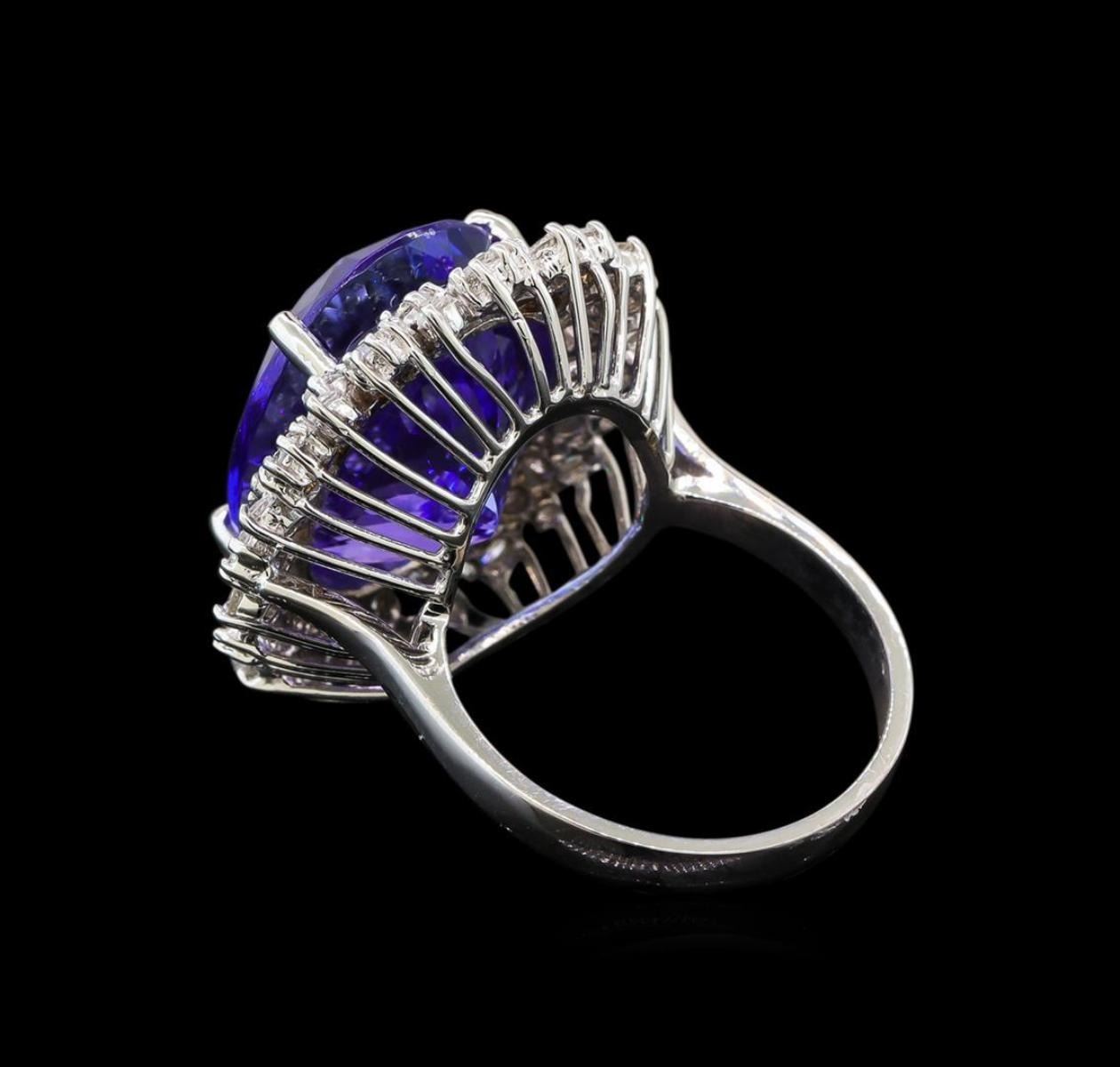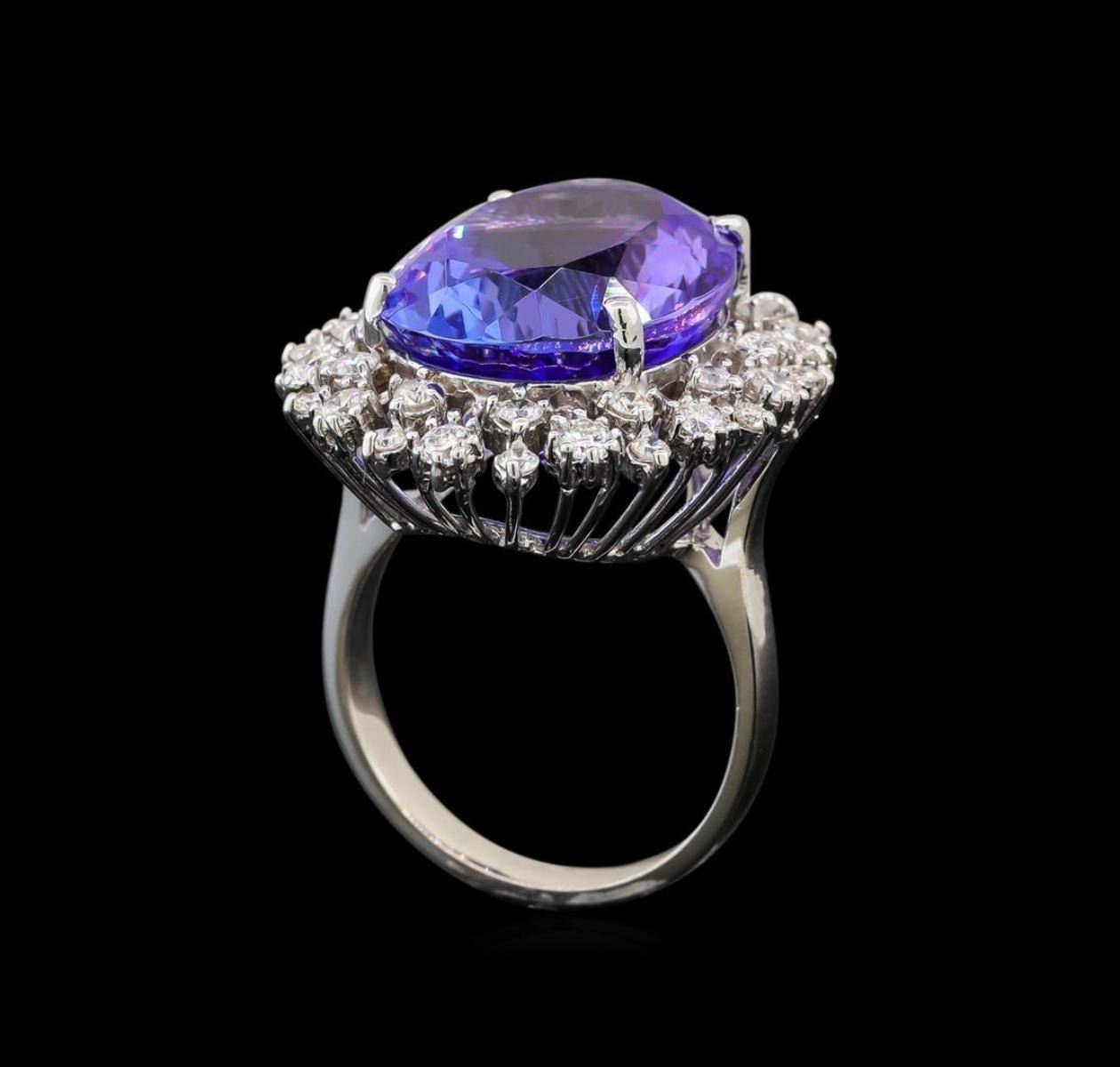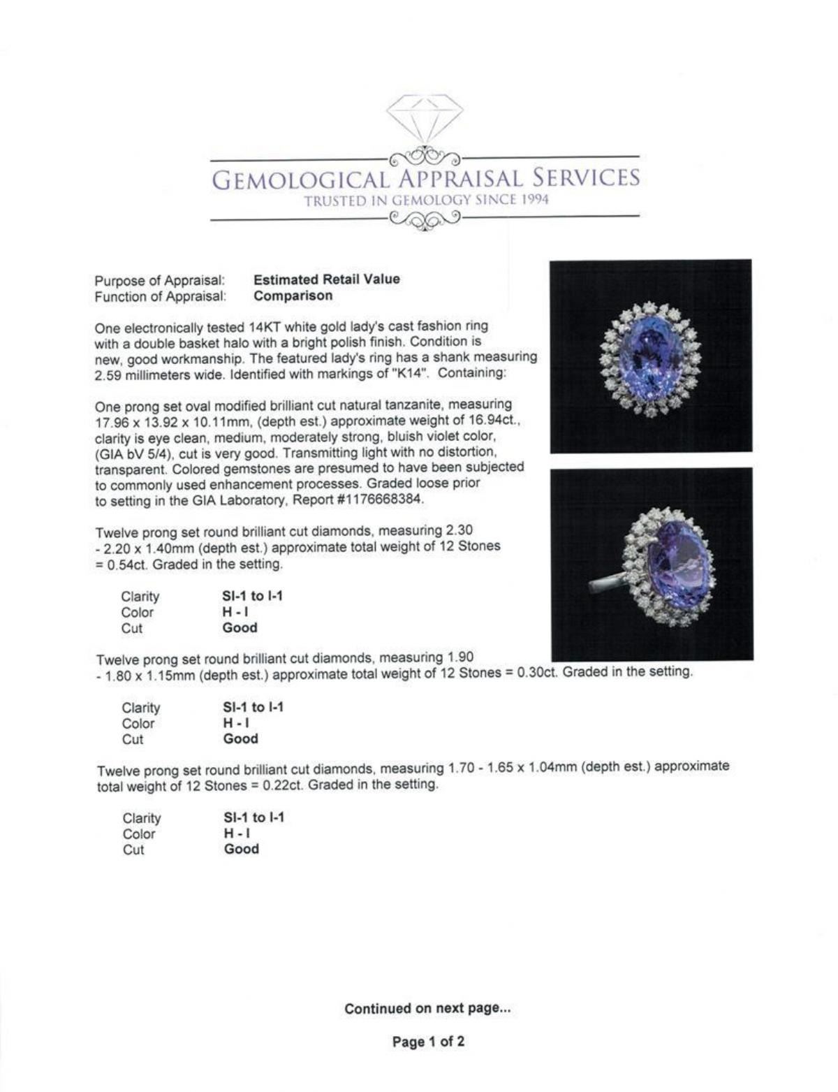 One electronically tested 14KT white gold lady's cast fashion ring with a double basket halo with a bright polish finish. The featured lady's ring has a shank measuring 2.59 millimeters wide. Identified with markings of 'K14'. Condition is new, good workmanship. Containing: One prong set oval modified brilliant cut natural tanzanite, measuring 17.96 x 13.92 x 10.11mm, (depth est.) approximate weight of 16.94ct., clarity is eye clean, medium, moderately strong, bluish violet color, (GIA bV 5/4), cut is very good. Transmitting light with no distortion, transparent. Colored gemstones are presumed to have been subjected to commonly used enhancement processes. Graded loose prior to setting in the GIA Laboratory, Report #1176668384. Twelve prong set round brilliant cut diamonds, measuring 2.30 - 2.20 x 1.40mm (depth est.) approximate total weight of 12 Stones = 0.54ct. Graded in the setting. Clarity SI-1 to I-1. Color: H - I Cut Good Twelve prong set round brilliant cut diamonds, measuring 1.90 - 1.80 x 1.15mm (depth est.) approximate total weight of 12 Stones = 0.30ct. Graded in the setting. Clarity SI-1 to I-1. Color: H - I Cut Good Twelve prong set round brilliant cut diamonds, measuring 1.70 - 1.65 x 1.04mm (depth est.) approximate total weight of 12 Stones = 0.22ct. Graded in the setting. Clarity SI-1 to I-1. Color: H - I Cut Good. Total Weight of Colored Stones 16.94ct.. Total Weight of Diamonds 1.06ct.. Total Weight of Ring 10.10gm. GAS Appraised.