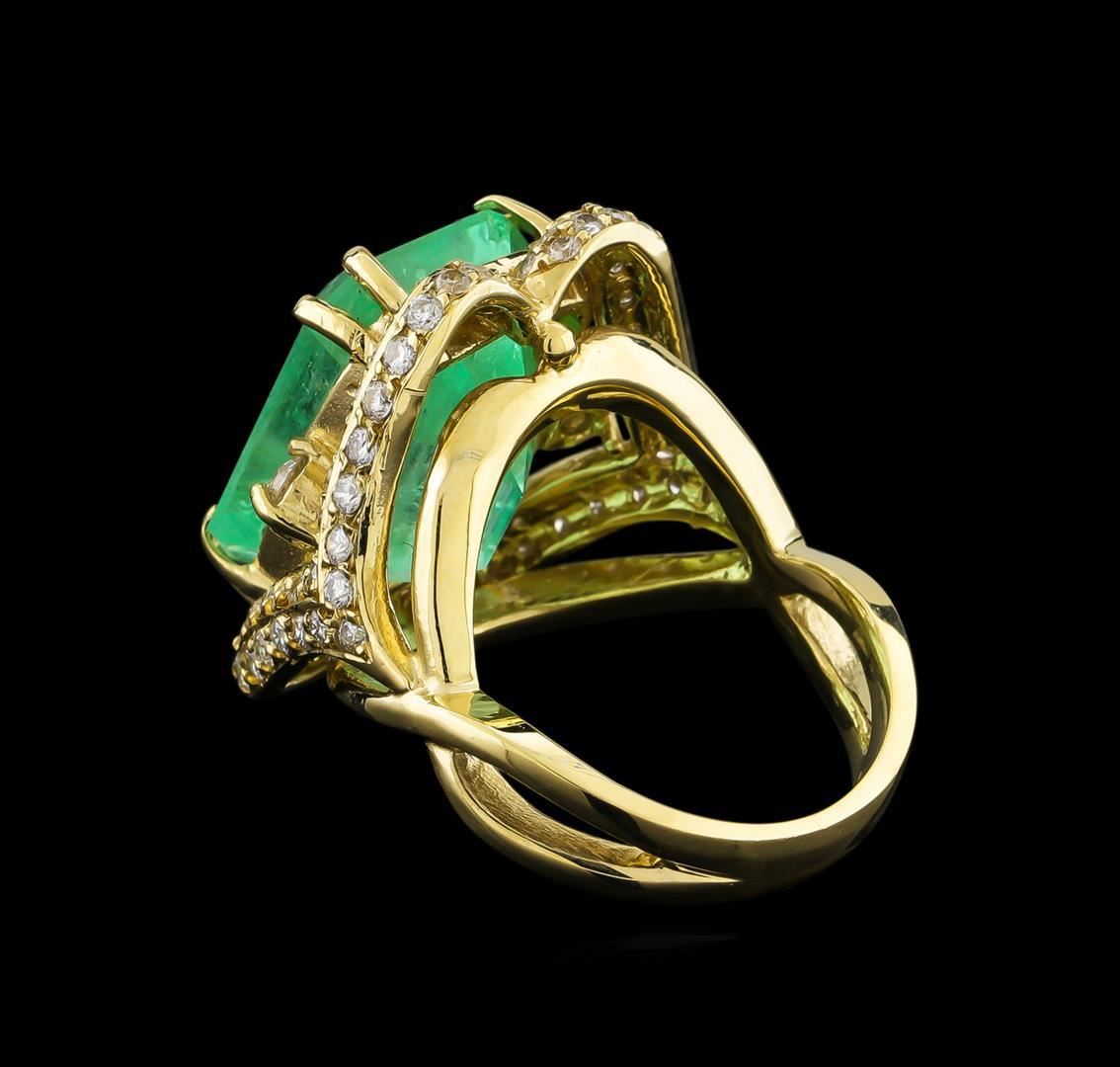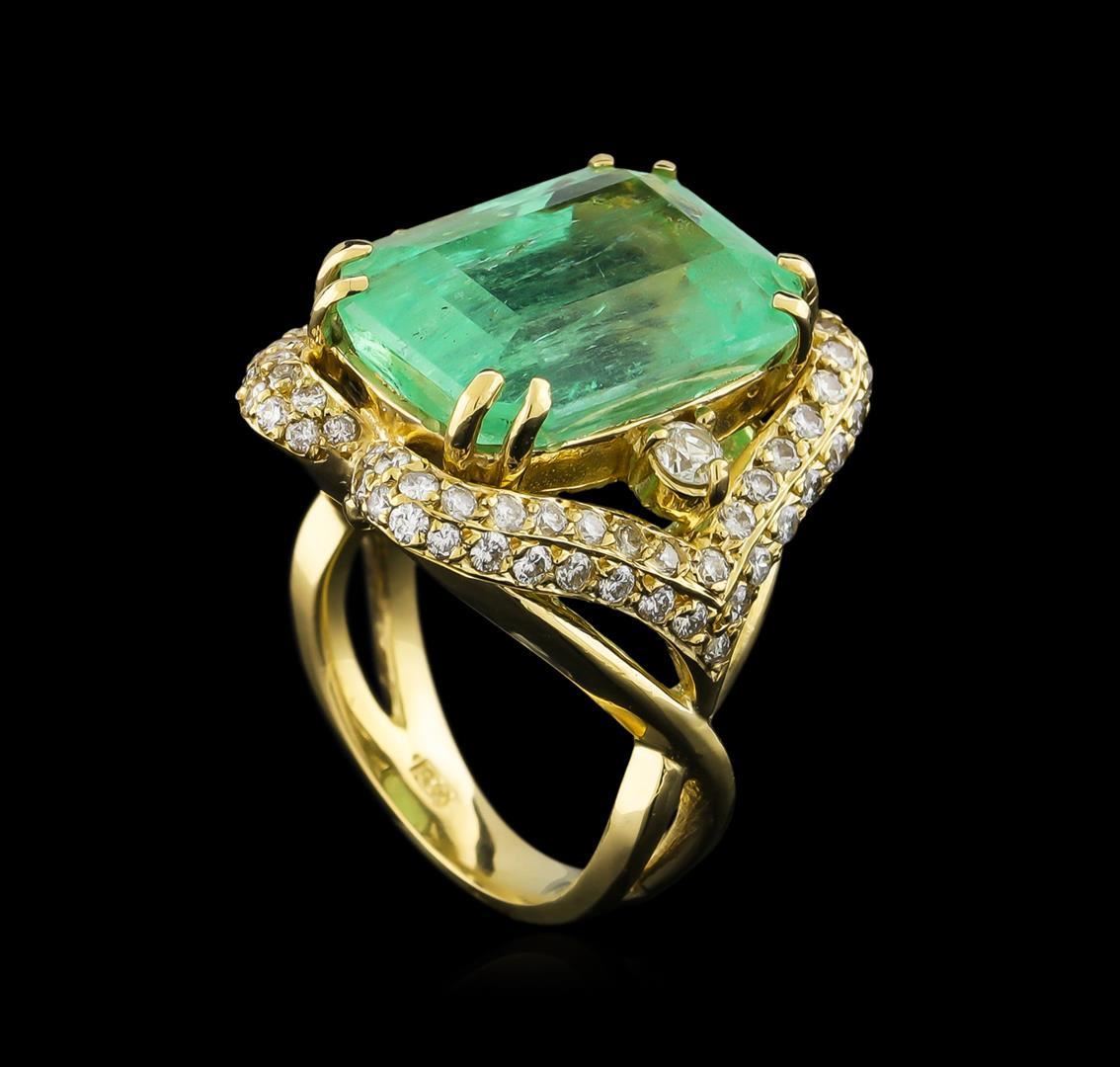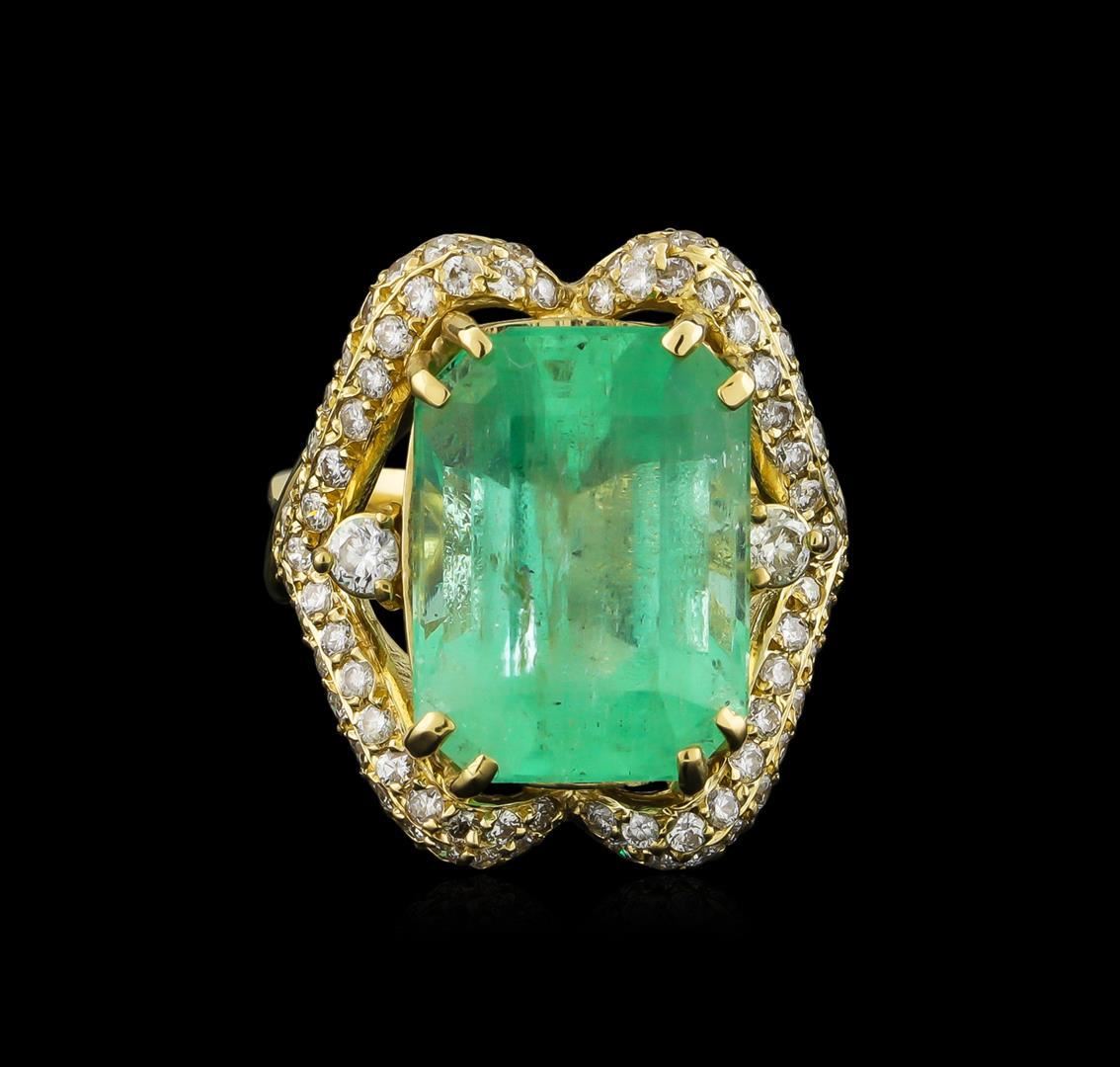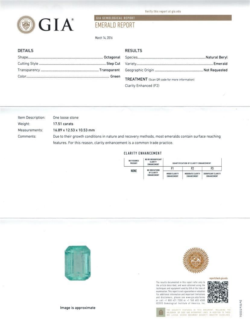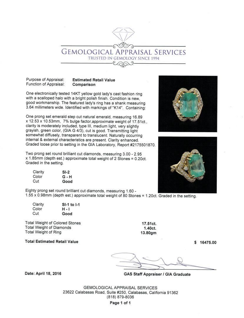 One electronically tested 14KT yellow gold lady's cast fashion ring with a scalloped halo with a bright polish finish. The featured lady's ring has a shank measuring 3.64 millimeters wide. Identified with markings of "K14". Condition is new, good workmanship. Containing: One prong set emerald step cut natural emerald, measuring 16.89 x 12.53 x 10.53mm, 7%. bulge factor, approximate weight of 17.51ct., clarity is moderately included, type III, medium light, very slightly grayish, green color, (GIA G 4/3), cut is good. Transmitting light somewhat diffusely, transparent to translucent. Naturally occurring internal & external characteristics are present. Clarity enhanced. Graded loose prior to setting in the GIA Laboratory, Report #2175501870.Two prong set round brilliant cut diamonds, measuring 3.00 - 2.95 x 1.85mm (depth est.) approximate total weight of 2 Stones = 0.20ct. Graded in the setting. Clarity: SI-2. Color: G - Good Eighty prong set round brilliant cut diamonds, measuring 1.60 - 1.55 x 0.98mm (depth est.) approximate total weight of 80 Stones = 1.20ct. Graded in the setting. Clarity: SI-1 to I-1. Color: H - I. Cut Good. Total Weight of Colored Stones 17.51ct. Total Weight of Diamonds 1.40ct. Total Weight of Ring 13.80gm. GAS Appraised.