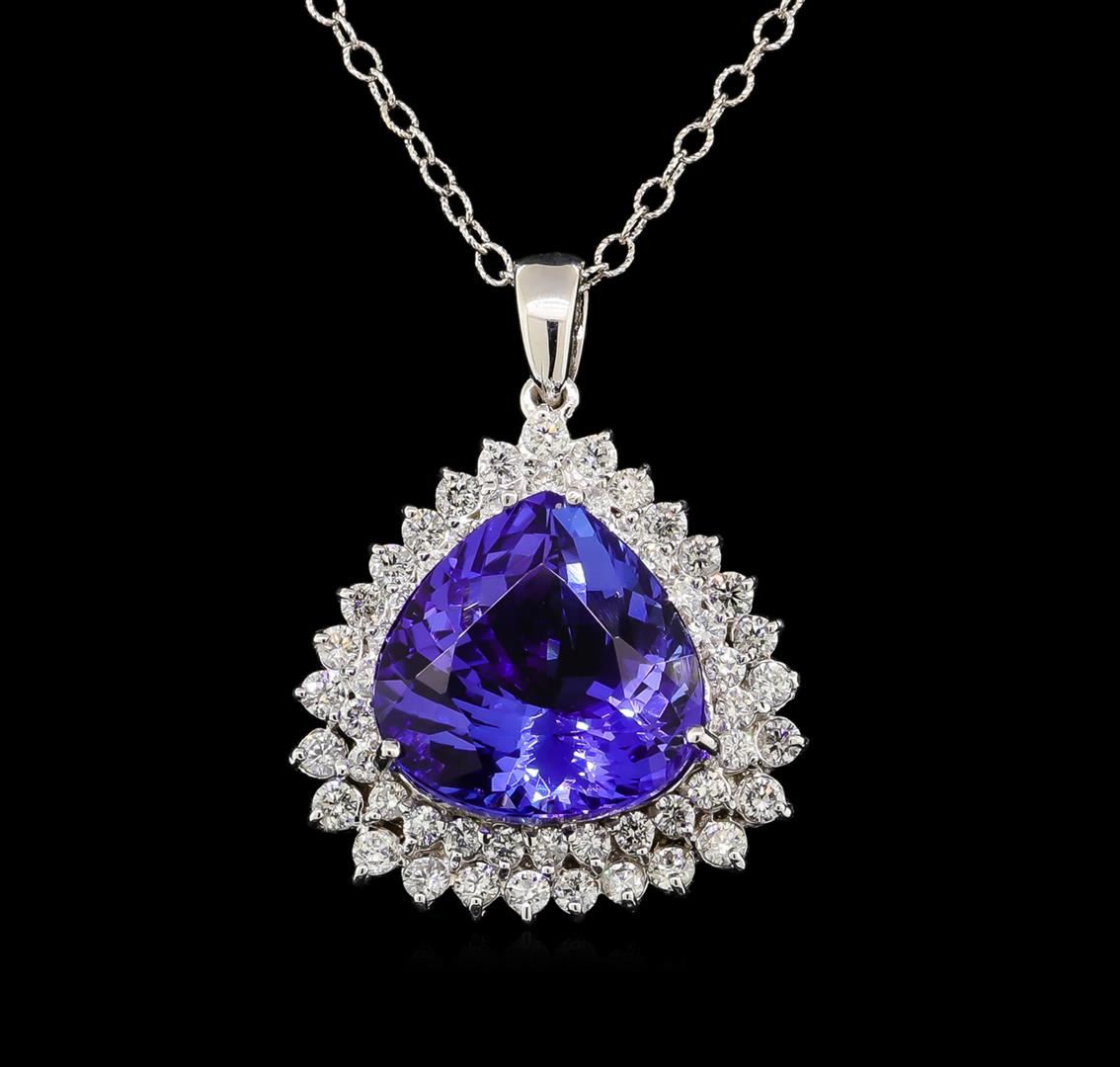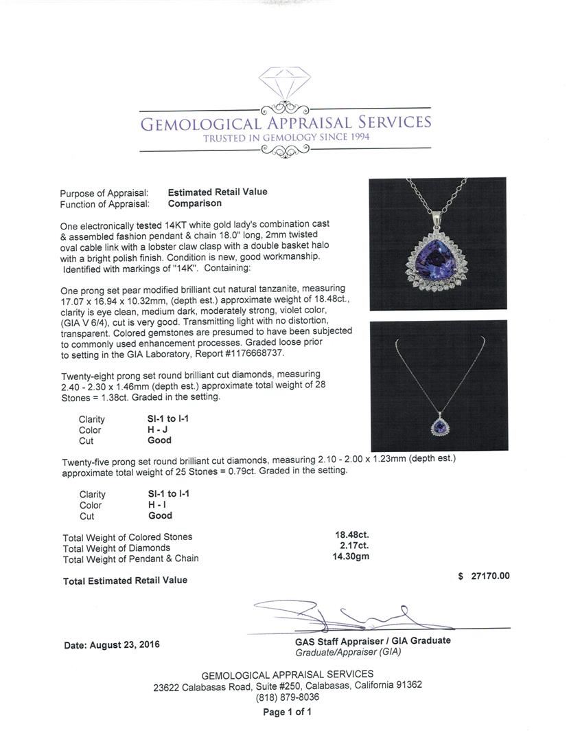 One electronically tested 14KT white gold lady's combination cast & assembled fashion pendant & chain 18.0' long, 2mm twisted oval cable link with a lobster claw clasp with a double basket halo with a bright polish finish. Identified with markings of '14K'. Condition is new, good workmanship. Containing: One prong set pear modified brilliant cut natural tanzanite, measuring 17.07 x 16.94 x 10.32mm, (depth est.) approximate weight of 18.48ct., clarity is eye clean, medium dark, moderately strong, violet color, (GIA V 6/4), cut is very good. Transmitting light with no distortion, transparent. Colored gemstones are presumed to have been subjected to commonly used enhancement processes. Graded loose prior to setting in the GIA Laboratory, Report #1176668737. Twenty-Eight prong set round brilliant cut diamonds, measuring 2.40 - 2.30 x 1.46mm (depth est.) approximate total weight of 28 Stones = 1.38ct. Graded in the setting. Clarity SI-1 to I-1. Color: H - J Cut Good Twenty-Five prong set round brilliant cut diamonds, measuring 2.10 - 2.00 x 1.23mm (depth est.) approximate total weight of 25 Stones = 0.79ct. Graded in the setting. Clarity SI-1 to I-1. Color: H - I Cut Good. Total Weight of Colored Stones 18.48ct.. Total Weight of Diamonds 2.17ct.. Total Weight of Pendant & Chain 14.30gm. GAS Appraised at $27,170.00.