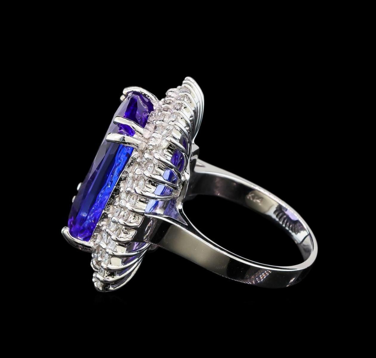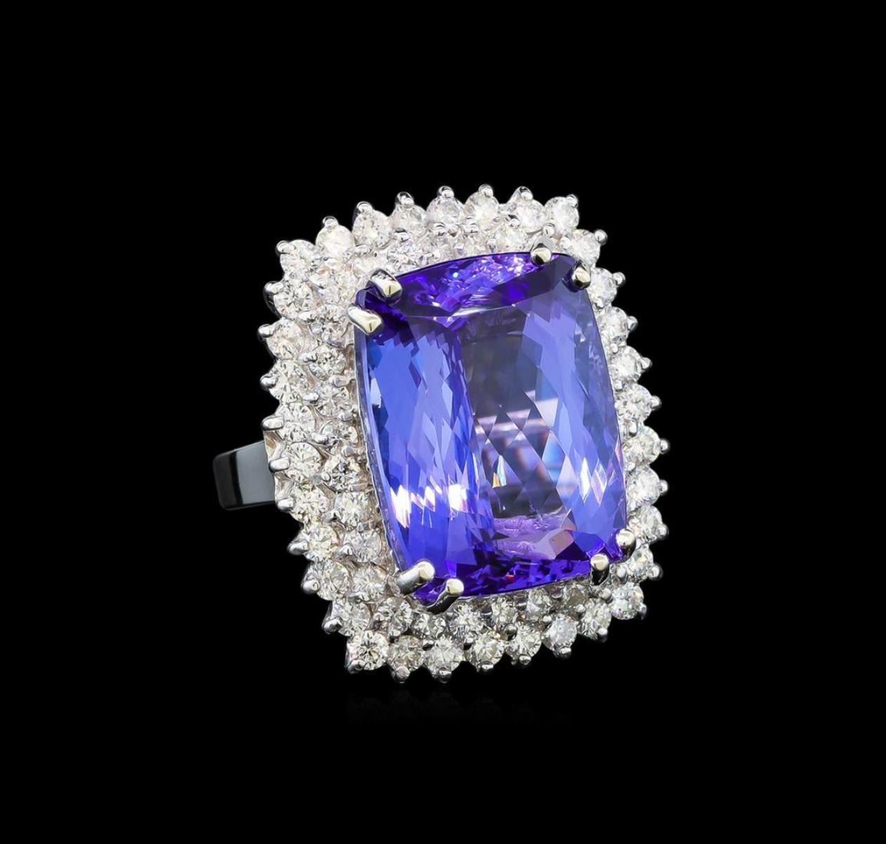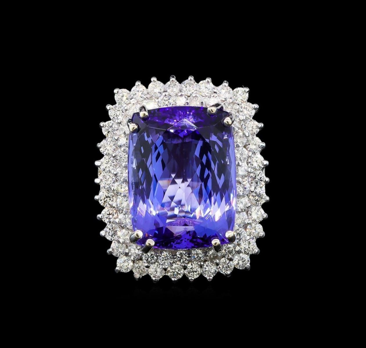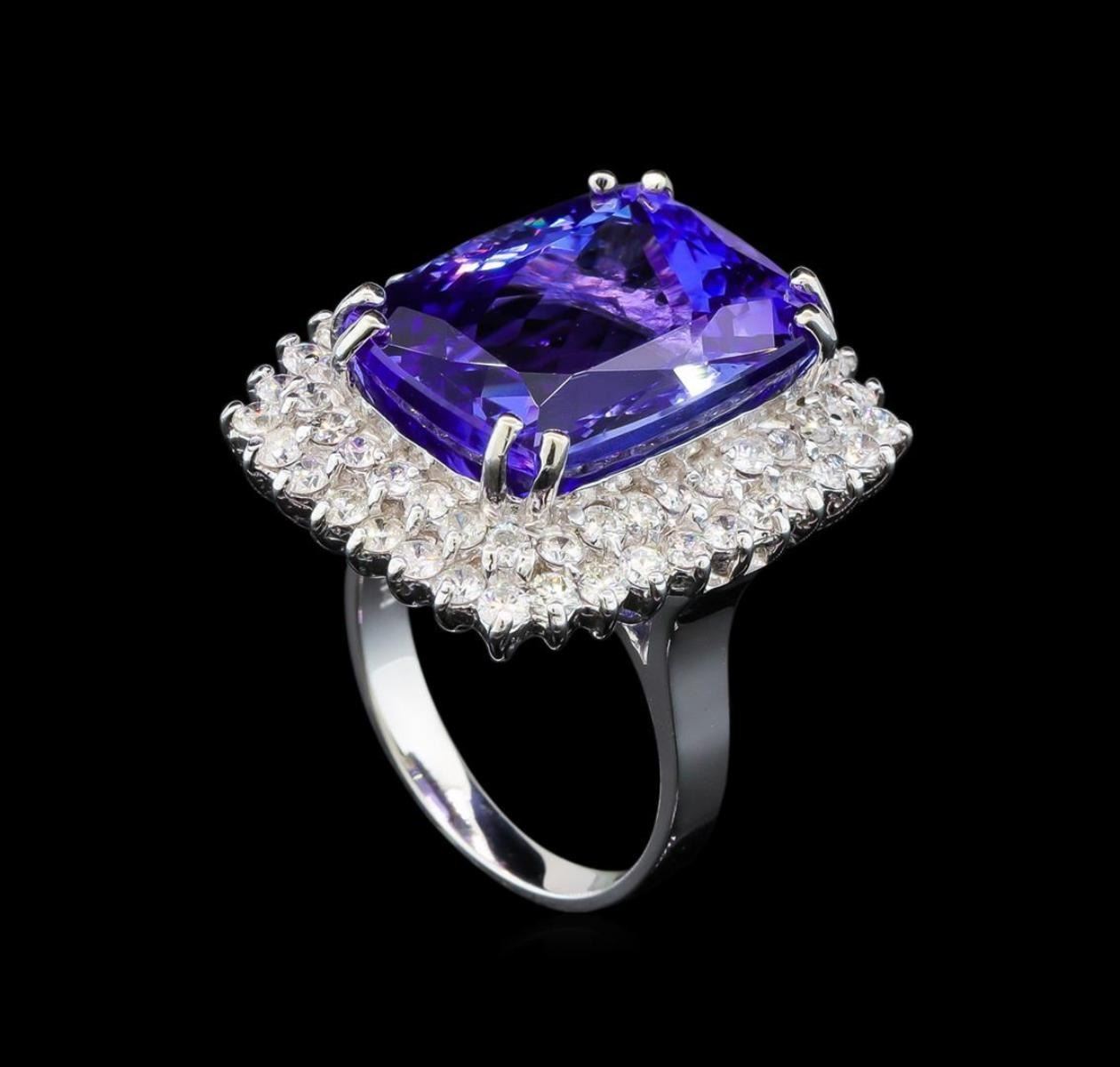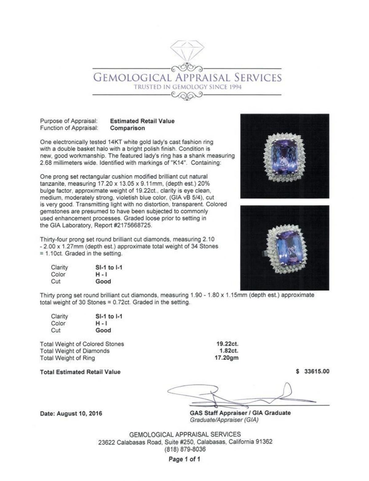 One electronically tested 14KT white gold lady's cast fashion ring with a double basket halo with a bright polish finish. The featured lady's ring has a shank measuring 2.68 millimeters wide. Identified with markings of 'K14'. Condition is new, good workmanship. Containing: One prong set rectangular cushion modified brilliant cut natural tanzanite, measuring 17.20 x 13.05 x 9.11mm, (depth est.) 20%. bulge factor, approximate weight of 19.22ct., clarity is eye clean, medium, moderately strong, violetish blue color, (GIA vB 5/4), cut is very good. Transmitting light with no distortion, transparent. Colored gemstones are presumed to have been subjected to commonly used enhancement processes. Graded loose prior to setting in the GIA Laboratory, Report #2175668725. Thirty-Four prong set round brilliant cut diamonds, measuring 2.10 - 2.00 x 1.27mm (depth est.) approximate total weight of 34 Stones = 1.10ct. Graded in the setting. Clarity SI-1 to I-1. Color: H - I Cut Good Thirty prong set round brilliant cut diamonds, measuring 1.90 - 1.80 x 1.15mm (depth est.) approximate total weight of 30 Stones = 0.72ct. Graded in the setting. Clarity SI-1 to I-1. Color: H - I Cut Good. Total Weight of Colored Stones 19.22ct.. Total Weight of Diamonds 1.82ct.. Total Weight of Ring 17.20gm. GAS Appraised.