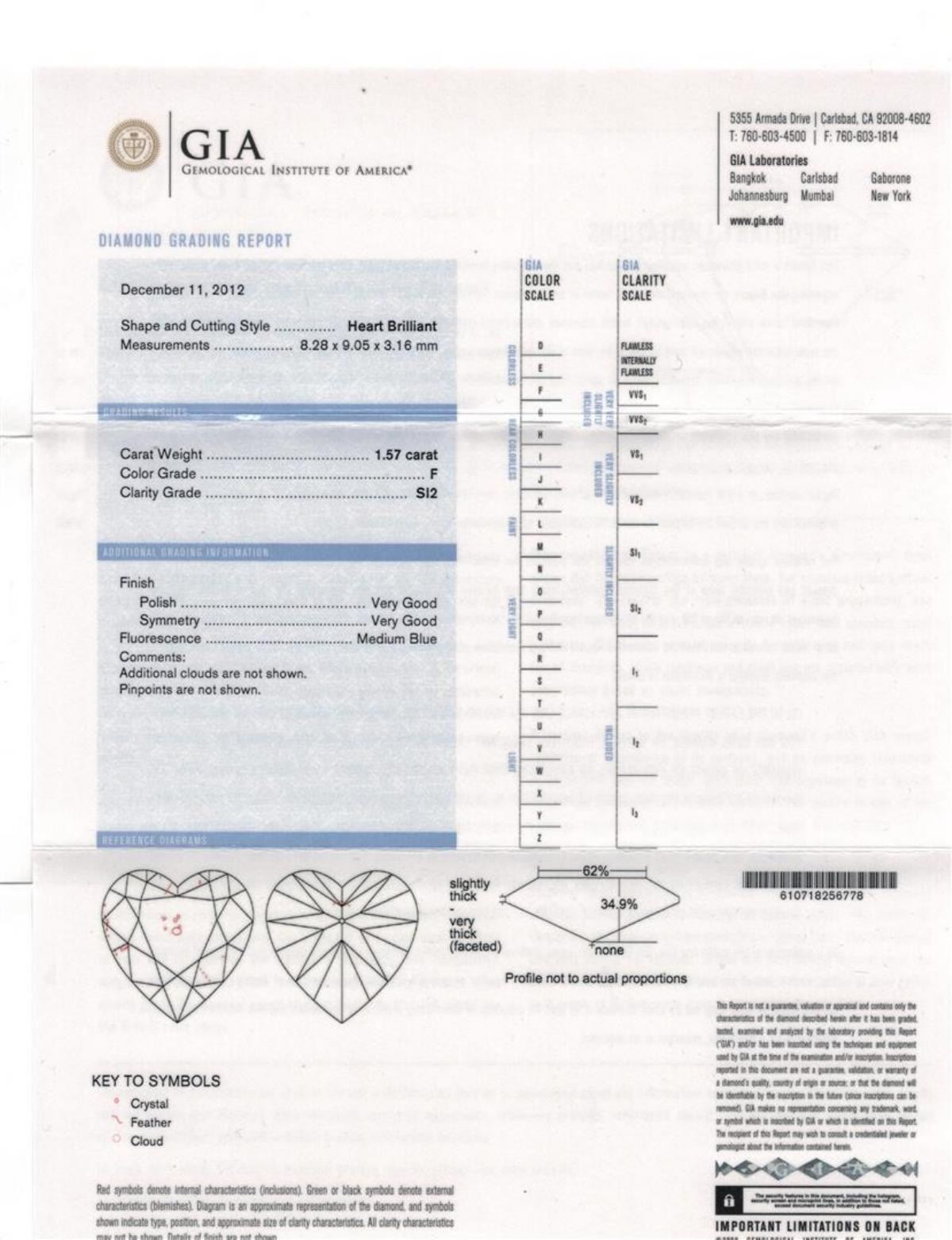 One electronically tested 14KT white gold lady's combination cast & assembled fashion heart shape pendant & chain 18.0' long, 1.3mm round cable link with a lobster claw clasp with a bright polish finish. Identified with markings of '14K'. Condition is new, good workmanship. Containing: One prong set heart shaped cut diamond, measuring 8.28 x 9.05 x 3.16mm (depth est.) , 10.00.%. GTCF approximate weight of 1.57ct. Graded loose prior to setting in the GIA Laboratory, Report #6157154429. Clarity SI-2. Color: F Cut Very Good Sixteen channel set round brilliant cut diamonds, measuring 2.30 - 2.20 x 1.37mm (depth est.) approximate total weight of 16 Stones = 0.67ct. Graded in the setting. Clarity VS-2 to SI-1. Color: G - H Cut Good. Total Weight of Diamonds 2.24ct.. Total Weight of Pendant & Chain 5.60gm. GAS Appraised.