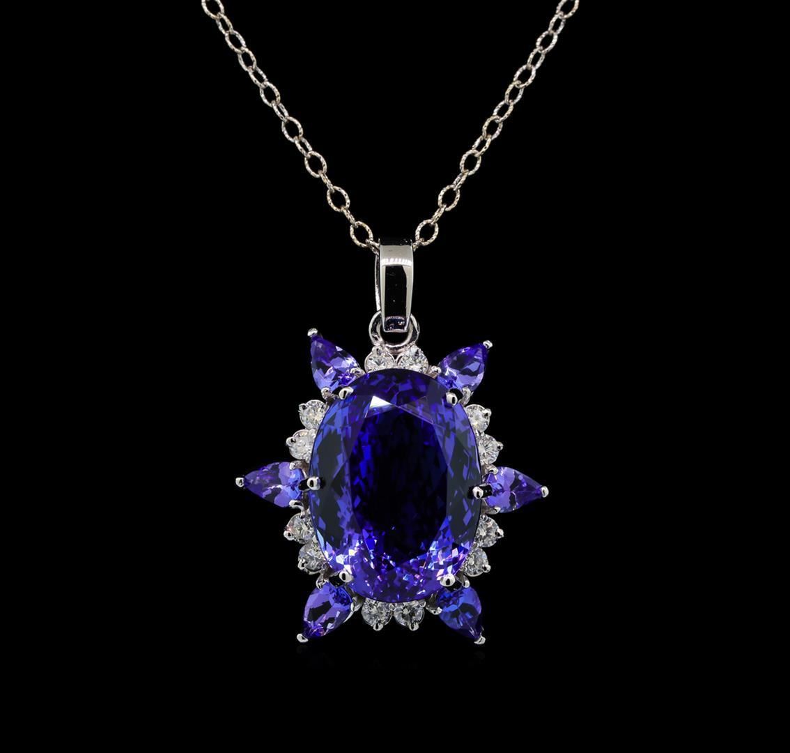 One electronically tested 14KT white gold lady's combination cast & assembled starburst design pendant & chain 18.0' long, 2mm twisted oval cable link with a lobster claw clasp with a bright polish finish. Identified with markings of '14K'. Condition is new, good workmanship. Containing: One prong set oval modified brilliant cut natural tanzanite, measuring 20.33 x 15.17 x 10.79mm, (depth est.) 12%. bulge factor, approximate weight of 26.20ct., clarity is eye clean, medium, moderately strong, bluish violet color, (GIA bV 5/4), cut is very good. Transmitting light with no distortion, transparent. Colored gemstones are presumed to have been subjected to commonly used enhancement processes. Graded loose prior to setting in the GIA Laboratory, Report #2175668767. Six prong set pear modified brilliant cut natural tanzanites, measuring 6.00 x 4.00 x 2.30mm, (depth est.) approximate total weight of 2.23ct., clarity is eye clean, medium, moderately strong, bluish violet color, (GIA bV 5/4), cut is good. Transmitting light with no distortion, transparent. Colored gemstones are presumed to have been subjected to commonly used enhancement processes. Graded in the setting. Twelve prong set round brilliant cut diamonds, measuring 2.60 - 2.50 x 1.53mm (depth est.) approximate total weight of 12 Stones = 0.72ct. Graded in the setting. Clarity SI-1 to I-1. Color: H - I Cut Good. Total Weight of Colored Stones 28.43ct.. Total Weight of Diamonds 0.72ct.. Total Weight of Pendant & Chain 14.40gm. GAS Appraised.