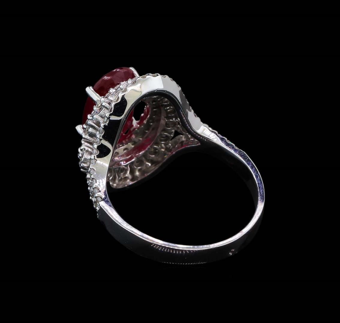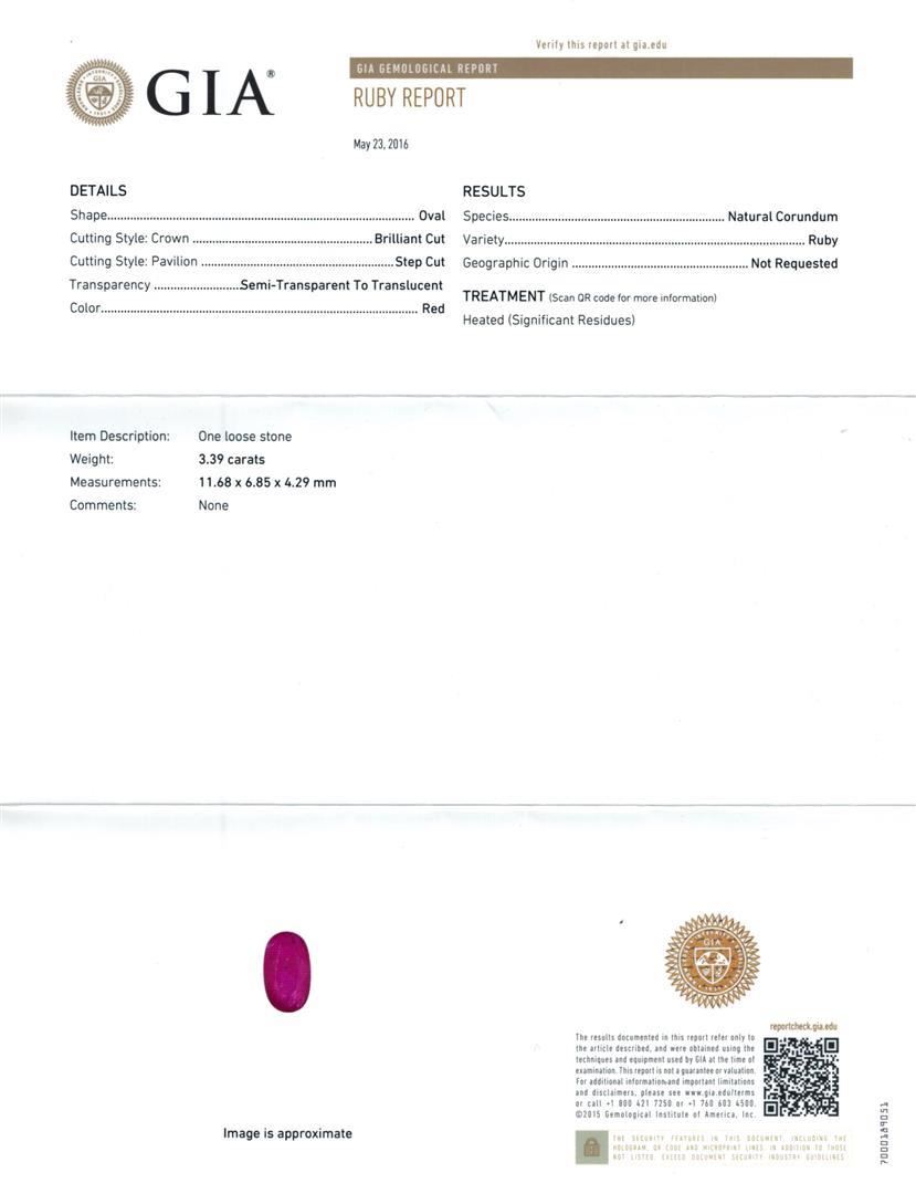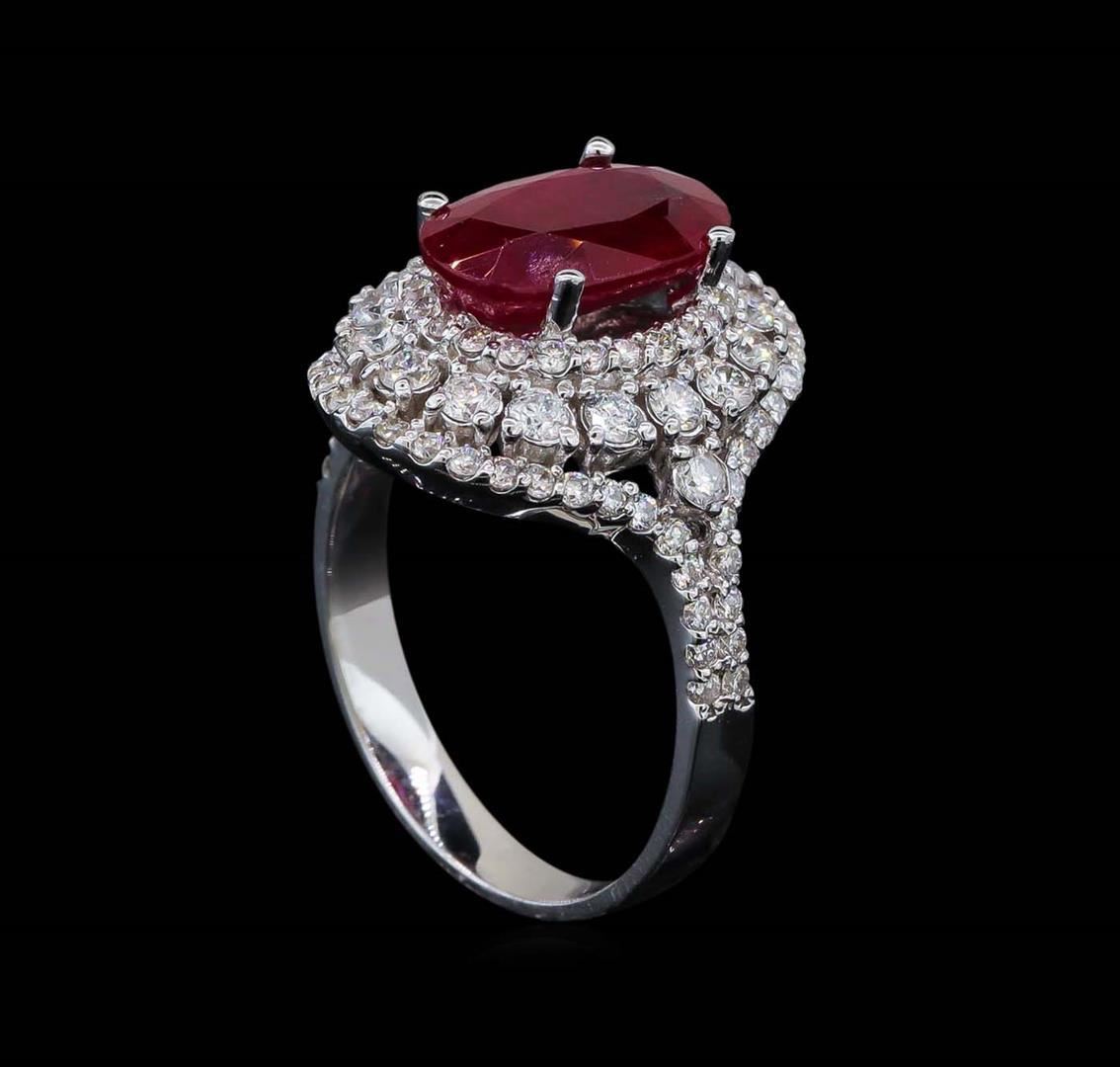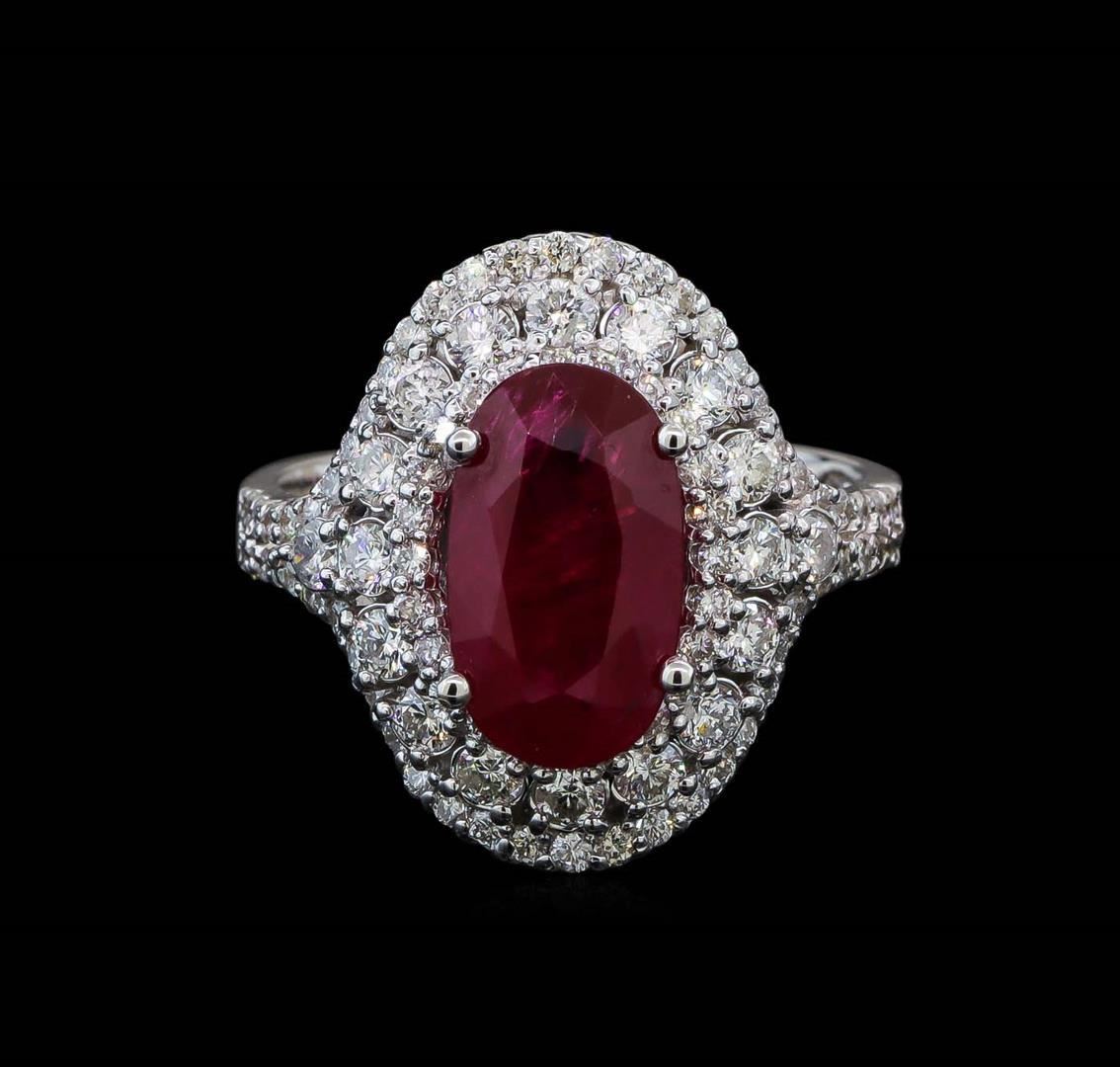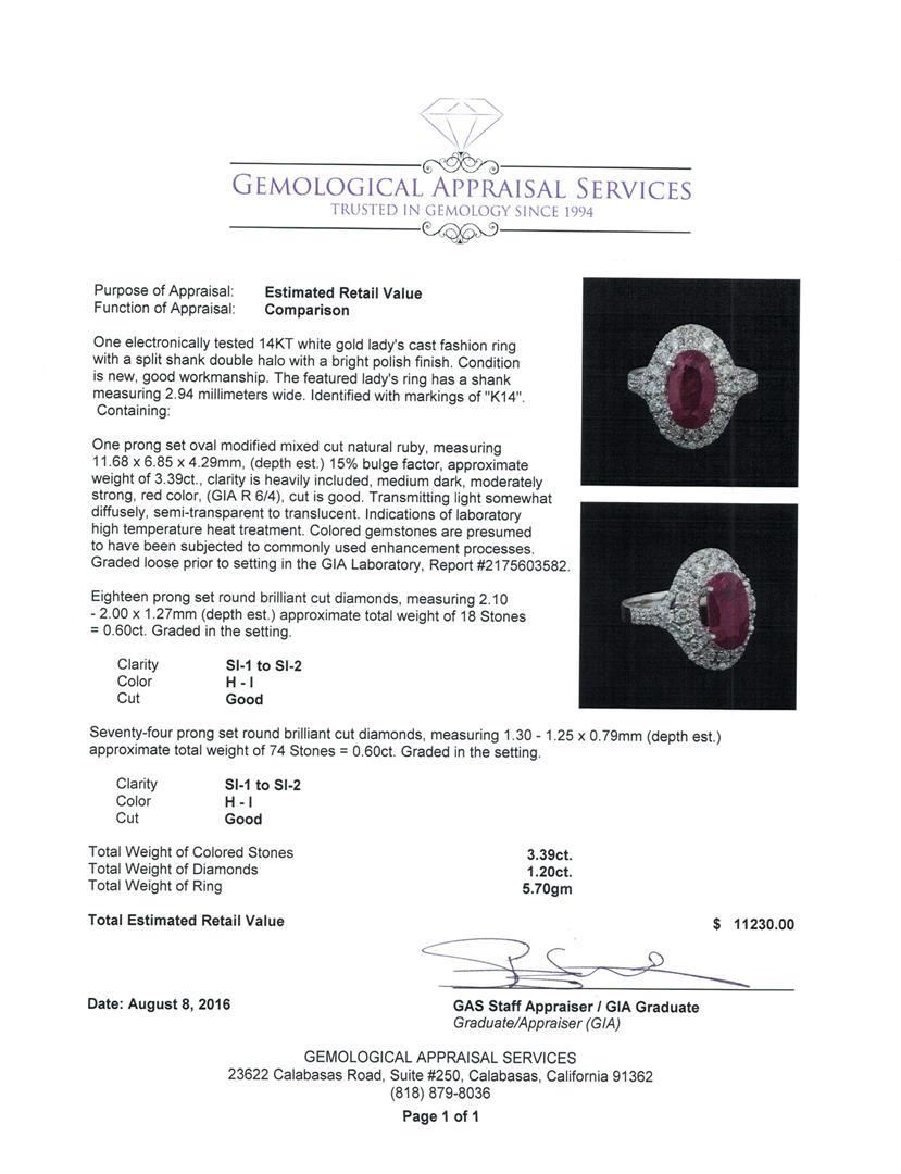 One electronically tested 14KT white gold lady's cast fashion ring with a split shank double halo with a bright polish finish. The featured lady's ring has a shank measuring 2.94 millimeters wide. Identified with markings of 'K14'. Condition is new, good workmanship. Containing: One prong set oval modified mixed cut natural ruby, measuring 11.68 x 6.85 x 4.29mm, (depth est.) 15%. bulge factor, approximate weight of 3.39ct., clarity is heavily included, medium dark, moderately strong, red color, (GIA R 6/4), cut is good. Transmitting light somewhat diffusely, semi-transparent to translucent. Indications of laboratory high temperature heat treatment. Colored gemstones are presumed to have been subjected to commonly used enhancement processes. Graded loose prior to setting in the GIA Laboratory, Report #2175603582. Eighteen prong set round brilliant cut diamonds, measuring 2.10 - 2.00 x 1.27mm (depth est.) approximate total weight of 18 Stones = 0.60ct. Graded in the setting. Clarity SI-1 to SI-2. Color: H - I Cut Good Seventy-Four prong set round brilliant cut diamonds, measuring 1.30 - 1.25 x 0.79mm (depth est.) approximate total weight of 74 Stones = 0.60ct. Graded in the setting. Clarity SI-1 to SI-2. Color: H - I Cut Good. Total Weight of Colored Stones 3.39ct.. Total Weight of Diamonds 1.20ct.. Total Weight of Ring 5.70gm. GAS Appraised.