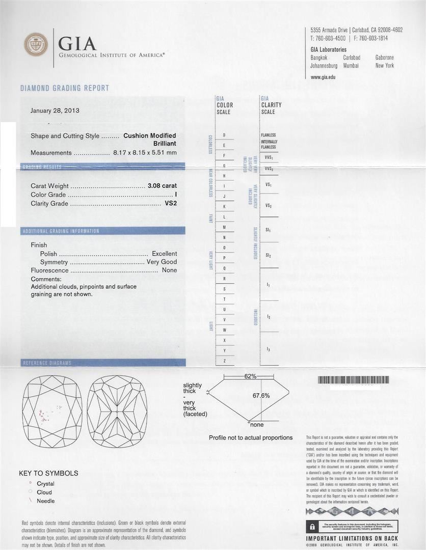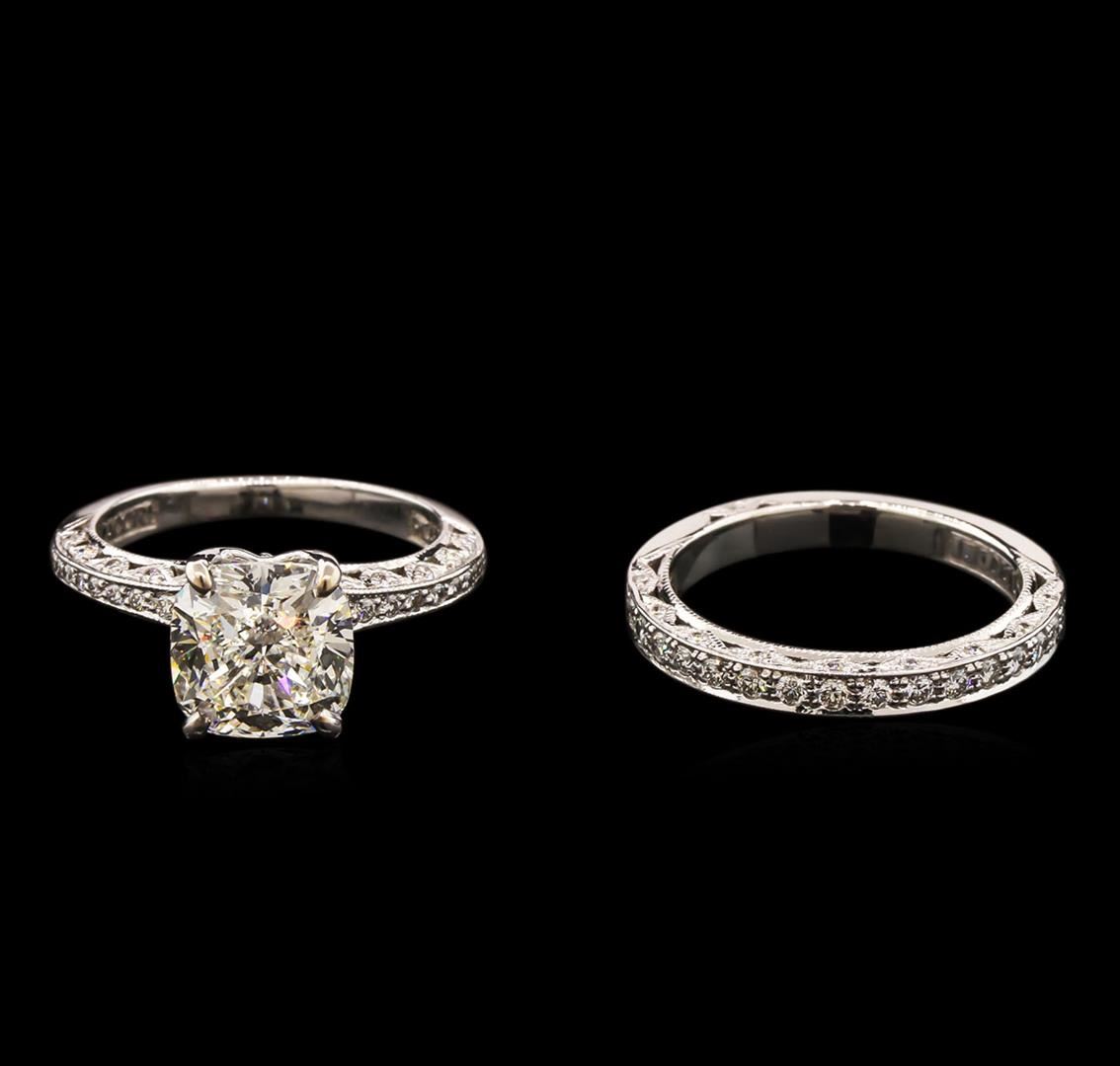 One electronically tested 18KT-platinum white gold lady's combination cast & assembled vintage ring & wedding band with a cathedral shank with a bright polish with milgrain detailing finish. The featured ladies wedding set has the engagement ring made of platinum and the wedding band made of 18K white gold, with a double shank measuring 5.20 millimeters wide. Trademark is Tacori. Identified with markings of "PLAT-18K". Condition is new, good workmanship. Containing: One prong set cushion cut diamond, measuring 8.17 x 8.15 x 5.51mm (depth est.) approximate weight of 3.08ct. Graded loose prior to setting in the GIA Laboratory, Report #5146540983. Graded in the setting. Clarity: VS-2. Color: I. Cut Very Good. Seventeen prong set round brilliant cut diamonds, measuring 1.50 - 1.45 x 0.96mm (depth est.) approximate total weight of 17 Stones = 0.22ct. Graded in the setting. Clarity: VS-1 to VS-2. Color: G - H. Cut Very Good. Sixty-Eight prong set round brilliant cut diamonds, measuring 1.20 - 1.10 x 0.75mm (depth est.) approximate total weight of 68 Stones = 0.45ct. Graded in the setting. Clarity: VS-1 to VS-2. Color: G - H. Cut Very Good. Total Weight of Diamonds 3.75ct. Total Weight of Ring & Wedding Band 8.90gm. GAS Appraised at $84,980.00.