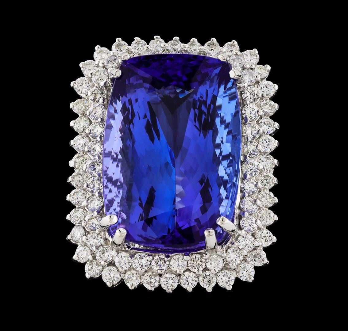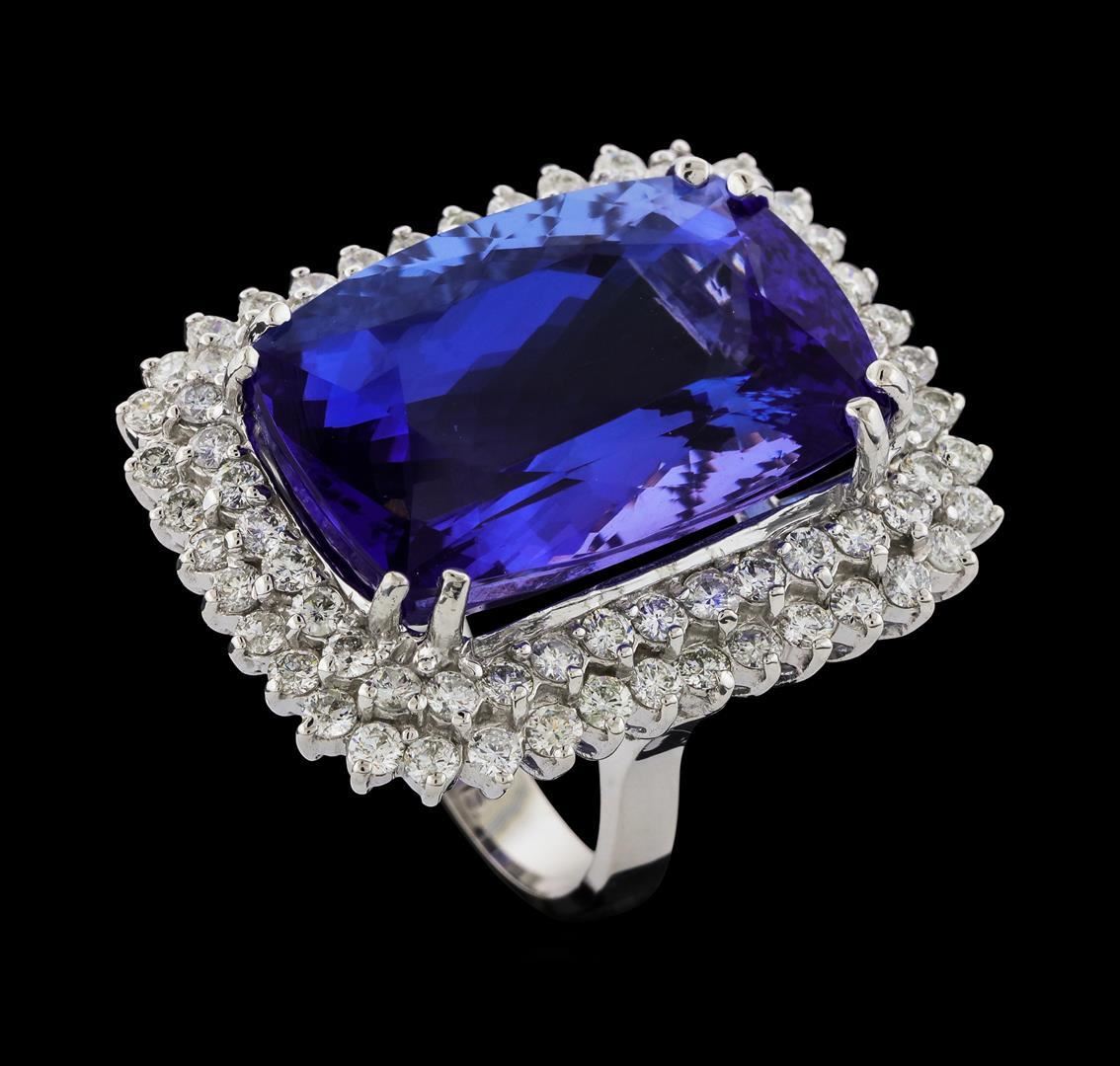 One electronically tested 14KT white gold lady's cast fashion ring with a double basket halo with a bright polish finish. The featured lady's ring has a shank measuring 3.75 millimeters wide. Identified with markings of 'K14'. Condition is new, good workmanship. Containing: One prong set rectangular cushion modified brilliant cut natural tanzanite, measuring 23.71 x 16.25 x 11.66mm, (depth est.) 8%. bulge factor, approximate weight of 38.29ct., clarity is eye clean, medium, very slightly grayish, violetish blue color, (GIA vB 5/3), cut is very good. Transmitting light with no distortion, transparent. Colored gemstones are presumed to have been subjected to commonly used enhancement processes. Graded loose prior to setting in the GIA Laboratory, Report #2171847497. Seventy-Six prong set round brilliant cut diamonds, measuring 2.10 - 2.00 x 1.27mm (depth est.) approximate total weight of 76 Stones = 2.49ct. Graded in the setting. Clarity SI-1 to SI-3. Color: H - I Cut Good. Total Weight of Colored Stones 38.29ct.. Total Weight of Diamonds 2.49ct.. Total Weight of Ring 20.00gm. GAS Appraised.