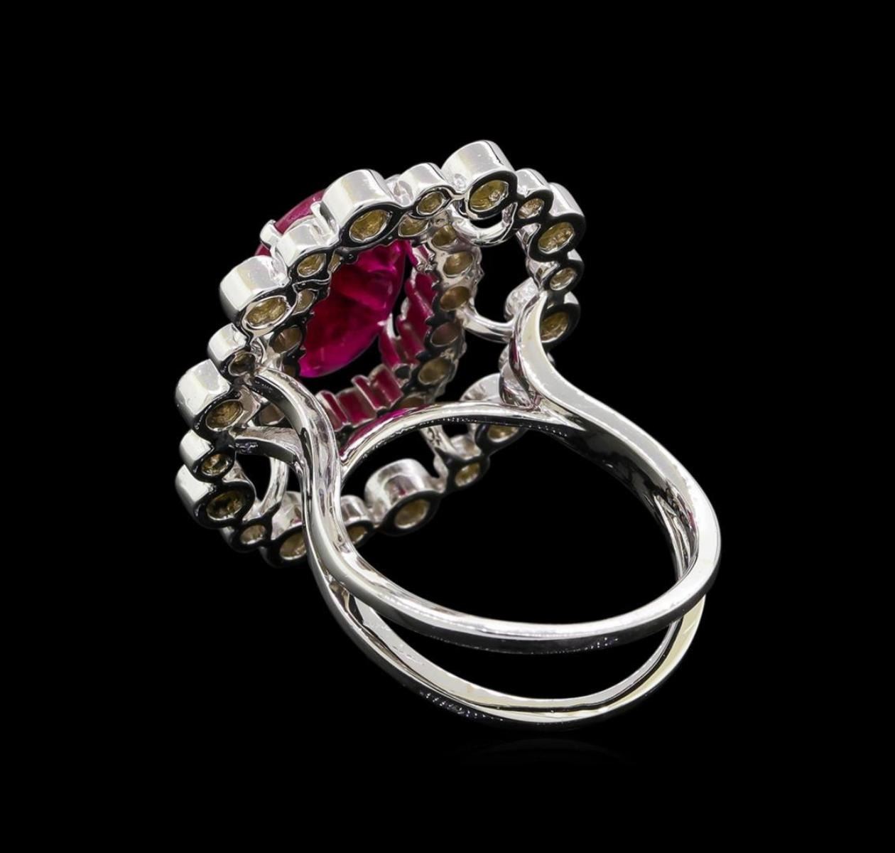 One electronically tested 14KT white gold lady's cast fashion ring with a double halo with a bright polish finish. The featured lady's ring has a split double shank measuring 6.62 millimeters wide. Identified with markings of 'K14'. Condition is new, good workmanship. Containing: One prong set oval modified mixed cut natural ruby, measuring 12.83 x 8.63 x 3.66mm, (depth est.) 15%. bulge factor, approximate weight of 4.22ct., clarity is heavily included, medium dark, very slightly brownish, strongly purplish red color, (GIA stpR 6/3), cut is good. Transmitting light somewhat diffusely, semi-transparent to translucent. Naturally occurring internal & external characteristics are present. Colored gemstones are presumed to have been subjected to commonly used enhancement processes. Graded loose prior to setting in the GIA Laboratory, Report #1176603130. Twenty-Six prong set round brilliant cut diamonds, measuring 2.40 - 2.30 x 1.46mm (depth est.) approximate total weight of 26 Stones = 1.30ct. Graded in the setting. Clarity SI-1 to SI-2. Color: H - I Cut Good Ten bezel set round brilliant cut diamonds, measuring 1.70 - 1.60 x 1.02mm (depth est.) approximate total weight of 10 Stones = 0.18ct. Graded in the setting. Clarity SI-1 to SI-2. Color: H - I Cut Good. Total Weight of Colored Stones 4.22ct.. Total Weight of Diamonds 1.48ct.. Total Weight of Ring 8.00gm. GAS Appraised.