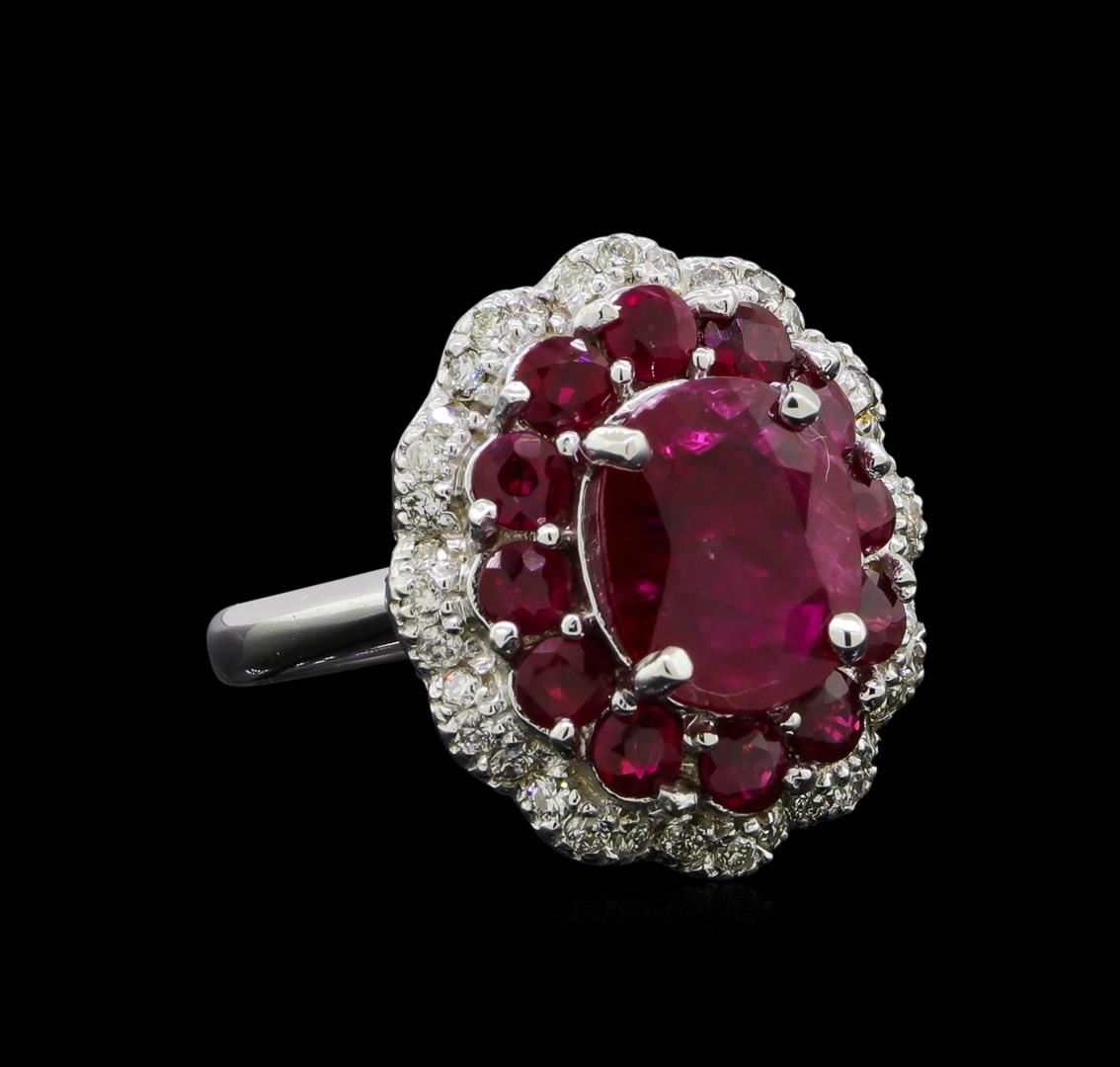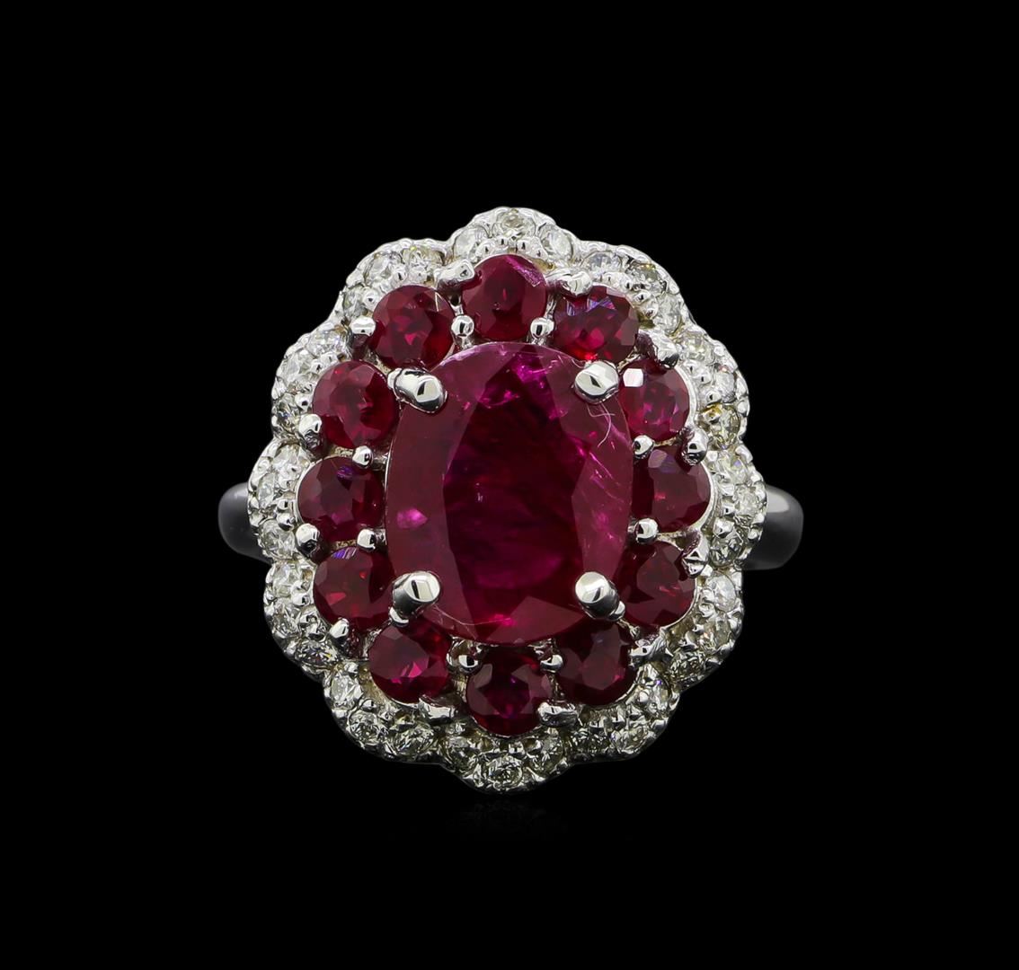 One electronically tested 14KT white gold lady's cast fashion ring with a scalloped double basket halo with a bright polish finish. The featured lady's ring has a shank measuring 2.31 millimeters wide. Identified with markings of 'K14'. Condition is new, good workmanship. Containing: One prong set oval modified mixed cut natural ruby, measuring 10.08 x 8.17 x 3.41mm, (depth est.) 25%. bulge factor, approximate weight of 2.94ct., clarity is heavily included, medium dark, moderately strong, red color, (GIA R 6/4), cut is good. Transmitting light somewhat diffusely, semi-transparent to translucent. Naturally occurring internal & external characteristics are present. Indications of laboratory high temperature heat treatment. Colored gemstones are presumed to have been subjected to commonly used enhancement processes. Graded loose prior to setting in the GIA Laboratory, Report #2175603142. Twelve prong set round modified brilliant cut natural rubies, measuring 2.90 - 2.85 x 1.87 mm, (depth est.) approximate total weight of 1.60ct., clarity is slightly included, medium dark, moderately strong, red color, (GIA R 6/4), cut is good. Transmitting light with a minimum of distortion, transparent. Indications of laboratory high temperature heat treatment. Colored gemstones are presumed to have been subjected to commonly used enhancement processes. Graded in the setting. Thirty-Six prong set round brilliant cut diamonds, measuring 1.55 - 1.45 x 0.92mm (depth est.) approximate total weight of 36 Stones = 0.45ct. Graded in the setting. Clarity VS-2 to SI-2. Color: H - I Cut Good. Total Weight of Colored Stones 4.54ct.. Total Weight of Diamonds 0.45ct.. Total Weight of Ring 7.80gm. GAS Appraised.