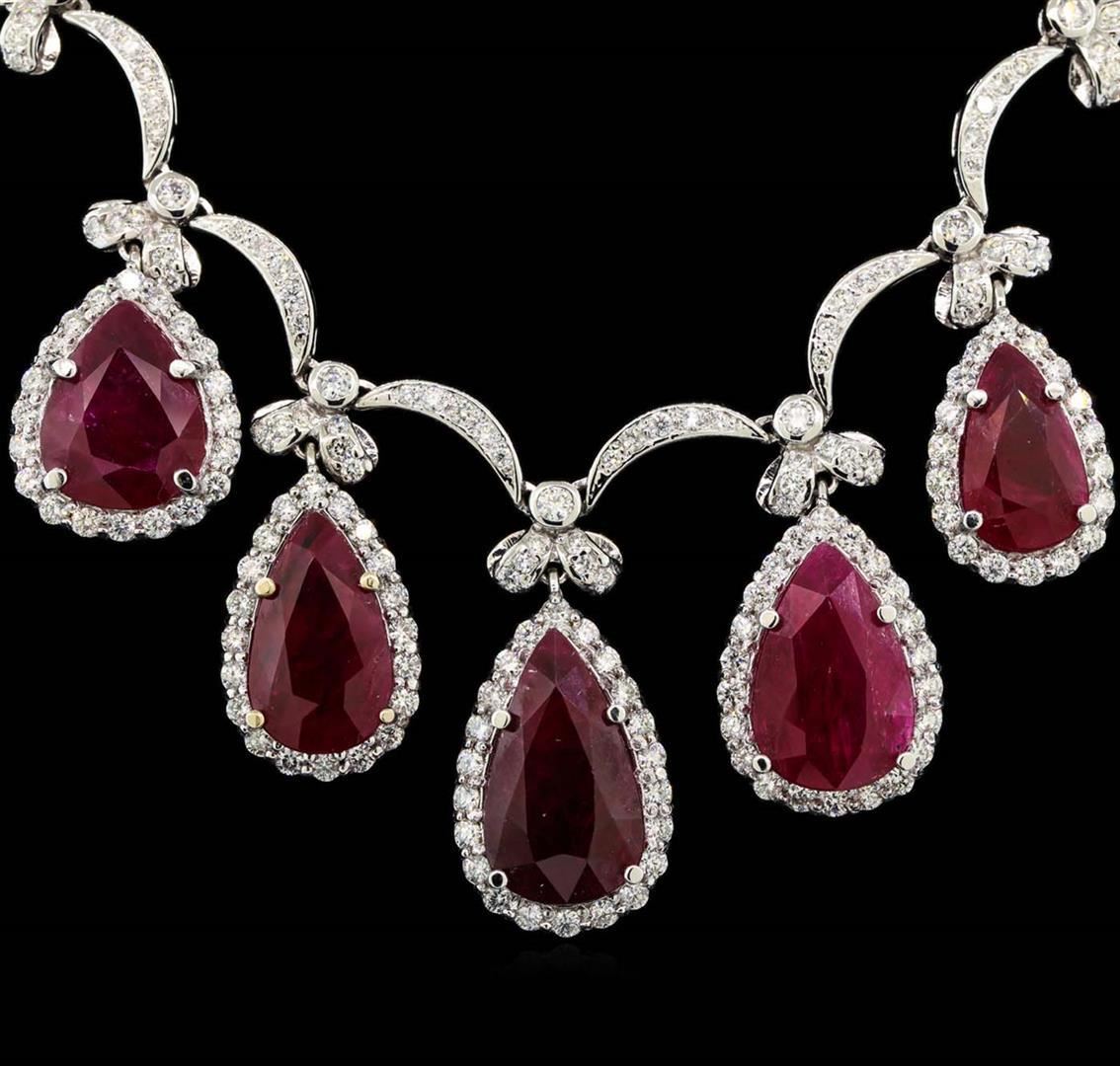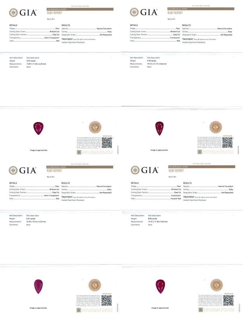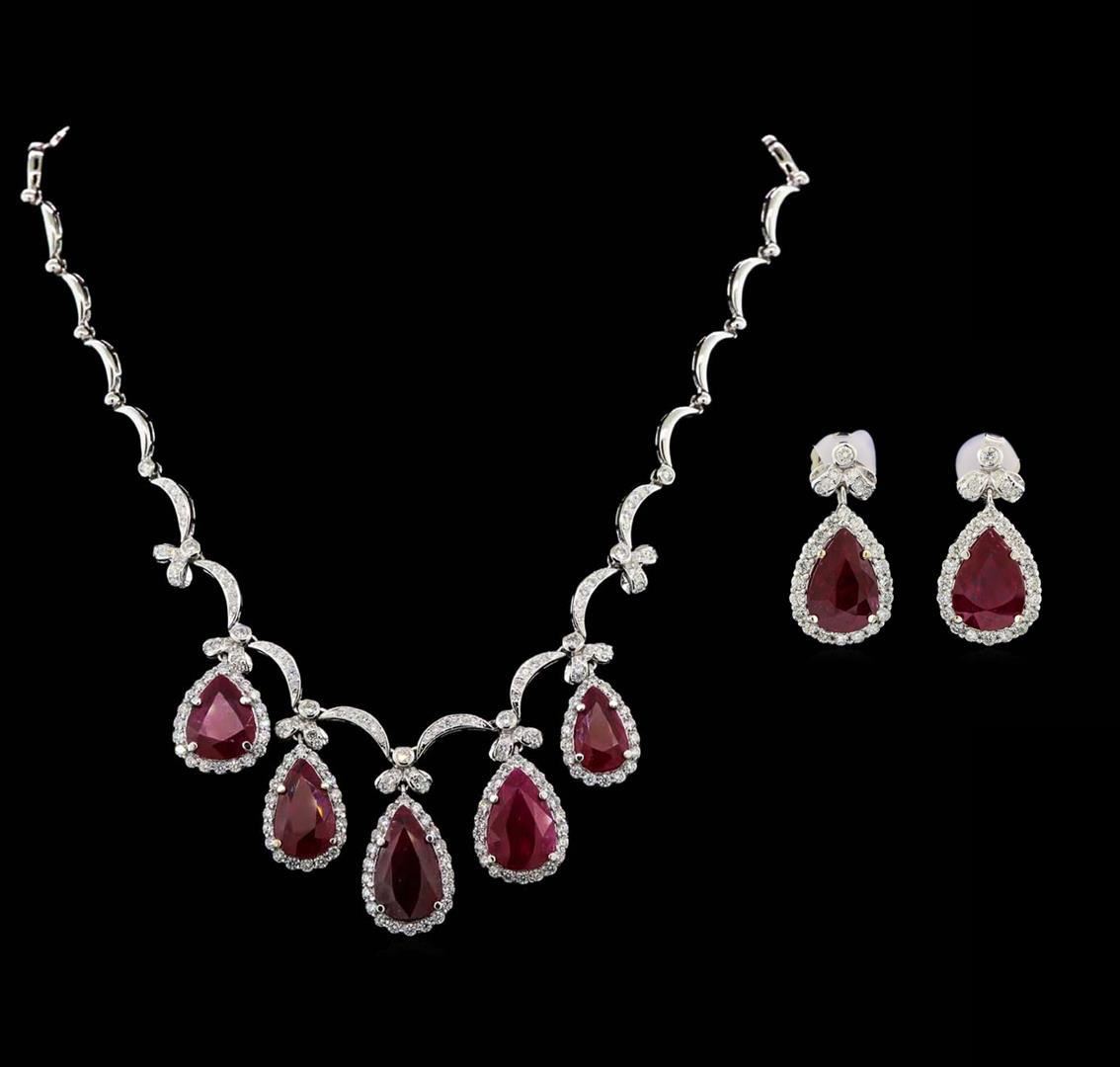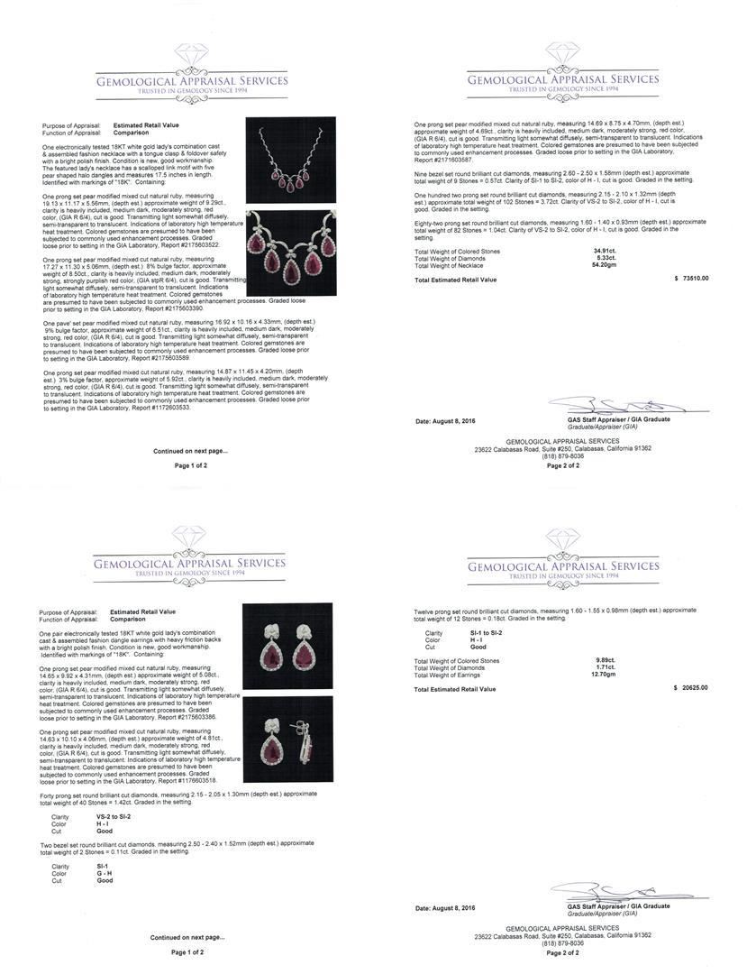 One Suite containing : One pair electronically tested 18KT white gold lady's combination cast & assembled fashion dangle earrings with heavy friction backs with a bright polish finish. Identified with markings of '18K'. Condition is new, good workmanship. Containing: One prong set pear modified mixed cut natural ruby, measuring 14.65 x 9.92 x 4.31mm, (depth est.) approximate weight of 5.08ct., clarity is heavily included, medium dark, moderately strong, red color, (GIA R 6/4), cut is good. Transmitting light somewhat diffusely, semi-transparent to translucent. Indications of laboratory high temperature heat treatment. Colored gemstones are presumed to have been subjected to commonly used enhancement processes. Graded loose prior to setting in the GIA Laboratory, Report #2175603386. One prong set pear modified mixed cut natural ruby, measuring 14.63 x 10.10 x 4.06mm, (depth est.) approximate weight of 4.81ct., clarity is heavily included, medium dark, moderately strong, red color, (GIA R 6/4), cut is good. Transmitting light somewhat diffusely, semi-transparent to translucent. Indications of laboratory high temperature heat treatment. Colored gemstones are presumed to have been subjected to commonly used enhancement processes. Graded loose prior to setting in the GIA Laboratory, Report #1176603518. Forty prong set round brilliant cut diamonds, measuring 2.15 - 2.05 x 1.30mm (depth est.) approximate total weight of 40 Stones = 1.42ct. Graded in the setting. Clarity VS-2 to SI-2. Color: H - I Cut Good Two bezel set round brilliant cut diamonds, measuring 2.50 - 2.40 x 1.52mm (depth est.) approximate total weight of 2 Stones = 0.11ct. Graded in the setting. Clarity SI-1. Color: G - H Cut Good Twelve prong set round brilliant cut diamonds, measuring 1.60 - 1.55 x 0.98mm (depth est.) approximate total weight of 12 Stones = 0.18ct. Graded in the setting. Clarity SI-1 to SI-2. Color: H - I Cut Good. Total Weight of Colored Stones 9.89ct.. Total Weight of Diamonds 1.71ct.. Total Weight of Earrings 12.70gm. One electronically tested 18KT white gold lady's combination cast & assembled fashion necklace with a tongue clasp & foldover safety with a bright polish finish. The featured lady's necklace has a scalloped link motif with five pear shaped halo dangles and measures 17.5 inches in length. Identified with markings of "18K". Condition is new, good workmanship. Containing: One prong set pear modified mixed cut natural ruby, measuring 19.13 x 11.17 x 5.56mm, (depth est.) approximate weight of 9.29ct., clarity is heavily included, medium dark, moderately strong, red color, (GIA R 6/4), cut is good. Transmitting light somewhat diffusely, semi-transparent to translucent. Indications of laboratory high temperature heat treatment. Colored gemstones are presumed to have been subjected to commonly used enhancement processes. Graded loose prior to setting in the GIA Laboratory, Report #2175603522.One prong set pear modified mixed cut natural ruby, measuring 17.27 x 11.30 x 5.06mm, (depth est.) 8%. bulge factor, approximate weight of 8.50ct., clarity is heavily included, medium dark, moderately strong, strongly purplish red color, (GIA stpR 6/4), cut is good. Transmitting light somewhat diffusely, semi-transparent to translucent. Indications of laboratory high temperature heat treatment. Colored gemstones are presumed to have been subjected to commonly used enhancement processes. Graded loose prior to setting in the GIA Laboratory, Report #2175603390.One pave' set pear modified mixed cut natural ruby, measuring 16.92 x 10.16 x 4.33mm, (depth est.) 9%. bulge factor, approximate weight of 6.51ct., clarity is heavily included, medium dark, moderately strong, red color, (GIA R 6/4), cut is good. Transmitting light somewhat diffusely, semi-transparent to translucent. Indications of laboratory high temperature heat treatment. Colored gemstones are presumed to have been subjected to commonly used enhancement processes. Graded loose prior to setting in the GIA Laboratory, Report #2175603589.One prong set pear modified mixed cut natural ruby, measuring 14.87 x 11.45 x 4.20mm, (depth est.) 3%. bulge factor, approximate weight of 5.92ct., clarity is heavily included, medium dark, moderately strong, red color, (GIA R 6/4), cut is good. Transmitting light somewhat diffusely, semi-transparent to translucent. Indications of laboratory high temperature heat treatment. Colored gemstones are presumed to have been subjected to commonly used enhancement processes. Graded loose prior to setting in the GIA Laboratory, Report #1172603533.One prong set pear modified mixed cut natural ruby, measuring 14.69 x 8.75 x 4.70mm, (depth est.) approximate weight of 4.69ct., clarity is heavily included, medium dark, moderately strong, red color, (GIA R 6/4), cut is good. Transmitting light somewhat diffusely, semi-transparent to translucent. Indications of laboratory high temperature heat treatment. Colored gemstones are presumed to have been subjected to commonly used enhancement processes. Graded loose prior to setting in the GIA Laboratory, Report #2171603587.Nine bezel set round brilliant cut diamonds, measuring 2.60 - 2.50 x 1.58mm (depth est.) approximate. Total Weight of 9 Stones = 0.57ct. Graded in the setting. Clarity: SI-1 to SI-2. Color: H - I. Cut Good One Hundred Two prong set round brilliant cut diamonds, measuring 2.15 - 2.10 x 1.32mm (depth est.) approximate. Total Weight of 102 Stones = 3.72ct. Graded in the setting. Clarity: VS-2 to SI-2. Color: H - I. Cut Good Eighty-Two prong set round brilliant cut diamonds, measuring 1.60 - 1.40 x 0.93mm (depth est.) approximate. Total Weight of 82 Stones = 1.04ct. Graded in the setting. Clarity: VS-2 to SI-2. Color: H - I. Cut Good. Total Weight of Colored Stones 34.91ct. Total Weight of Diamonds 5.33ct. Total Weight of Necklace 54.20gm. GAS Appraised.