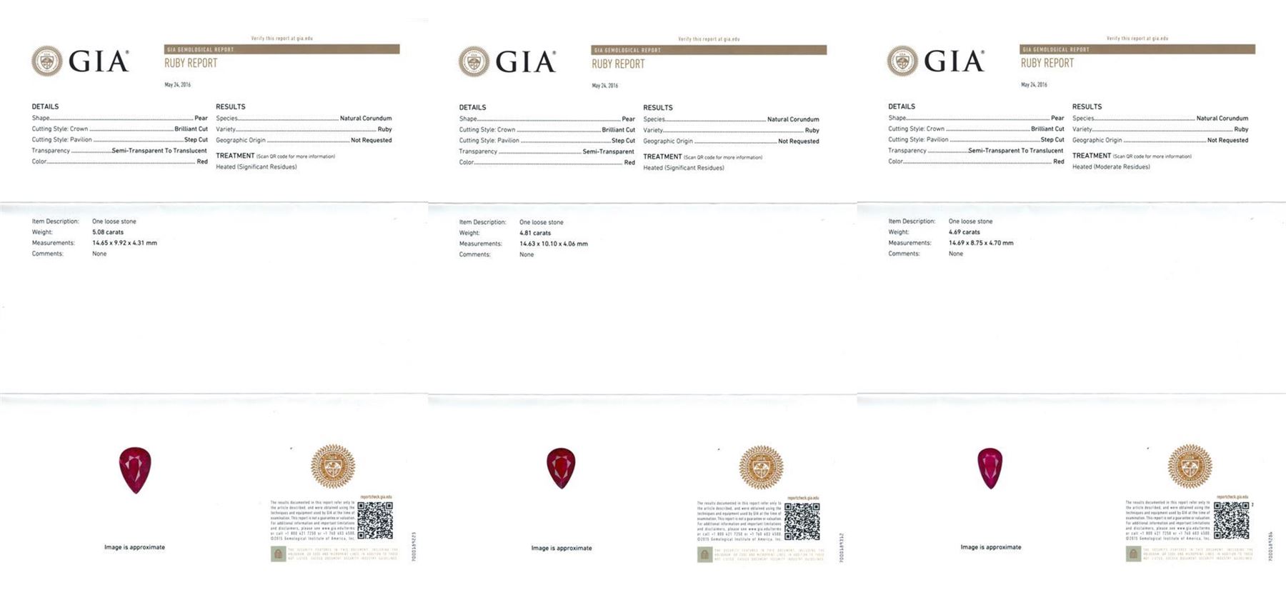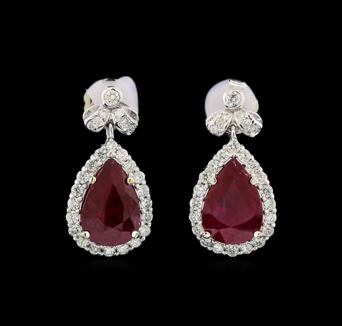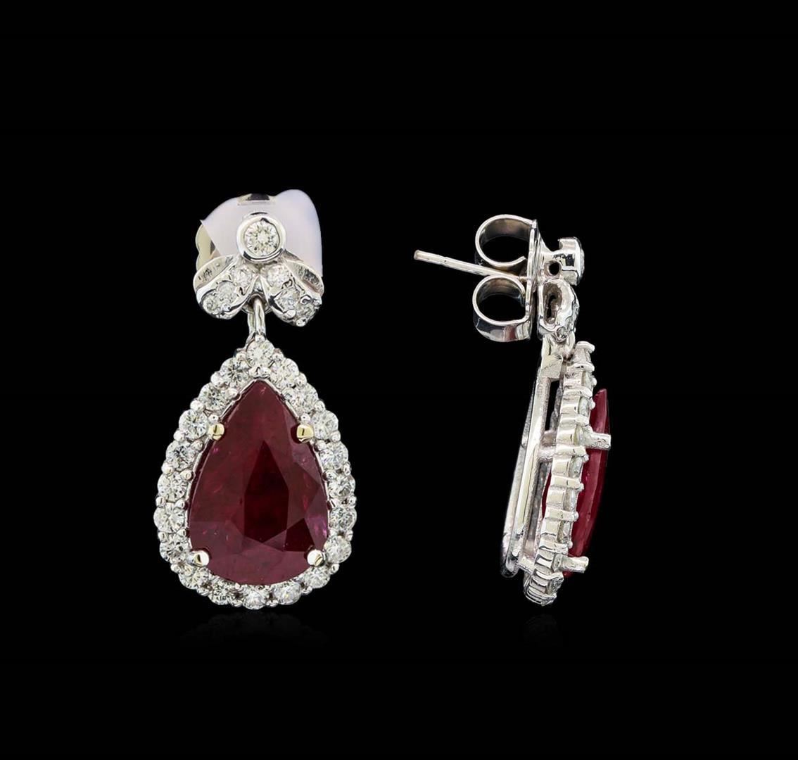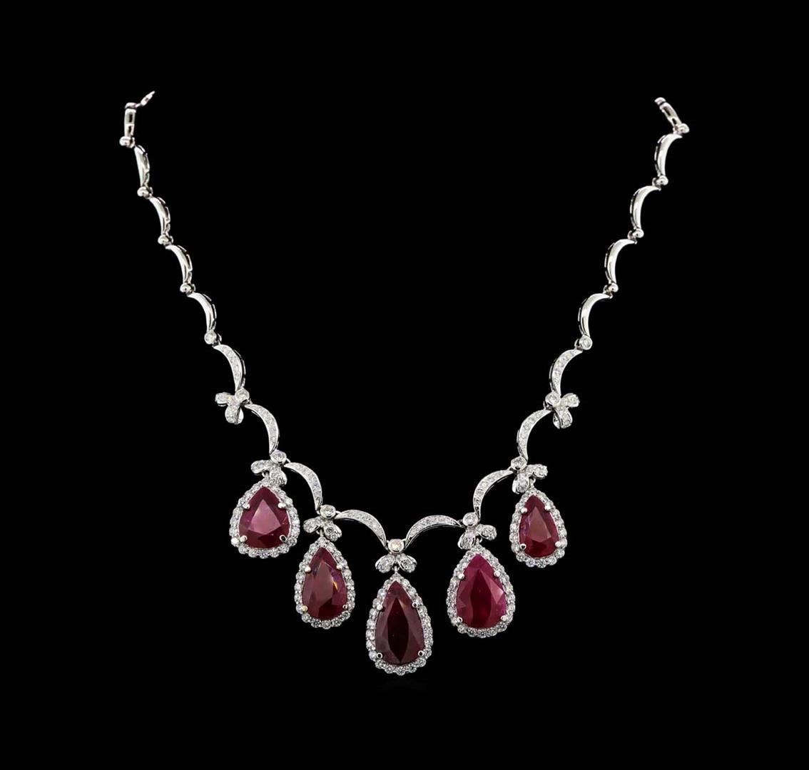 One Suite containing : One pair electronically tested 18KT white gold lady's combination cast & assembled fashion dangle earrings with heavy friction backs with a bright polish finish. Identified with markings of '18K'. Condition is new, good workmanship. Containing: One prong set pear modified mixed cut natural ruby, measuring 14.65 x 9.92 x 4.31mm, (depth est.) approximate weight of 5.08ct., clarity is heavily included, medium dark, moderately strong, red color, (GIA R 6/4), cut is good. Transmitting light somewhat diffusely, semi-transparent to translucent. Indications of laboratory high temperature heat treatment. Colored gemstones are presumed to have been subjected to commonly used enhancement processes. Graded loose prior to setting in the GIA Laboratory, Report #2175603386. One prong set pear modified mixed cut natural ruby, measuring 14.63 x 10.10 x 4.06mm, (depth est.) approximate weight of 4.81ct., clarity is heavily included, medium dark, moderately strong, red color, (GIA R 6/4), cut is good. Transmitting light somewhat diffusely, semi-transparent to translucent. Indications of laboratory high temperature heat treatment. Colored gemstones are presumed to have been subjected to commonly used enhancement processes. Graded loose prior to setting in the GIA Laboratory, Report #1176603518. Forty prong set round brilliant cut diamonds, measuring 2.15 - 2.05 x 1.30mm (depth est.) approximate total weight of 40 Stones = 1.42ct. Graded in the setting. Clarity VS-2 to SI-2. Color: H - I Cut Good Two bezel set round brilliant cut diamonds, measuring 2.50 - 2.40 x 1.52mm (depth est.) approximate total weight of 2 Stones = 0.11ct. Graded in the setting. Clarity SI-1. Color: G - H Cut Good Twelve prong set round brilliant cut diamonds, measuring 1.60 - 1.55 x 0.98mm (depth est.) approximate total weight of 12 Stones = 0.18ct. Graded in the setting. Clarity SI-1 to SI-2. Color: H - I Cut Good. Total Weight of Colored Stones 9.89ct.. Total Weight of Diamonds 1.71ct.. Total Weight of Earrings 12.70gm. One electronically tested 18KT white gold lady's combination cast & assembled fashion necklace with a tongue clasp & foldover safety with a bright polish finish. The featured lady's necklace has a scalloped link motif with five pear shaped halo dangles and measures 17.5 inches in length. Identified with markings of "18K". Condition is new, good workmanship. Containing: One prong set pear modified mixed cut natural ruby, measuring 19.13 x 11.17 x 5.56mm, (depth est.) approximate weight of 9.29ct., clarity is heavily included, medium dark, moderately strong, red color, (GIA R 6/4), cut is good. Transmitting light somewhat diffusely, semi-transparent to translucent. Indications of laboratory high temperature heat treatment. Colored gemstones are presumed to have been subjected to commonly used enhancement processes. Graded loose prior to setting in the GIA Laboratory, Report #2175603522.One prong set pear modified mixed cut natural ruby, measuring 17.27 x 11.30 x 5.06mm, (depth est.) 8%. bulge factor, approximate weight of 8.50ct., clarity is heavily included, medium dark, moderately strong, strongly purplish red color, (GIA stpR 6/4), cut is good. Transmitting light somewhat diffusely, semi-transparent to translucent. Indications of laboratory high temperature heat treatment. Colored gemstones are presumed to have been subjected to commonly used enhancement processes. Graded loose prior to setting in the GIA Laboratory, Report #2175603390.One pave' set pear modified mixed cut natural ruby, measuring 16.92 x 10.16 x 4.33mm, (depth est.) 9%. bulge factor, approximate weight of 6.51ct., clarity is heavily included, medium dark, moderately strong, red color, (GIA R 6/4), cut is good. Transmitting light somewhat diffusely, semi-transparent to translucent. Indications of laboratory high temperature heat treatment. Colored gemstones are presumed to have been subjected to commonly used enhancement processes. Graded loose prior to setting in the GIA Laboratory, Report #2175603589.One prong set pear modified mixed cut natural ruby, measuring 14.87 x 11.45 x 4.20mm, (depth est.) 3%. bulge factor, approximate weight of 5.92ct., clarity is heavily included, medium dark, moderately strong, red color, (GIA R 6/4), cut is good. Transmitting light somewhat diffusely, semi-transparent to translucent. Indications of laboratory high temperature heat treatment. Colored gemstones are presumed to have been subjected to commonly used enhancement processes. Graded loose prior to setting in the GIA Laboratory, Report #1172603533.One prong set pear modified mixed cut natural ruby, measuring 14.69 x 8.75 x 4.70mm, (depth est.) approximate weight of 4.69ct., clarity is heavily included, medium dark, moderately strong, red color, (GIA R 6/4), cut is good. Transmitting light somewhat diffusely, semi-transparent to translucent. Indications of laboratory high temperature heat treatment. Colored gemstones are presumed to have been subjected to commonly used enhancement processes. Graded loose prior to setting in the GIA Laboratory, Report #2171603587.Nine bezel set round brilliant cut diamonds, measuring 2.60 - 2.50 x 1.58mm (depth est.) approximate. Total Weight of 9 Stones = 0.57ct. Graded in the setting. Clarity: SI-1 to SI-2. Color: H - I. Cut Good One Hundred Two prong set round brilliant cut diamonds, measuring 2.15 - 2.10 x 1.32mm (depth est.) approximate. Total Weight of 102 Stones = 3.72ct. Graded in the setting. Clarity: VS-2 to SI-2. Color: H - I. Cut Good Eighty-Two prong set round brilliant cut diamonds, measuring 1.60 - 1.40 x 0.93mm (depth est.) approximate. Total Weight of 82 Stones = 1.04ct. Graded in the setting. Clarity: VS-2 to SI-2. Color: H - I. Cut Good. Total Weight of Colored Stones 34.91ct. Total Weight of Diamonds 5.33ct. Total Weight of Necklace 54.20gm. GAS Appraised.