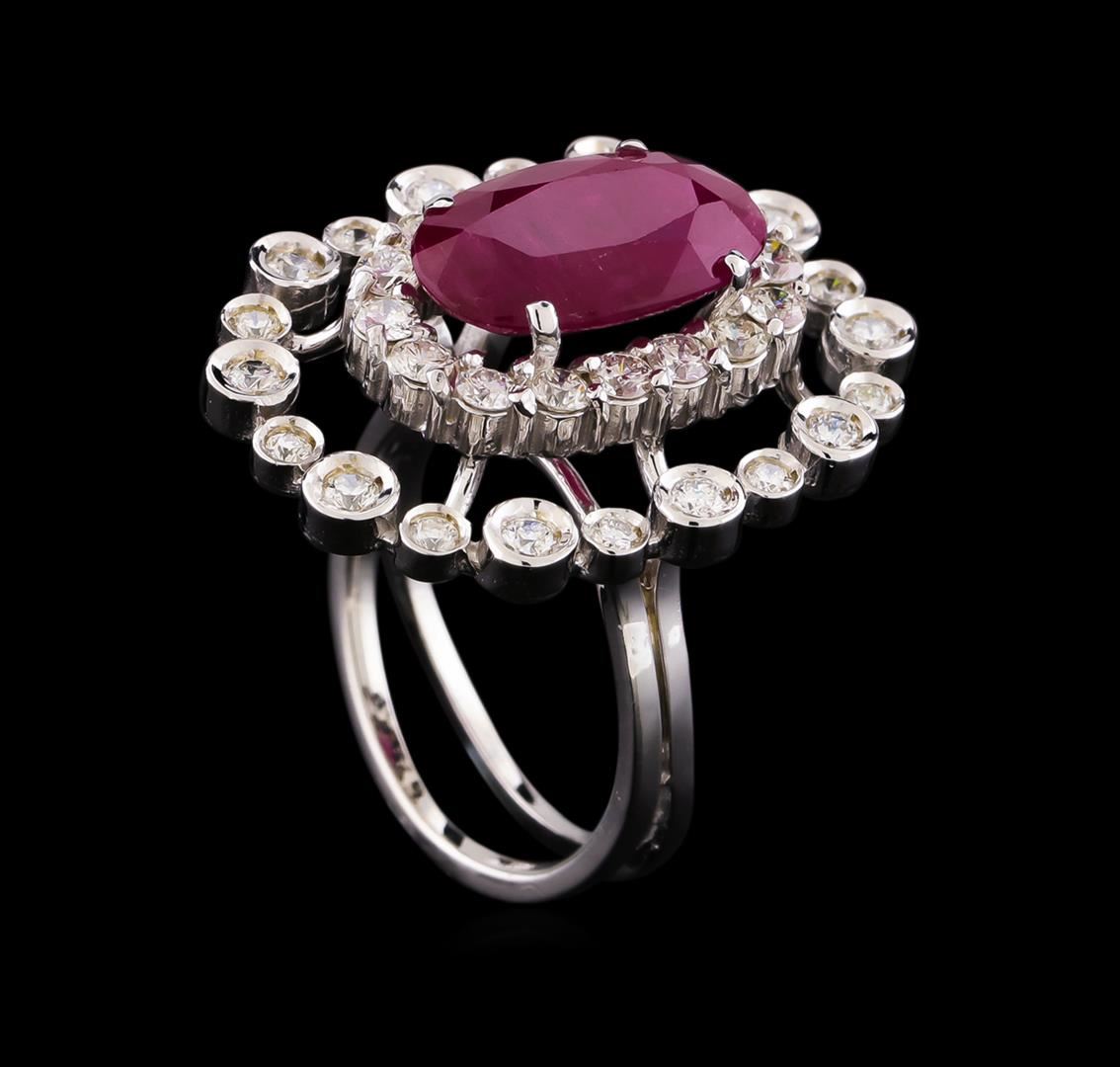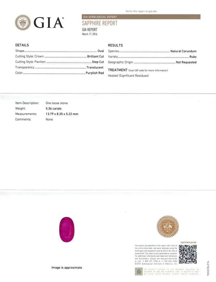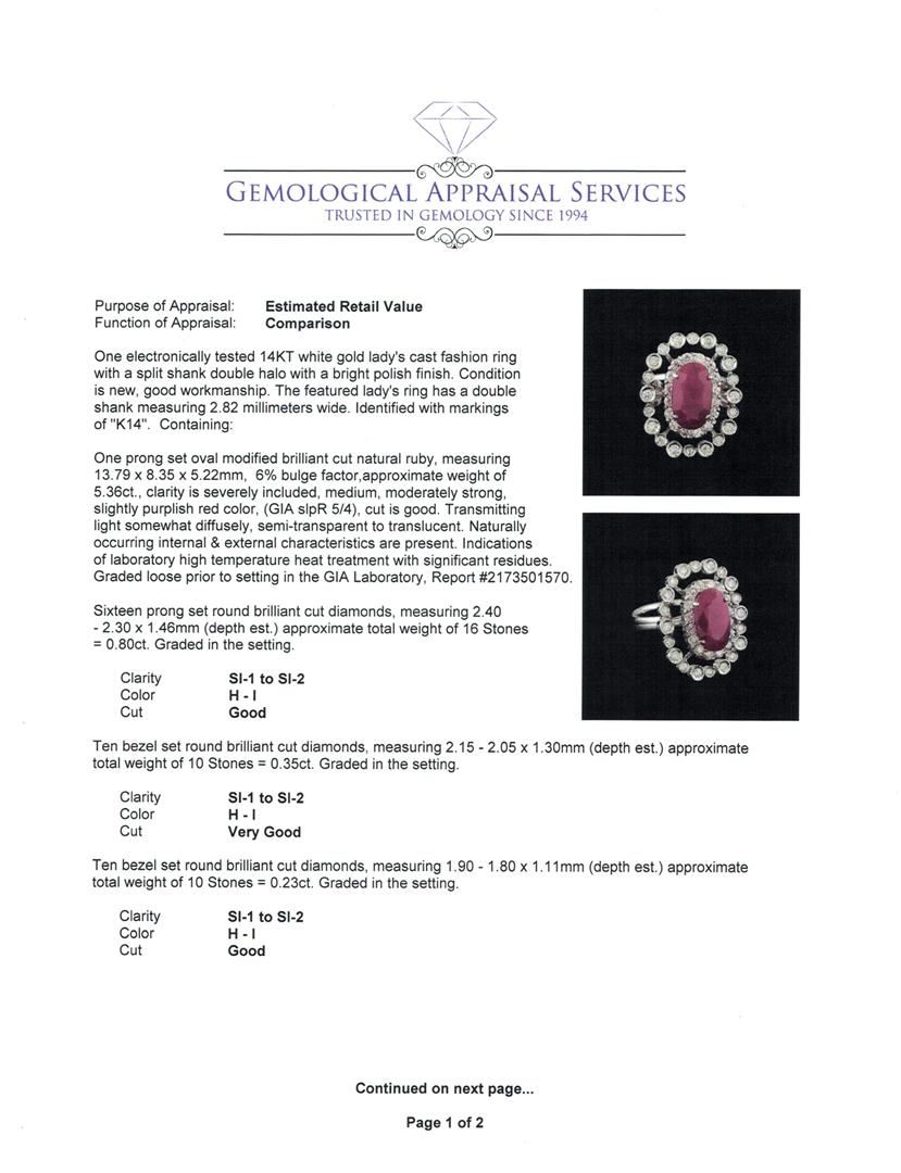 One electronically tested 14KT white gold lady's cast fashion ring with a split shank double halo with a bright polish finish. The featured lady's ring has a double shank measuring 2.82 millimeters wide. Identified with markings of "K14". Condition is new, good workmanship. Containing: One prong set oval modified brilliant cut natural ruby, measuring 13.79 x 8.35 x 5.22mm, 6%. bulge factor, approximate weight of 5.36ct., clarity is severely included, medium, moderately strong, slightly purplish red color, (GIA slpR 5/4), cut is good. Transmitting light somewhat diffusely, semi-transparent to translucent. Naturally occurring internal & external characteristics are present. Indications of laboratory high temperature heat treatment with significant residues. Graded loose prior to setting in the GIA Laboratory, Report #2173501570.Sixteen prong set round brilliant cut diamonds, measuring 2.40 - 2.30 x 1.46mm (depth est.) approximate total weight of 16 Stones = 0.80ct. Graded in the setting. Clarity: SI-1 to SI-2. Color: H - I. Cut Good Ten bezel set round brilliant cut diamonds, measuring 2.15 - 2.05 x 1.30mm (depth est.) approximate total weight of 10 Stones = 0.35ct. Graded in the setting. Clarity: SI-1 to SI-2. Color: H - I. Cut Very Good Ten bezel set round brilliant cut diamonds, measuring 1.90 - 1.80 x 1.11mm (depth est.) approximate total weight of 10 Stones = 0.23ct. Graded in the setting. Clarity: SI-1 to SI-2. Color: H - I. Cut Good. Total Weight of Colored Stones 5.36ct. Total Weight of Diamonds 1.38ct. Total Weight of Ring 8.30gm. GAS Appraised.