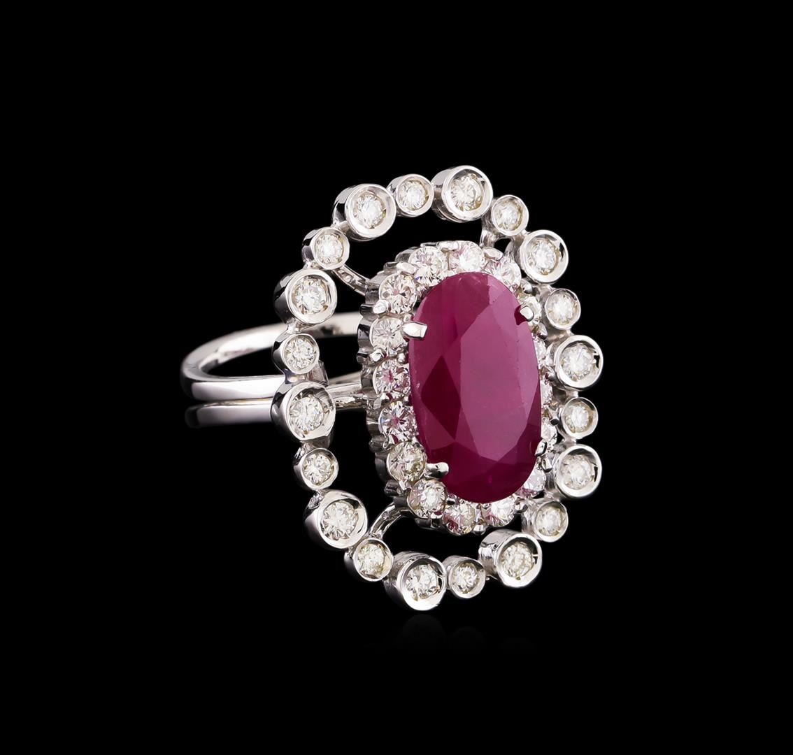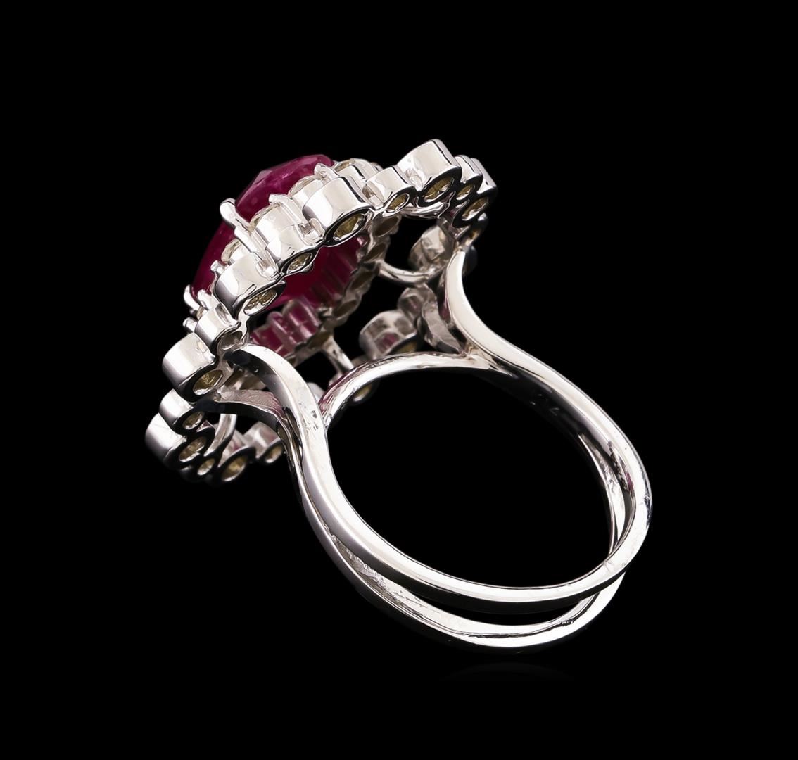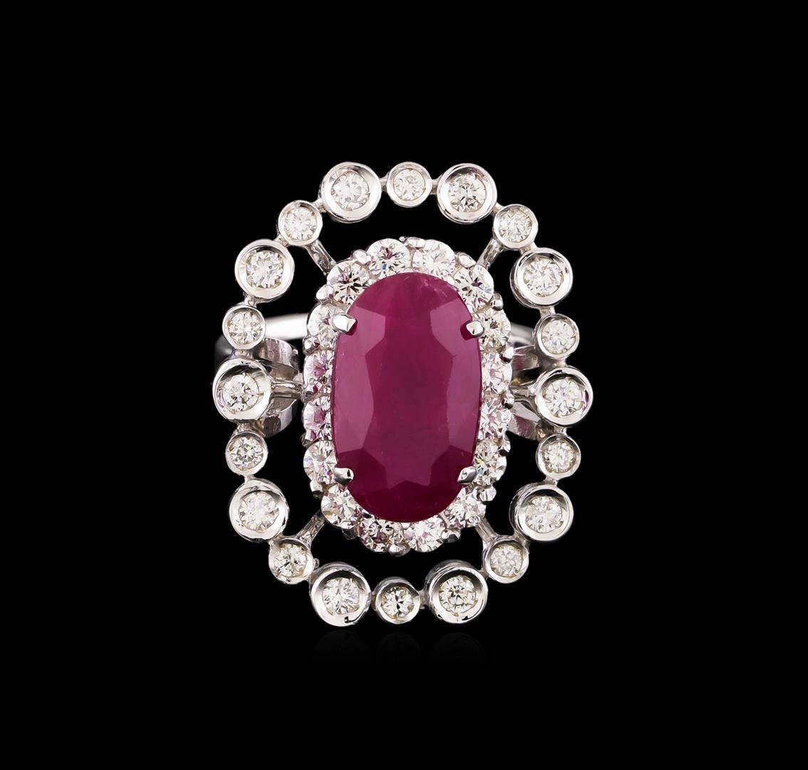 One electronically tested 14KT white gold lady's cast fashion ring with a split shank double halo with a bright polish finish. The featured lady's ring has a double shank measuring 2.82 millimeters wide. Identified with markings of "K14". Condition is new, good workmanship. Containing: One prong set oval modified brilliant cut natural ruby, measuring 13.79 x 8.35 x 5.22mm, 6%. bulge factor, approximate weight of 5.36ct., clarity is severely included, medium, moderately strong, slightly purplish red color, (GIA slpR 5/4), cut is good. Transmitting light somewhat diffusely, semi-transparent to translucent. Naturally occurring internal & external characteristics are present. Indications of laboratory high temperature heat treatment with significant residues. Graded loose prior to setting in the GIA Laboratory, Report #2173501570.Sixteen prong set round brilliant cut diamonds, measuring 2.40 - 2.30 x 1.46mm (depth est.) approximate total weight of 16 Stones = 0.80ct. Graded in the setting. Clarity: SI-1 to SI-2. Color: H - I. Cut Good Ten bezel set round brilliant cut diamonds, measuring 2.15 - 2.05 x 1.30mm (depth est.) approximate total weight of 10 Stones = 0.35ct. Graded in the setting. Clarity: SI-1 to SI-2. Color: H - I. Cut Very Good Ten bezel set round brilliant cut diamonds, measuring 1.90 - 1.80 x 1.11mm (depth est.) approximate total weight of 10 Stones = 0.23ct. Graded in the setting. Clarity: SI-1 to SI-2. Color: H - I. Cut Good. Total Weight of Colored Stones 5.36ct. Total Weight of Diamonds 1.38ct. Total Weight of Ring 8.30gm. GAS Appraised.