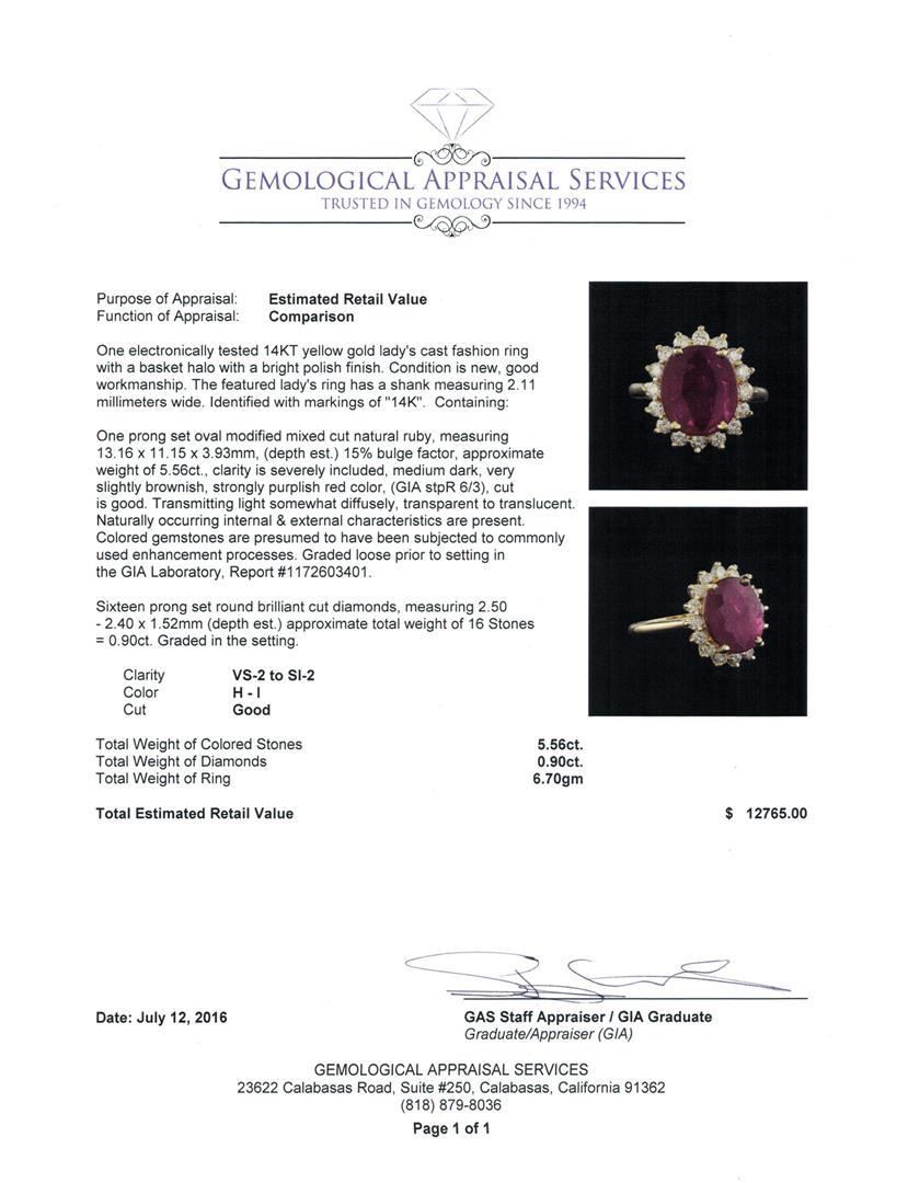 One electronically tested 14KT yellow gold lady's cast fashion ring with a basket halo with a bright polish finish. The featured lady's ring has a shank measuring 2.11 millimeters wide. Identified with markings of '14K'. Condition is new, good workmanship. Containing: One prong set oval modified mixed cut natural ruby, measuring 13.16 x 11.15 x 3.93mm, (depth est.) 15%. bulge factor, approximate weight of 5.56ct., clarity is severely included, medium dark, very slightly brownish, strongly purplish red color, (GIA stpR 6/3), cut is good. Transmitting light somewhat diffusely, transparent to translucent. Naturally occurring internal & external characteristics are present. Colored gemstones are presumed to have been subjected to commonly used enhancement processes. Graded loose prior to setting in the GIA Laboratory, Report #1172603401. Sixteen prong set round brilliant cut diamonds, measuring 2.50 - 2.40 x 1.52mm (depth est.) approximate total weight of 16 Stones = 0.90ct. Graded in the setting. Clarity VS-2 to SI-2. Color: H - I Cut Good. Total Weight of Colored Stones 5.56ct.. Total Weight of Diamonds 0.90ct.. Total Weight of Ring 6.70gm. GAS Appraised.