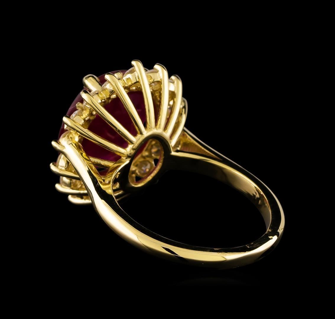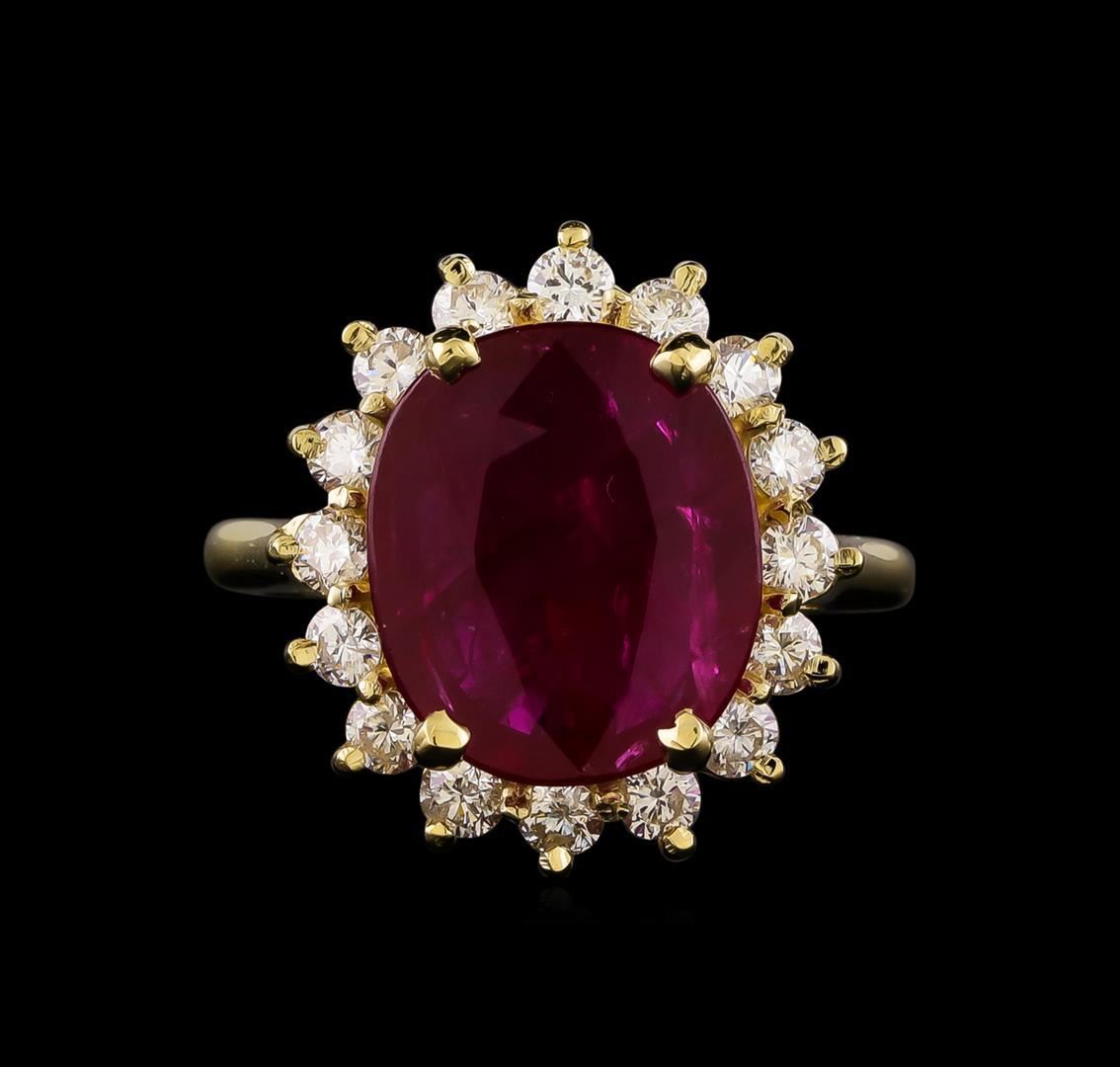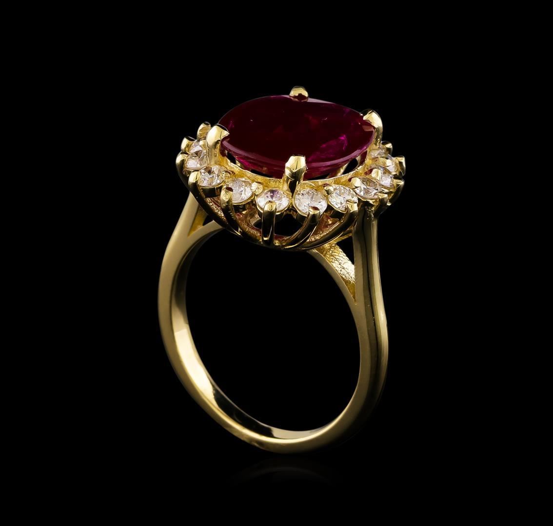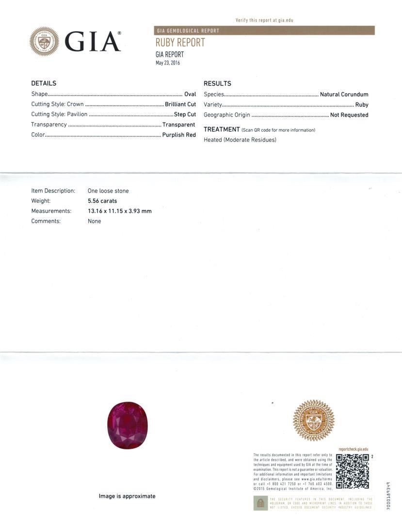 One electronically tested 14KT yellow gold lady's cast fashion ring with a basket halo with a bright polish finish. The featured lady's ring has a shank measuring 2.11 millimeters wide. Identified with markings of '14K'. Condition is new, good workmanship. Containing: One prong set oval modified mixed cut natural ruby, measuring 13.16 x 11.15 x 3.93mm, (depth est.) 15%. bulge factor, approximate weight of 5.56ct., clarity is severely included, medium dark, very slightly brownish, strongly purplish red color, (GIA stpR 6/3), cut is good. Transmitting light somewhat diffusely, transparent to translucent. Naturally occurring internal & external characteristics are present. Colored gemstones are presumed to have been subjected to commonly used enhancement processes. Graded loose prior to setting in the GIA Laboratory, Report #1172603401. Sixteen prong set round brilliant cut diamonds, measuring 2.50 - 2.40 x 1.52mm (depth est.) approximate total weight of 16 Stones = 0.90ct. Graded in the setting. Clarity VS-2 to SI-2. Color: H - I Cut Good. Total Weight of Colored Stones 5.56ct.. Total Weight of Diamonds 0.90ct.. Total Weight of Ring 6.70gm. GAS Appraised.