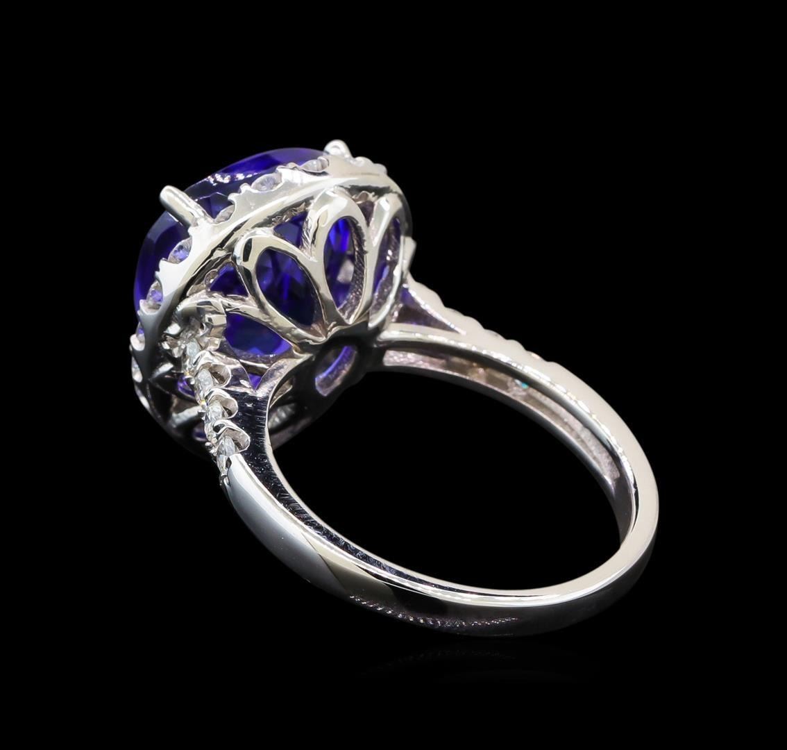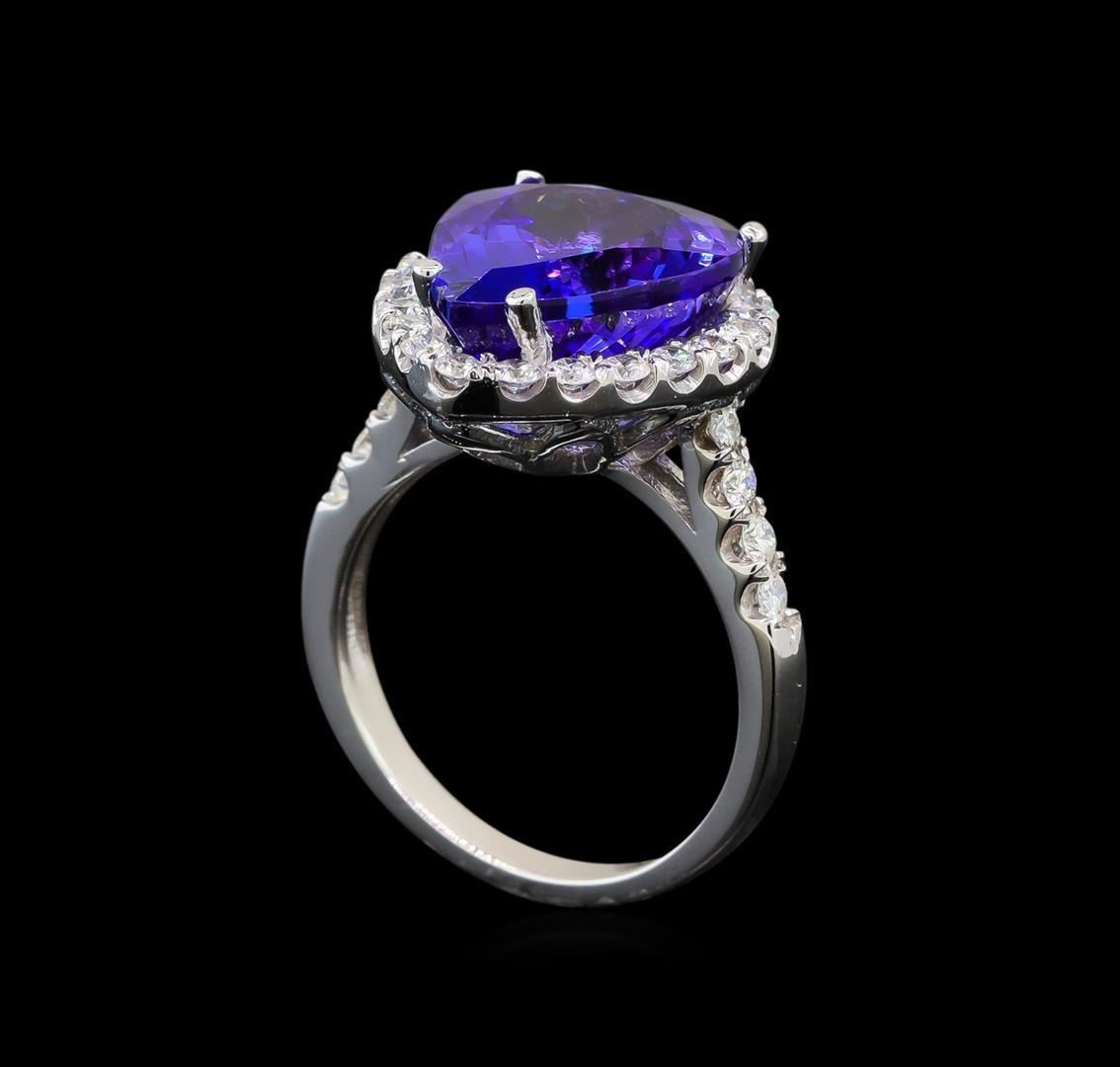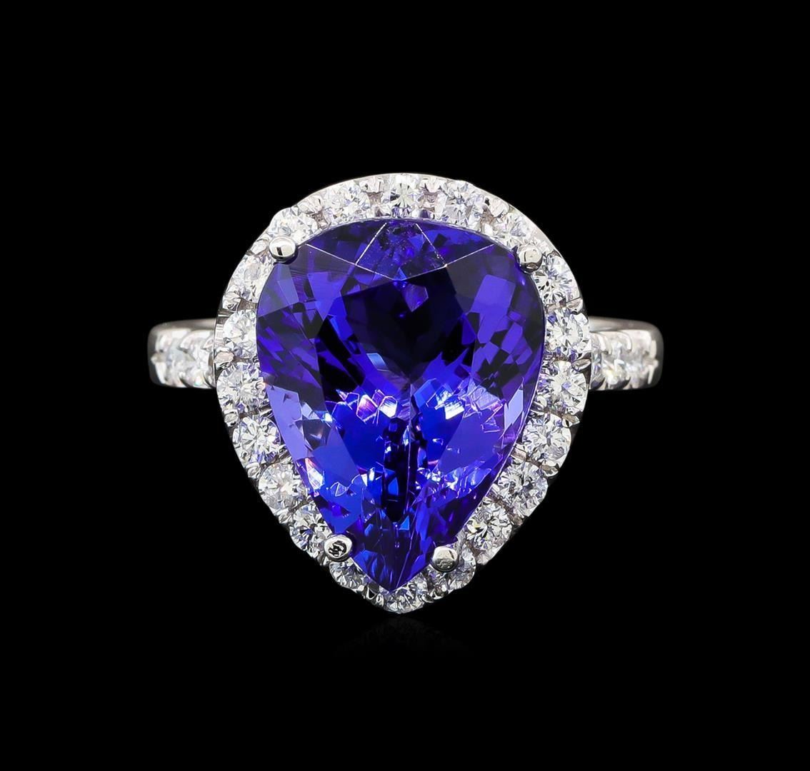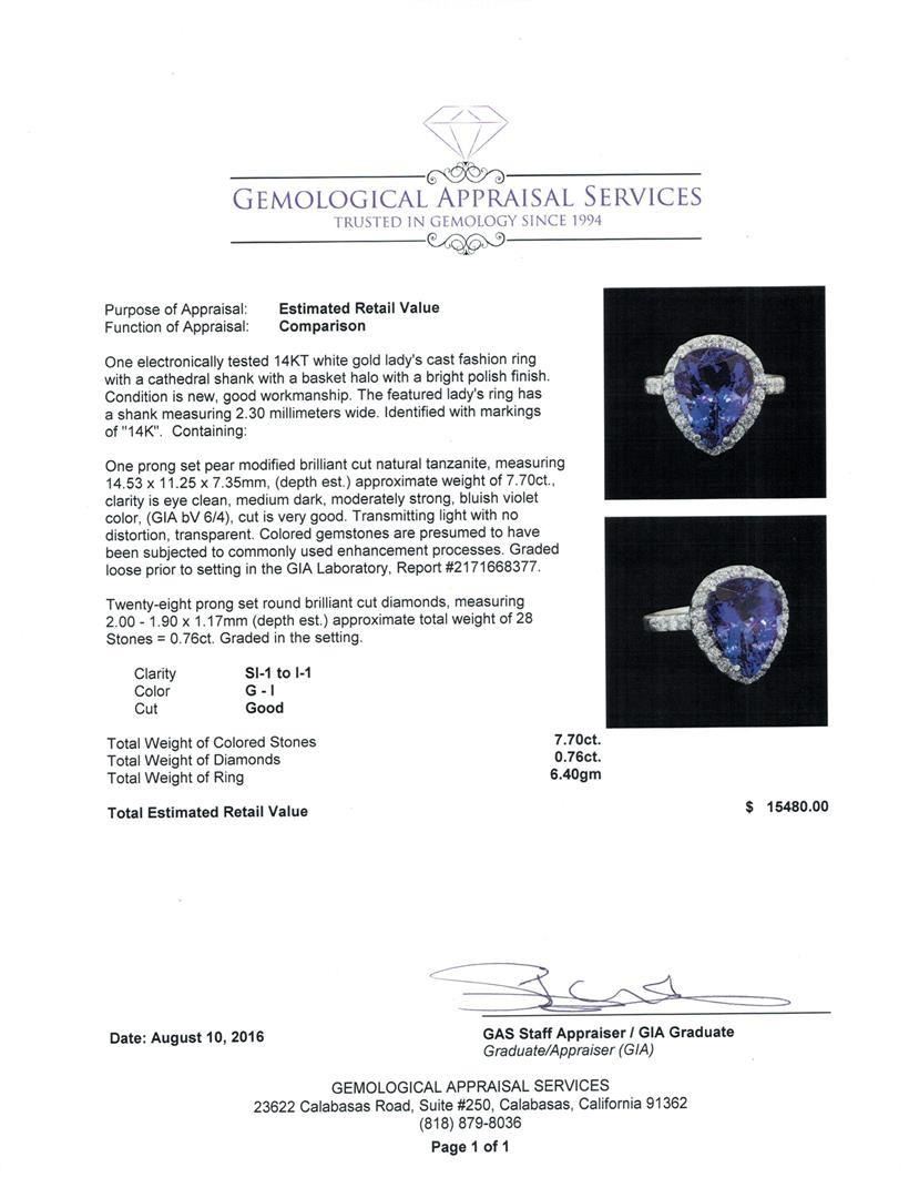 One electronically tested 14KT white gold lady's cast fashion ring with a cathedral shank with a basket halo with a bright polish finish. The featured lady's ring has a shank measuring 2.30 millimeters wide. Identified with markings of '14K'. Condition is new, good workmanship. Containing: One prong set pear modified brilliant cut natural tanzanite, measuring 14.53 x 11.25 x 7.35mm, (depth est.) approximate weight of 7.70 ct., clarity is eye clean, medium dark, moderately strong, bluish violet color, (GIA bV 6/4), cut is very good. Transmitting light with no distortion, transparent. Colored gemstones are presumed to have been subjected to commonly used enhancement processes. Graded loose prior to setting in the GIA Laboratory, Report #2171668377. Twenty-Eight prong set round brilliant cut diamonds, measuring 2.00 - 1.90 x 1.17mm (depth est.) approximate total weight of 28 Stones = 0.76ct. Graded in the setting. Clarity SI-1 to I-1. Color: G - I Cut Good. Total Weight of Colored Stones 7.70 ct.. Total Weight of Diamonds 0.76ct.. Total Weight of Ring 6.40gm. GAS Appraised.