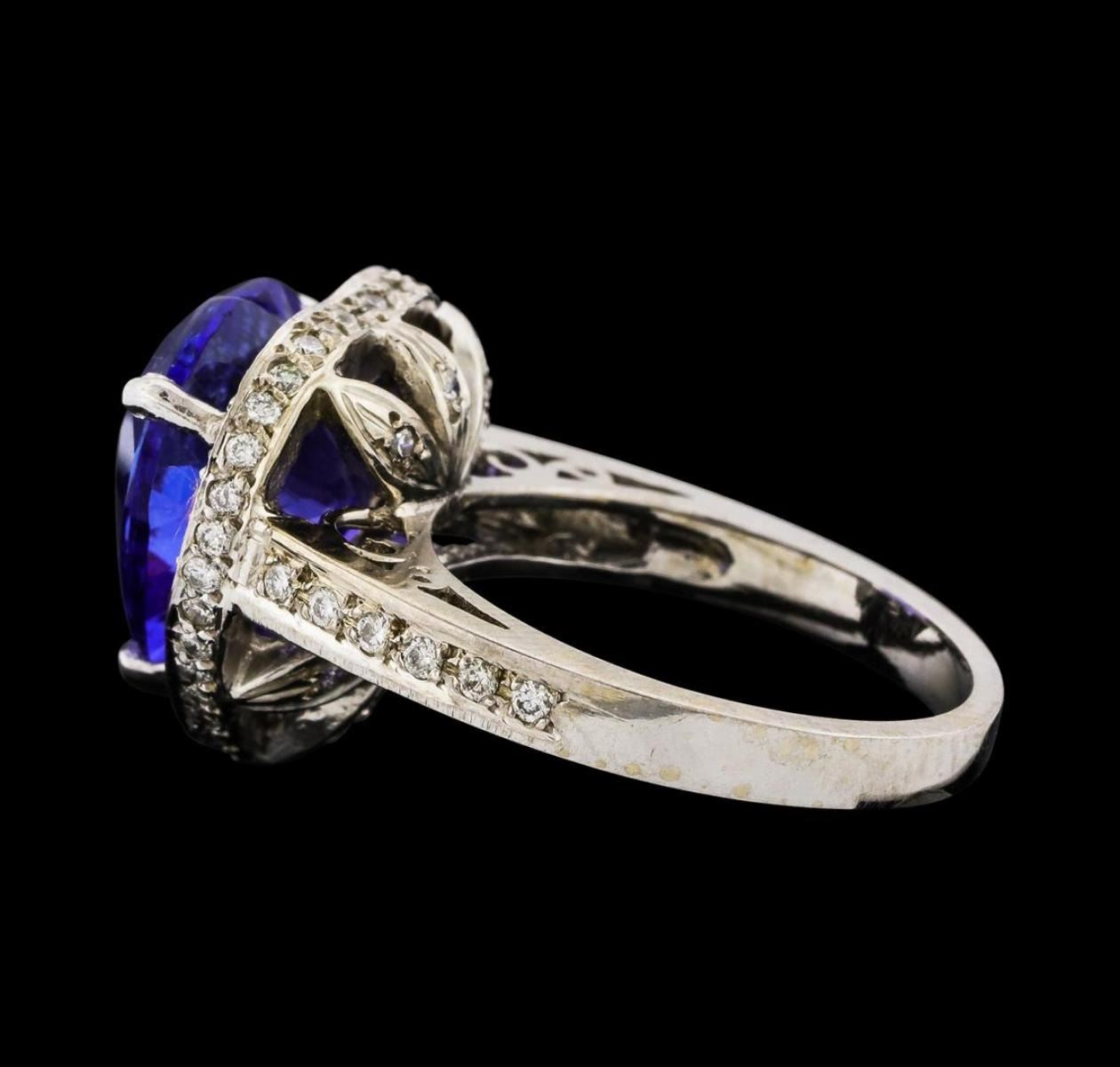 One electronically tested 14KT white gold lady's cast fashion heart shape ring with a cathedral shank with a basket halo with a bright polish finish. The featured lady's ring has a shank measuring 2.55 millimeters wide. Identified with markings of 'K14'. Condition is new, good workmanship. Containing: One prong set heart modified brilliant cut natural tanzanite, measuring 13.05 x 13.30 x 7.38mm, (depth est.) approximate weight of 7.72ct., clarity is eye clean, medium, moderately strong, bluish violet color, (GIA bV 5/4), cut is very good. Transmitting light with no distortion, transparent. Colored gemstones are presumed to have been subjected to commonly used enhancement processes. Graded loose prior to setting in the GIA Laboratory, Report #6177847958. Seventy-Eight prong set round brilliant cut diamonds, measuring 1.40 - 1.25 x 0.81mm (depth est.) approximate total weight of 78 Stones = 0.69ct. Graded in the setting. Clarity SI-1 to I-1. Color: G - I Cut Good. Total Weight of Colored Stones 7.72ct.. Total Weight of Diamonds 0.69ct.. Total Weight of Ring 9.20gm. GAS Appraised at $13,120.00.