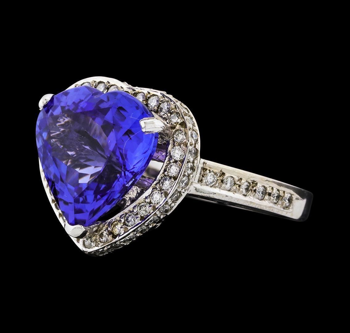 One electronically tested 14KT white gold lady's cast fashion heart shape ring with a cathedral shank with a basket halo with a bright polish finish. The featured lady's ring has a shank measuring 2.55 millimeters wide. Identified with markings of 'K14'. Condition is new, good workmanship. Containing: One prong set heart modified brilliant cut natural tanzanite, measuring 13.05 x 13.30 x 7.38mm, (depth est.) approximate weight of 7.72ct., clarity is eye clean, medium, moderately strong, bluish violet color, (GIA bV 5/4), cut is very good. Transmitting light with no distortion, transparent. Colored gemstones are presumed to have been subjected to commonly used enhancement processes. Graded loose prior to setting in the GIA Laboratory, Report #6177847958. Seventy-Eight prong set round brilliant cut diamonds, measuring 1.40 - 1.25 x 0.81mm (depth est.) approximate total weight of 78 Stones = 0.69ct. Graded in the setting. Clarity SI-1 to I-1. Color: G - I Cut Good. Total Weight of Colored Stones 7.72ct.. Total Weight of Diamonds 0.69ct.. Total Weight of Ring 9.20gm. GAS Appraised.