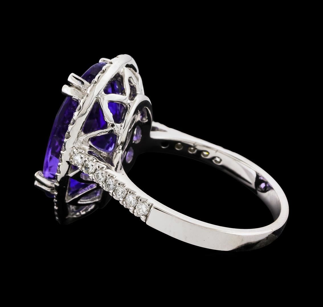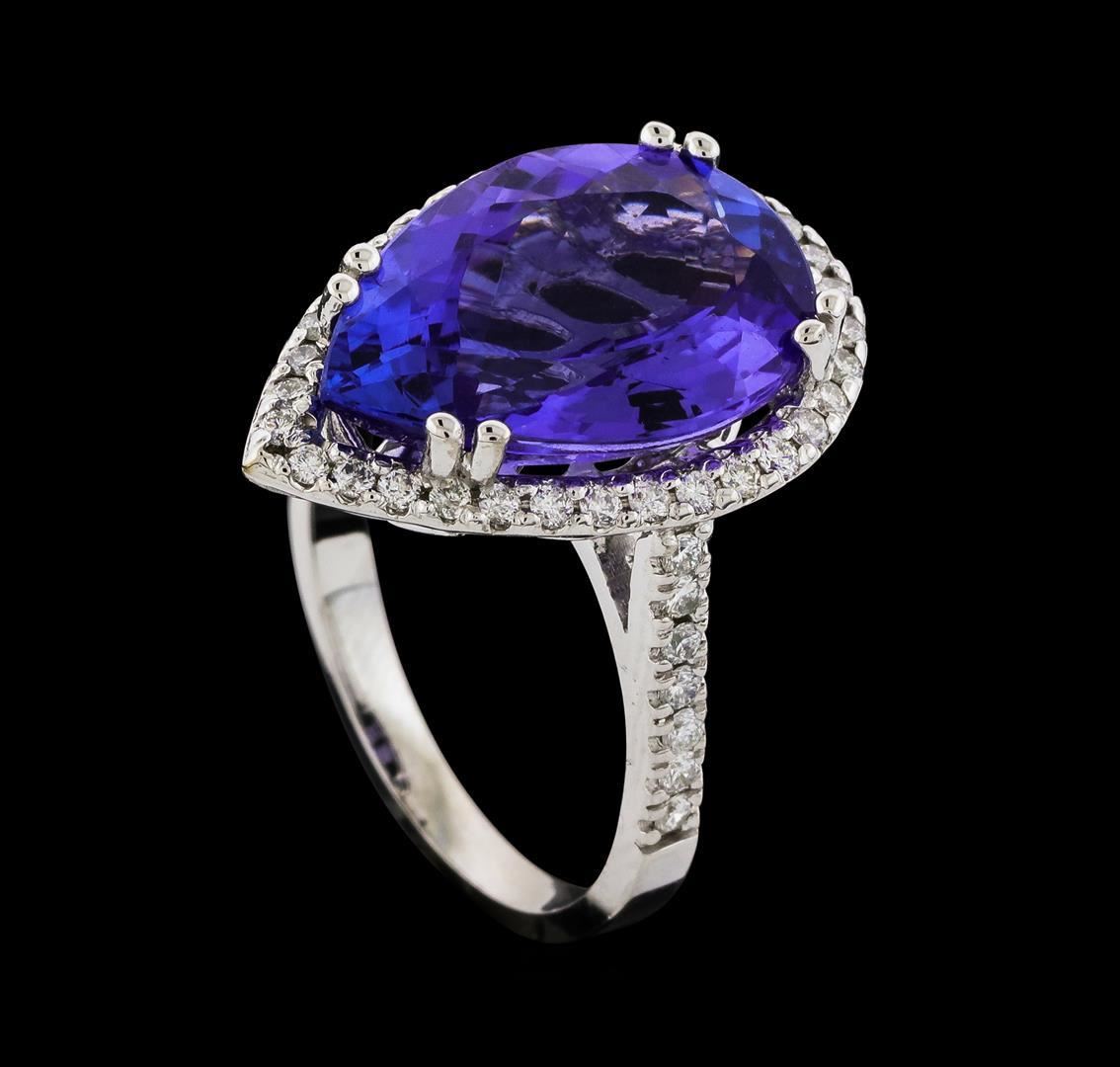 One electronically tested 14KT white gold lady's cast fashion ring with a basket halo with a bright polish finish. The featured lady's ring has a shank measuring 2.27 millimeters wide. Identified with markings of '14K'. Condition is new, good workmanship. Containing: One prong set pear modified brilliant cut natural tanzanite, measuring 16.72 x 11.34 x 6.55mm, (depth est.) approximate weight of 8.25ct., clarity is eye clean, medium, moderately strong, violet color, (GIA V 5/4), cut is very good. Transmitting light with no distortion, transparent. Colored gemstones are presumed to have been subjected to commonly used enhancement processes. Graded loose prior to setting in the GIA Laboratory, Report #1172847906. Fourteen prong set round brilliant cut diamonds, measuring 1.60 - 1.50 x 0.96mm (depth est.) approximate total weight of 14 Stones = 0.20ct. Graded in the setting. Clarity SI-1 to SI-2. Color: G - H Cut Good Thirty-Five prong set round brilliant cut diamonds, measuring 1.40 - 1.30 x 0.84mm (depth est.) approximate total weight of 35 Stones = 0.34ct. Graded in the setting. Clarity SI-1 to SI-3. Color: G - H Cut Good. Total Weight of Colored Stones 8.25ct.. Total Weight of Diamonds 0.54ct.. Total Weight of Ring 6.40gm. GAS Appraised.