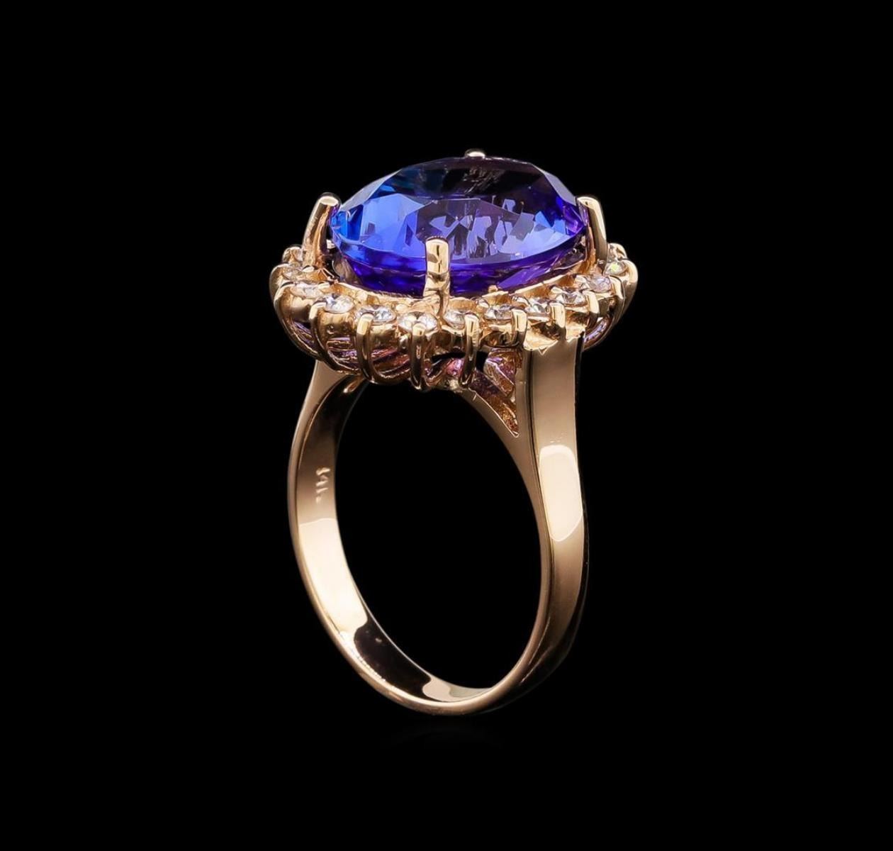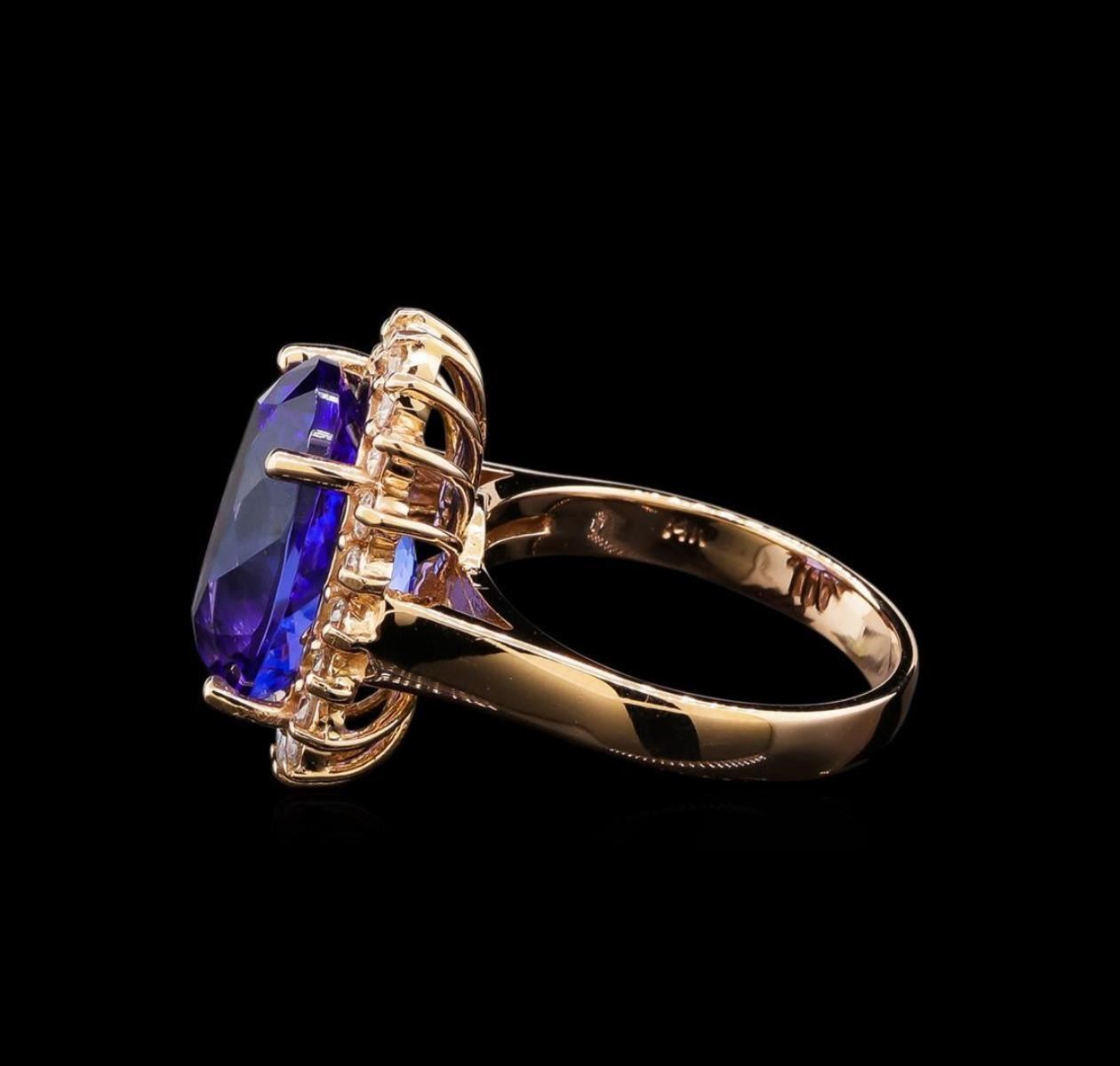 One electronically tested 14KT rose gold lady's cast fashion ring with a basket halo with a bright polish finish. The featured lady's ring has a shank measuring 3.10 millimeters wide. Identified with markings of '14K'. Condition is new, good workmanship. Containing: One prong set oval modified brilliant cut natural tanzanite, measuring 14.06 x 10.66 x 7.80mm, (depth est.) approximate weight of 8.31ct., clarity is eye clean, medium dark, moderately strong, bluish violet color, (GIA bV 6/4), cut is very good. Transmitting light with no distortion, transparent. Colored gemstones are presumed to have been subjected to commonly used enhancement processes. Graded loose prior to setting in the GIA Laboratory, Report #1176665827. Twenty prong set round brilliant cut diamonds, measuring 2.00 - 1.90 x 1.21mm (depth est.) approximate total weight of 20 Stones = 0.56ct. Graded in the setting. Clarity SI-1 to I-1. Color: H - I Cut Good. Total Weight of Colored Stones 8.31ct.. Total Weight of Diamonds 0.56ct.. Total Weight of Ring 7.10gm. GAS Appraised.