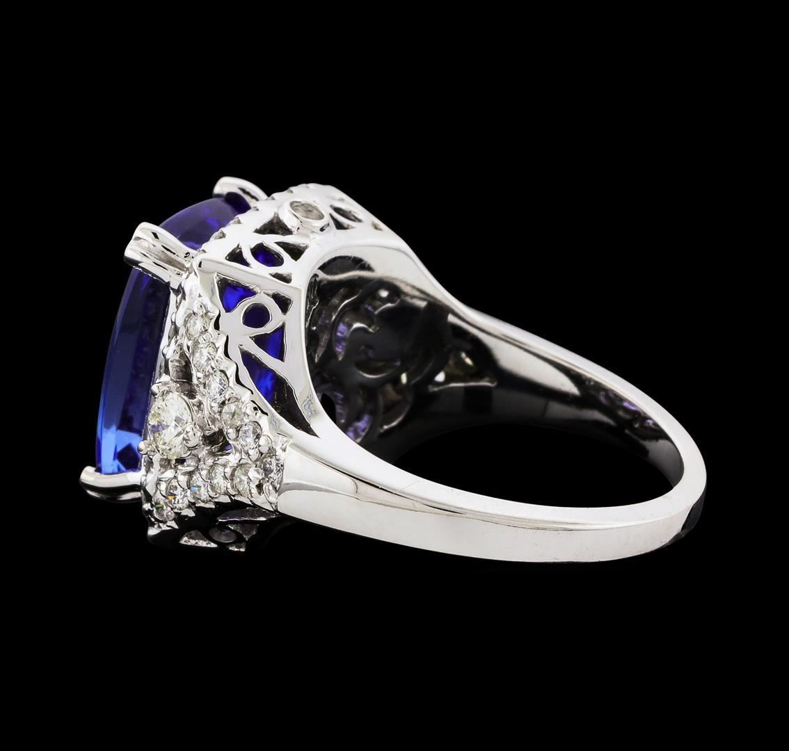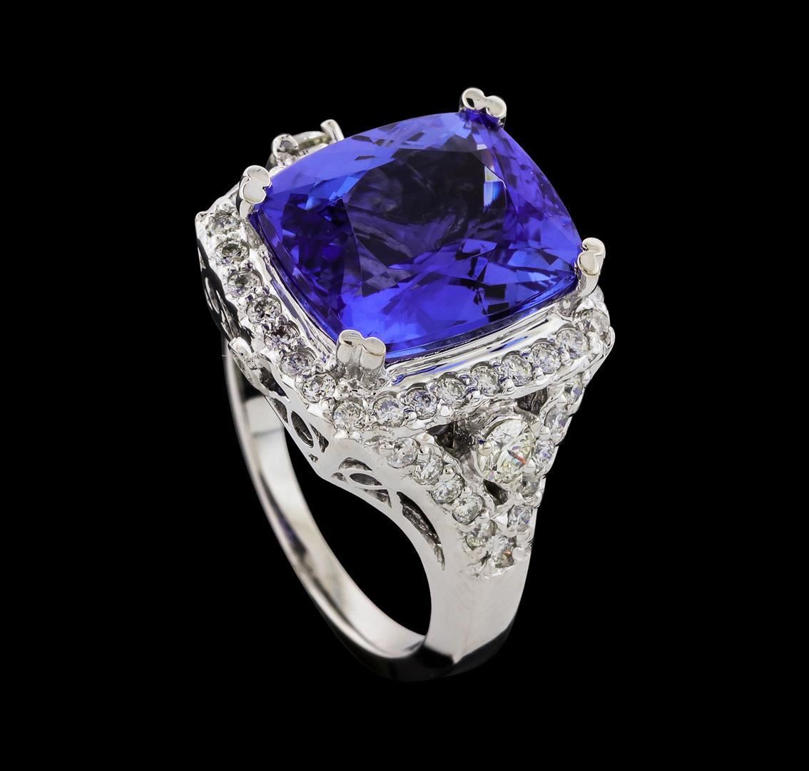 One electronically tested 14KT white gold lady's cast fashion ring with a cathedral shank with a basket halo with a bright polish finish. The featured lady's ring has a shank measuring 2.08 millimeters wide. Identified with markings of '14K'. Condition is new, good workmanship. Containing: One prong set rectangular cushion modified brilliant cut natural tanzanite, measuring 12.88 x 11.11 x 6.90mm, (depth est.) 7%. bulge factor, approximate weight of 8.38ct., clarity is eye clean, medium, moderately strong, bluish violet color, (GIA bV 5/4), cut is very good. Transmitting light with no distortion, transparent. Colored gemstones are presumed to have been subjected to commonly used enhancement processes. Graded loose prior to setting in the GIA Laboratory, Report #5172847062. Two prong set round brilliant cut diamonds, measuring 2.90 - 2.85 x 1.79mm (depth est.) approximate total weight of 2 Stones = 0.18ct. Graded in the setting. Clarity SI-1. Color: H - I Cut Good Fifty-Two prong set round brilliant cut diamonds, measuring 1.50 - 1.45 x 0.90mm (depth est.) approximate total weight of 52 Stones = 0.62ct. Graded in the setting. Clarity SI-1 to SI-2. Color: H - I Cut Good. Total Weight of Colored Stones 8.38ct.. Total Weight of Diamonds 0.80ct.. Total Weight of Ring 9.60gm. GAS Appraised.