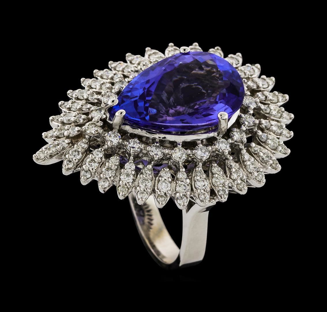 One electronically tested 14KT white gold lady's cast fashion ring with a triple basket halo with a bright polish finish. The featured lady's ring has a shank measuring 3.26 millimeters wide. Identified with markings of 'K14'. Condition is new, good workmanship. Containing: One prong set pear modified brilliant cut natural tanzanite, measuring 16.90 x 10.93 x 6.92mm, (depth est.) approximate weight of 8.48ct., clarity is eye clean, medium, moderately strong, violetish blue color, (GIA vB 5/4), cut is very good. Transmitting light with no distortion, transparent. Colored gemstones are presumed to have been subjected to commonly used enhancement processes. Graded loose prior to setting in the GIA Laboratory, Report #1172847783. Nineteen prong set round brilliant cut diamonds, measuring 2.00 - 1.90 x 1.21mm (depth est.) approximate total weight of 19 Stones = 0.53ct. Graded in the setting. Clarity SI-1 to SI-2. Color: H - I Cut Good Thirty-Two prong set round brilliant cut diamonds, measuring 1.70 - 1.60 x 1.02mm (depth est.) approximate total weight of 32 Stones = 0.54ct. Graded in the setting. Clarity SI-1 to SI-2. Color: H - I Cut Good Sixty-Four prong set round brilliant cut diamonds, measuring 1.25 - 1.15 x 0.72mm (depth est.) approximate total weight of 64 Stones = 0.40ct. Graded in the setting. Clarity SI-1 to I-1. Color: H - I Cut Good. Total Weight of Colored Stones 8.48ct.. Total Weight of Diamonds 1.47ct.. Total Weight of Ring 12.90gm. GAS Appraised.