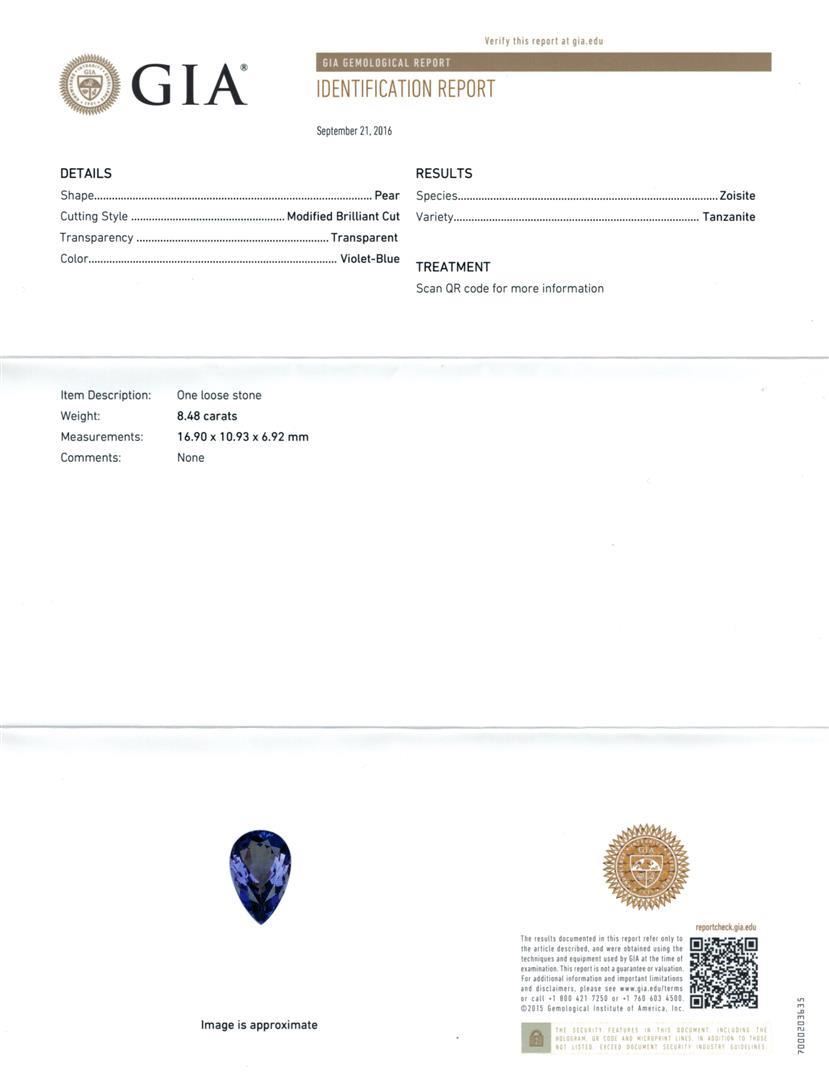One electronically tested 14KT white gold lady's cast fashion ring with a triple basket halo with a bright polish finish. The featured lady's ring has a shank measuring 3.26 millimeters wide. Identified with markings of 'K14'. Condition is new, good workmanship. Containing: One prong set pear modified brilliant cut natural tanzanite, measuring 16.90 x 10.93 x 6.92mm, (depth est.) approximate weight of 8.48ct., clarity is eye clean, medium, moderately strong, violetish blue color, (GIA vB 5/4), cut is very good. Transmitting light with no distortion, transparent. Colored gemstones are presumed to have been subjected to commonly used enhancement processes. Graded loose prior to setting in the GIA Laboratory, Report #1172847783. Nineteen prong set round brilliant cut diamonds, measuring 2.00 - 1.90 x 1.21mm (depth est.) approximate total weight of 19 Stones = 0.53ct. Graded in the setting. Clarity SI-1 to SI-2. Color: H - I Cut Good Thirty-Two prong set round brilliant cut diamonds, measuring 1.70 - 1.60 x 1.02mm (depth est.) approximate total weight of 32 Stones = 0.54ct. Graded in the setting. Clarity SI-1 to SI-2. Color: H - I Cut Good Sixty-Four prong set round brilliant cut diamonds, measuring 1.25 - 1.15 x 0.72mm (depth est.) approximate total weight of 64 Stones = 0.40ct. Graded in the setting. Clarity SI-1 to I-1. Color: H - I Cut Good. Total Weight of Colored Stones 8.48ct.. Total Weight of Diamonds 1.47ct.. Total Weight of Ring 12.90gm. GAS Appraised.