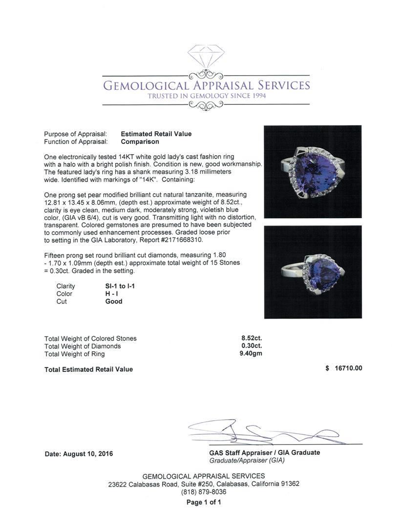 One electronically tested 14KT white gold lady's cast fashion ring with a halo with a bright polish finish. The featured lady's ring has a shank measuring 3.18 millimeters wide. Identified with markings of '14K'. Condition is new, good workmanship. Containing: One prong set pear modified brilliant cut natural tanzanite, measuring 12.81 x 13.45 x 8.06mm, (depth est.) approximate weight of 8.52ct., clarity is eye clean, medium dark, moderately strong, violetish blue color, (GIA vB 6/4), cut is very good. Transmitting light with no distortion, transparent. Colored gemstones are presumed to have been subjected to commonly used enhancement processes. Graded loose prior to setting in the GIA Laboratory, Report #2171668310. Fifteen prong set round brilliant cut diamonds, measuring 1.80 - 1.70 x 1.09mm (depth est.) approximate total weight of 15 Stones = 0.30ct. Graded in the setting. Clarity SI-1 to I-1. Color: H - I Cut Good. Total Weight of Colored Stones 8.52ct.. Total Weight of Diamonds 0.30ct.. Total Weight of Ring 9.40gm. GAS Appraised.
