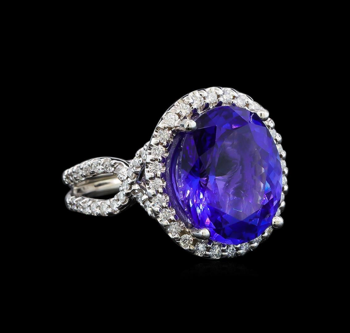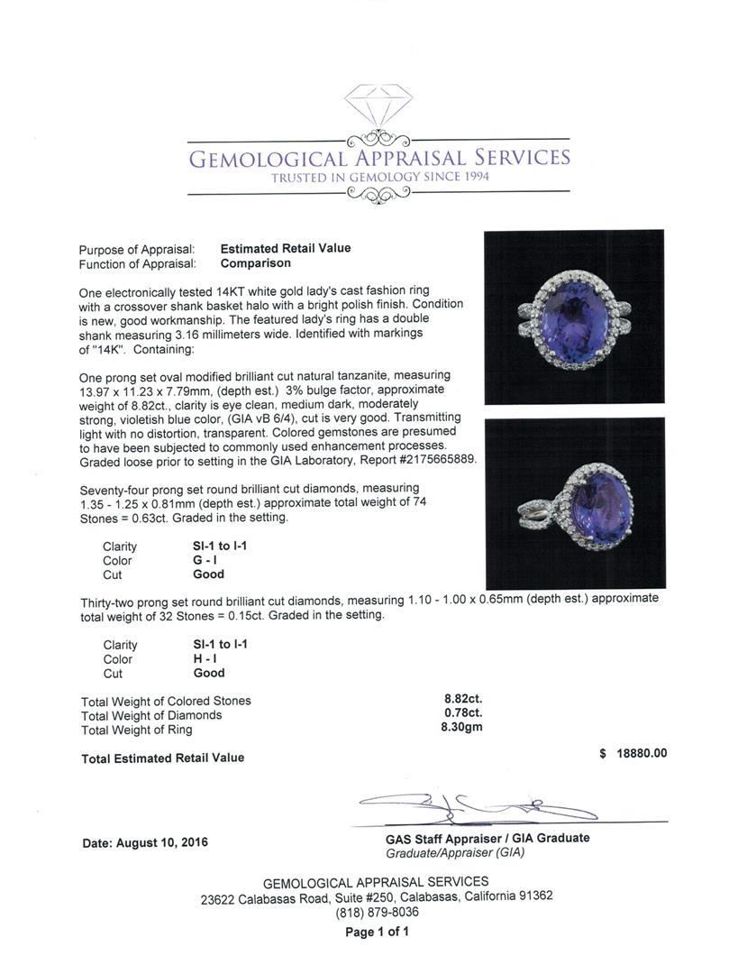 One electronically tested 14KT white gold lady's cast fashion ring with a crossover shank basket halo with a bright polish finish. The featured lady's ring has a double shank measuring 3.16 millimeters wide. Identified with markings of '14K'. Condition is new, good workmanship. Containing: One prong set oval modified brilliant cut natural tanzanite, measuring 13.97 x 11.23 x 7.79mm, (depth est.) 3%. bulge factor, approximate weight of 8.82ct., clarity is eye clean, medium dark, moderately strong, violetish blue color, (GIA vB 6/4), cut is very good. Transmitting light with no distortion, transparent. Colored gemstones are presumed to have been subjected to commonly used enhancement processes. Graded loose prior to setting in the GIA Laboratory, Report #2175665889. Seventy-Four prong set round brilliant cut diamonds, measuring 1.35 - 1.25 x 0.81mm (depth est.) approximate total weight of 74 Stones = 0.63ct. Graded in the setting. Clarity SI-1 to I-1. Color: G - I Cut Good Thirty-Two prong set round brilliant cut diamonds, measuring 1.10 - 1.00 x 0.65mm (depth est.) approximate total weight of 32 Stones = 0.15ct. Graded in the setting. Clarity SI-1 to I-1. Color: H - I Cut Good. Total Weight of Colored Stones 8.82ct.. Total Weight of Diamonds 0.78ct.. Total Weight of Ring 8.30gm. GAS Appraised.