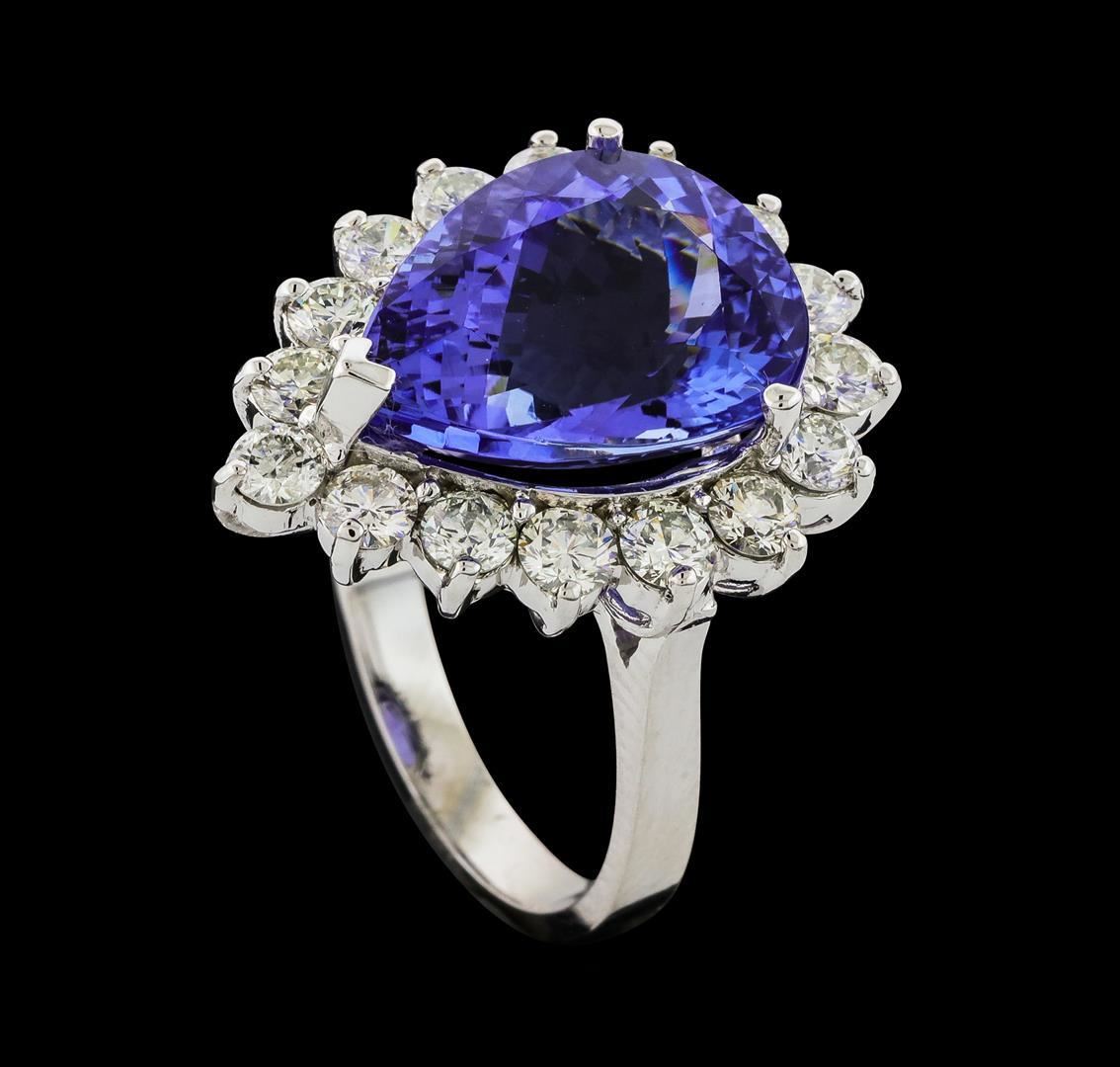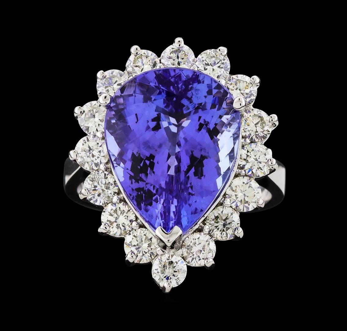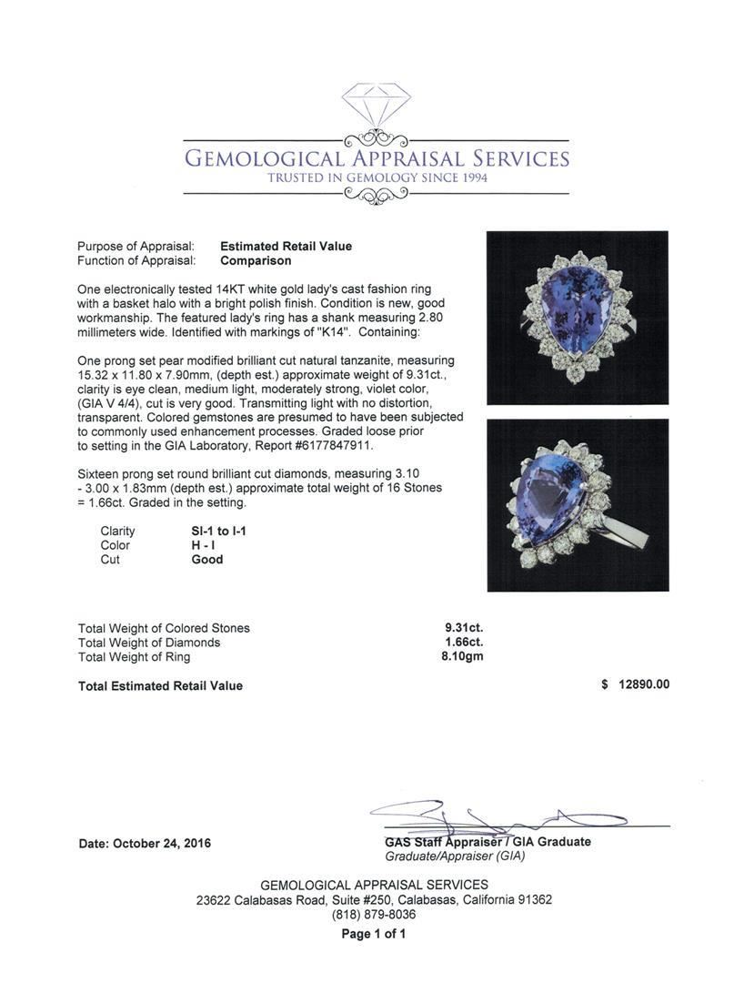 One electronically tested 14KT white gold lady's cast fashion ring with a basket halo with a bright polish finish. The featured lady's ring has a shank measuring 2.80 millimeters wide. Identified with markings of 'K14'. Condition is new, good workmanship. Containing: One prong set pear modified brilliant cut natural tanzanite, measuring 15.32 x 11.80 x 7.90mm, (depth est.) approximate weight of 9.31ct., clarity is eye clean, medium light, moderately strong, violet color, (GIA V 4/4), cut is very good. Transmitting light with no distortion, transparent. Colored gemstones are presumed to have been subjected to commonly used enhancement processes. Graded loose prior to setting in the GIA Laboratory, Report #6177847911. Sixteen prong set round brilliant cut diamonds, measuring 3.10 - 3.00 x 1.83mm (depth est.) approximate total weight of 16 Stones = 1.66ct. Graded in the setting. Clarity SI-1 to I-1. Color: H - I Cut Good. Total Weight of Colored Stones 9.31ct.. Total Weight of Diamonds 1.66ct.. Total Weight of Ring 8.10gm. GAS Appraised.
