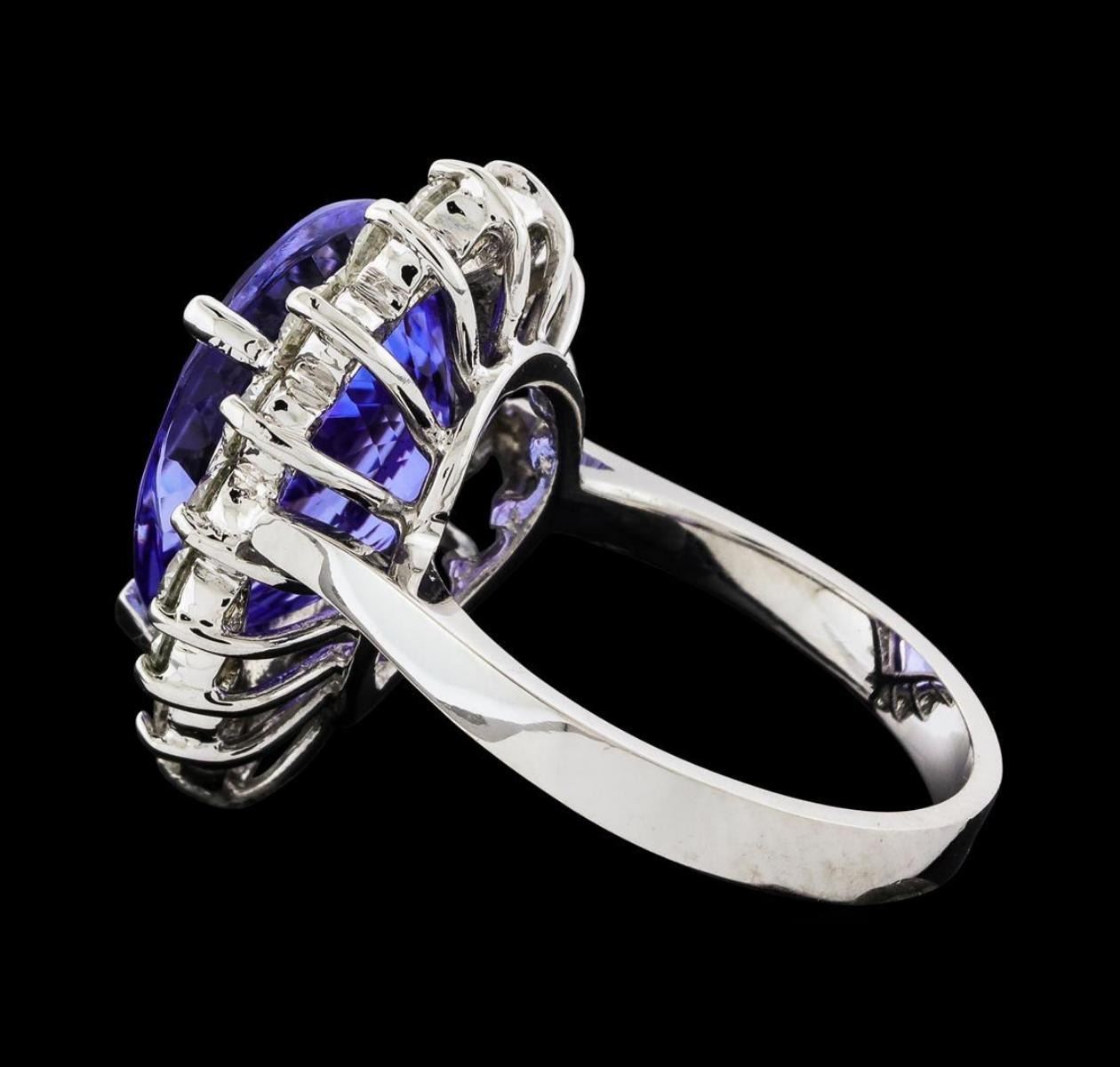 One electronically tested 14KT white gold lady's cast fashion ring with a basket halo with a bright polish finish. The featured lady's ring has a shank measuring 2.80 millimeters wide. Identified with markings of 'K14'. Condition is new, good workmanship. Containing: One prong set pear modified brilliant cut natural tanzanite, measuring 15.32 x 11.80 x 7.90mm, (depth est.) approximate weight of 9.31ct., clarity is eye clean, medium light, moderately strong, violet color, (GIA V 4/4), cut is very good. Transmitting light with no distortion, transparent. Colored gemstones are presumed to have been subjected to commonly used enhancement processes. Graded loose prior to setting in the GIA Laboratory, Report #6177847911. Sixteen prong set round brilliant cut diamonds, measuring 3.10 - 3.00 x 1.83mm (depth est.) approximate total weight of 16 Stones = 1.66ct. Graded in the setting. Clarity SI-1 to I-1. Color: H - I Cut Good. Total Weight of Colored Stones 9.31ct.. Total Weight of Diamonds 1.66ct.. Total Weight of Ring 8.10gm. GAS Appraised.
